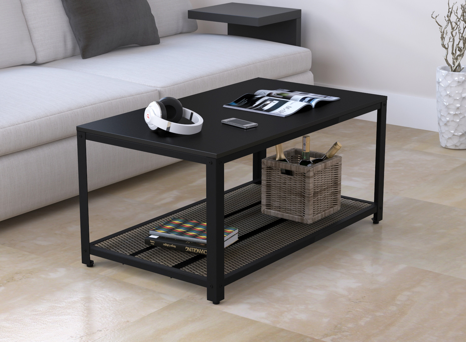 Стиль лофт передбачає використання в інтер'єрі навмисне простих і грубих предметів меблів. Однак кожен стиль роблять деталі. Одна з таких деталей — журнальний стіл. Текстура ДСП під дерево, каркас із сталі холодного прокату, полиця із металевої сітки — такий лаконічний і простий дизайн якнайкраще відповідає стильовим вимогам. Ще одна ознака сучасного міського стилю — строга геометрія, гранично проста, без надмірностей. Цей функціональний предмет інтер'єру дозволить вам тримати газети та журнали в повному порядку та одночасно послужить прикрасою кімнати. Можна використовувати як кавовий столик. Підібравши м'які меблі, що підходять за стилем, можна оформити прекрасну зону відпочинку.