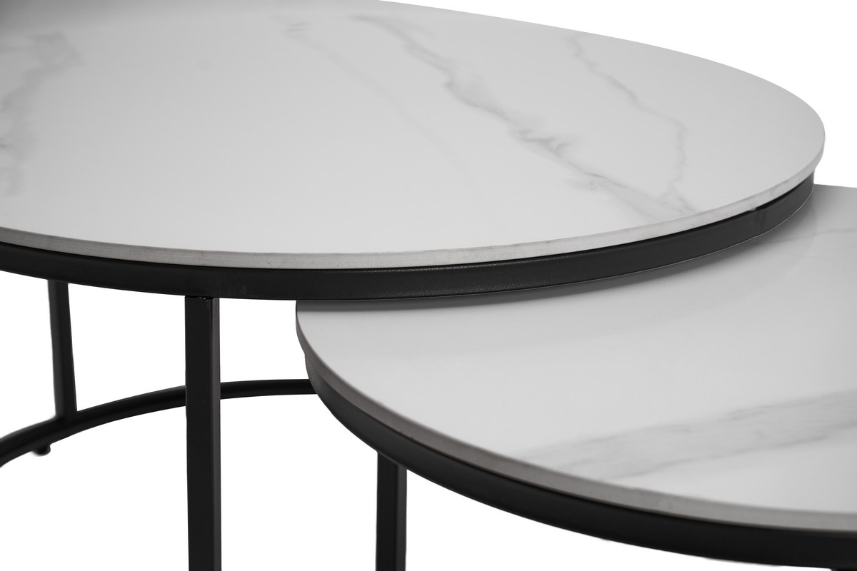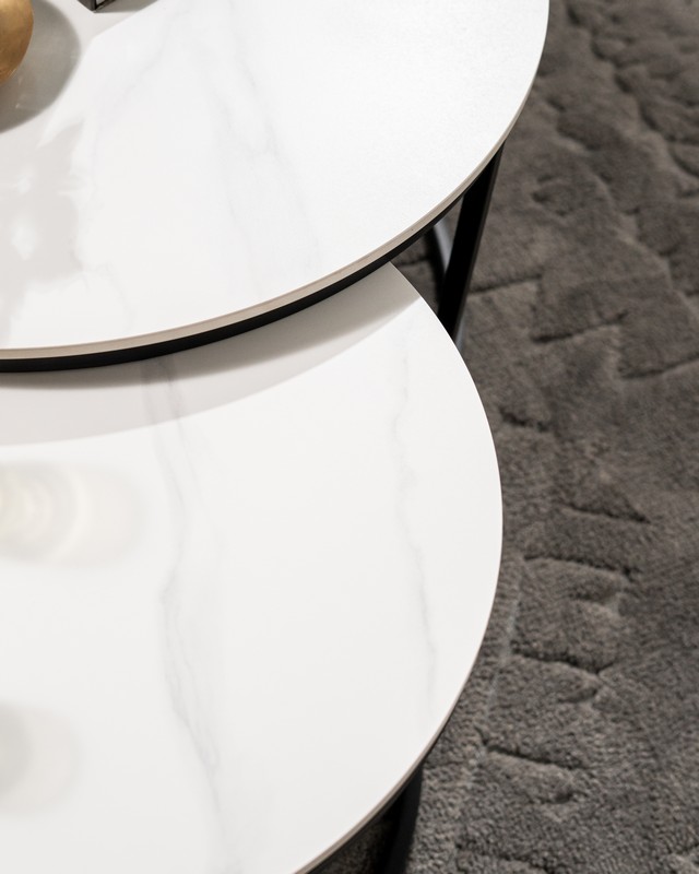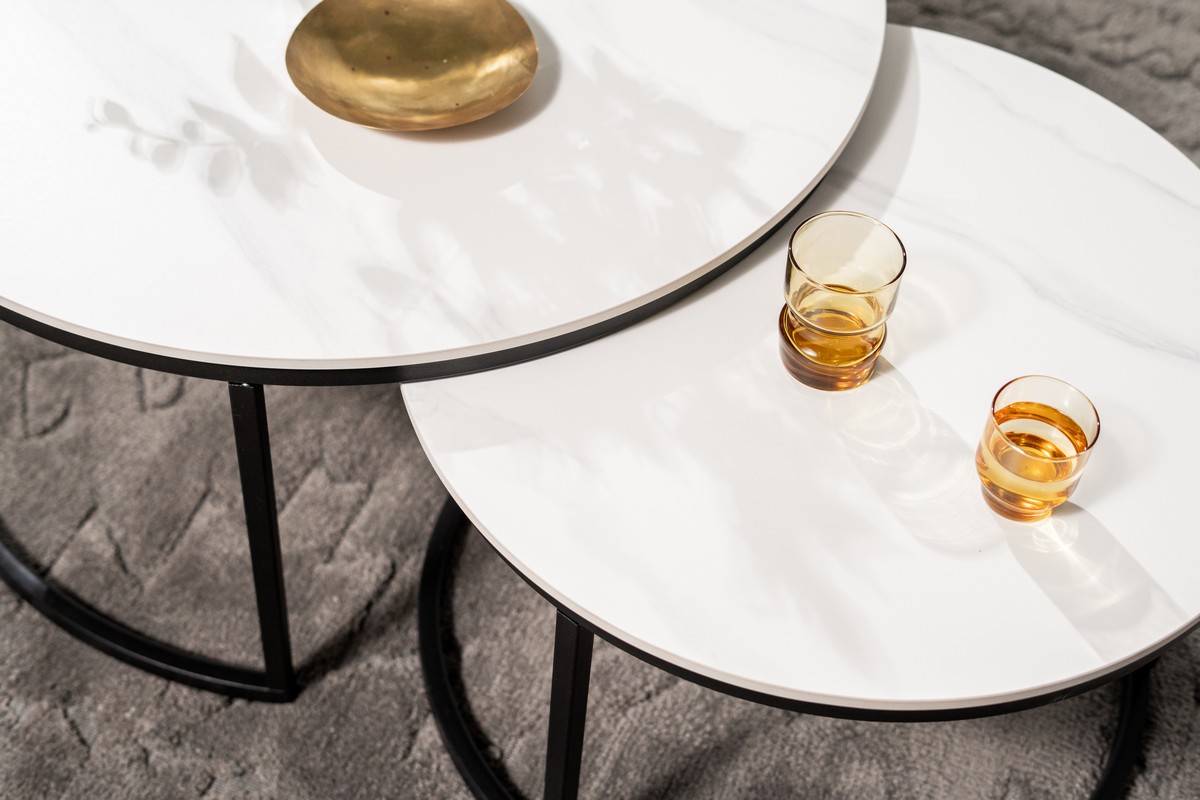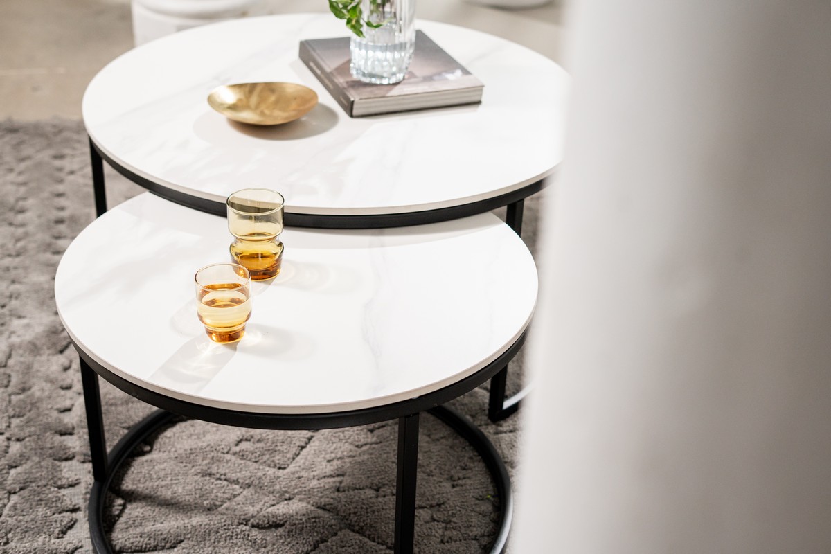 Кругла форма столів додає м'якості простору, створюючи гармонійний і збалансований інтер'єр. Основа з фарбованого металу чорного кольору додає контрастності та міцності, роблячи ці столи не лише функціональними, але й стильними елементами декору.