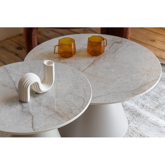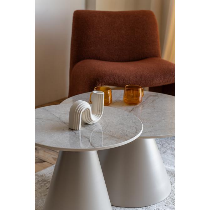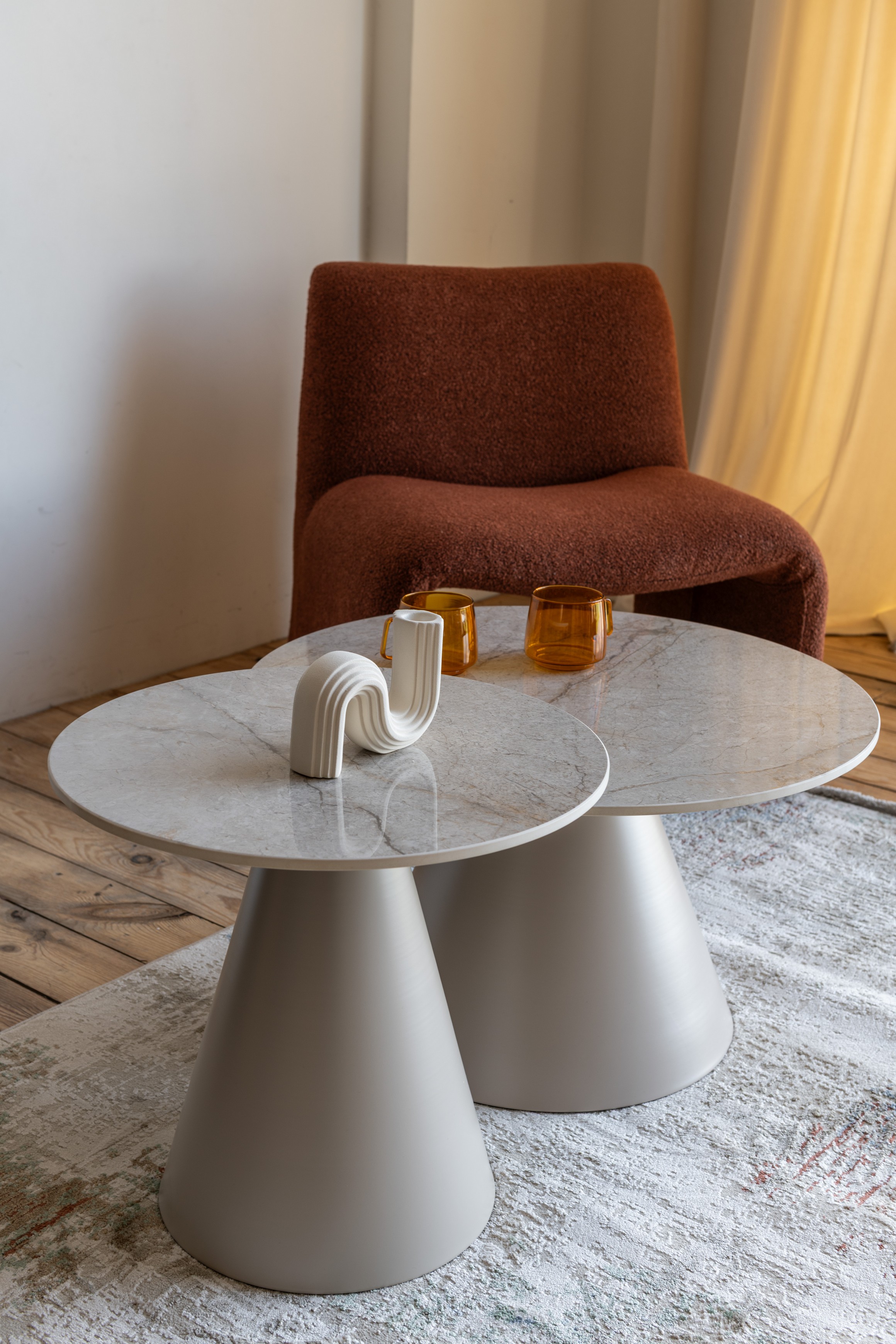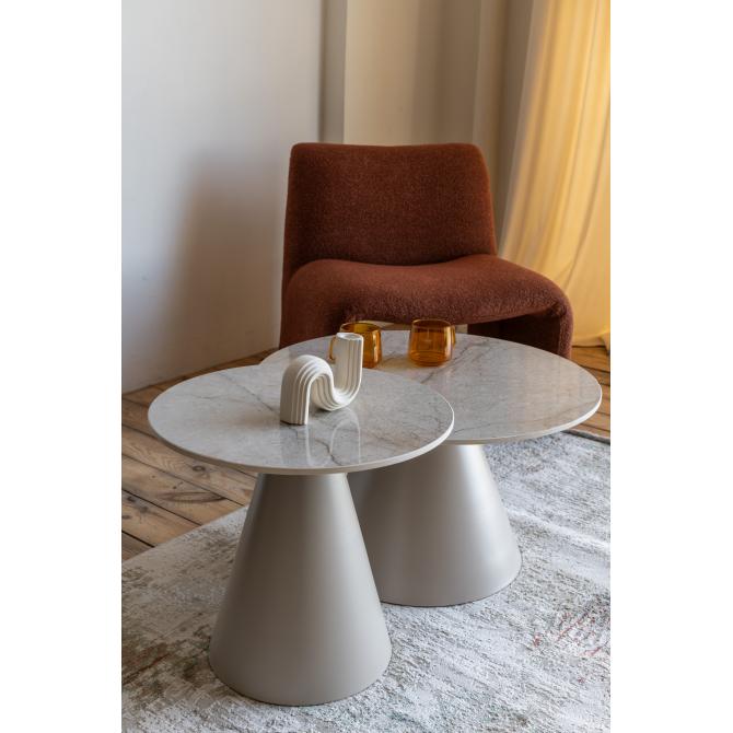 Стільниці виготовлені з глянцевої кераміки в елегантному відтінку містік грей, що надає виробу розкішного вигляду та забезпечує довговічність і простоту в догляді. Металева основа, пофарбована в колір капучино, додає стійкості та гармонійно поєднується із загальним дизайном. Завдяки поєднанню естетики та практичності, цей комплект стане стильним акцентом у вітальні, зоні відпочинку або офісі.