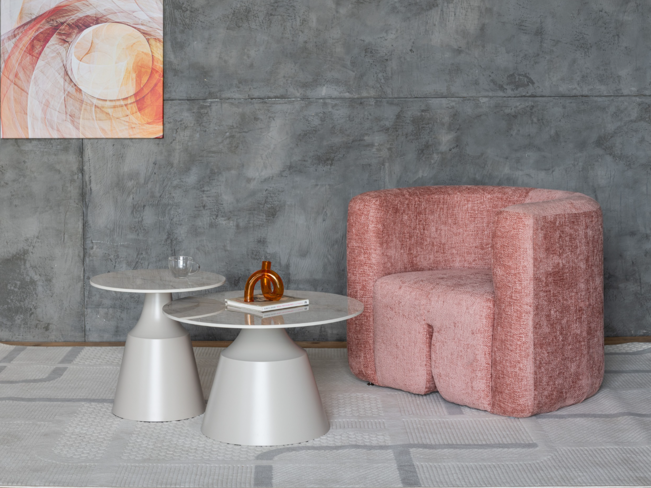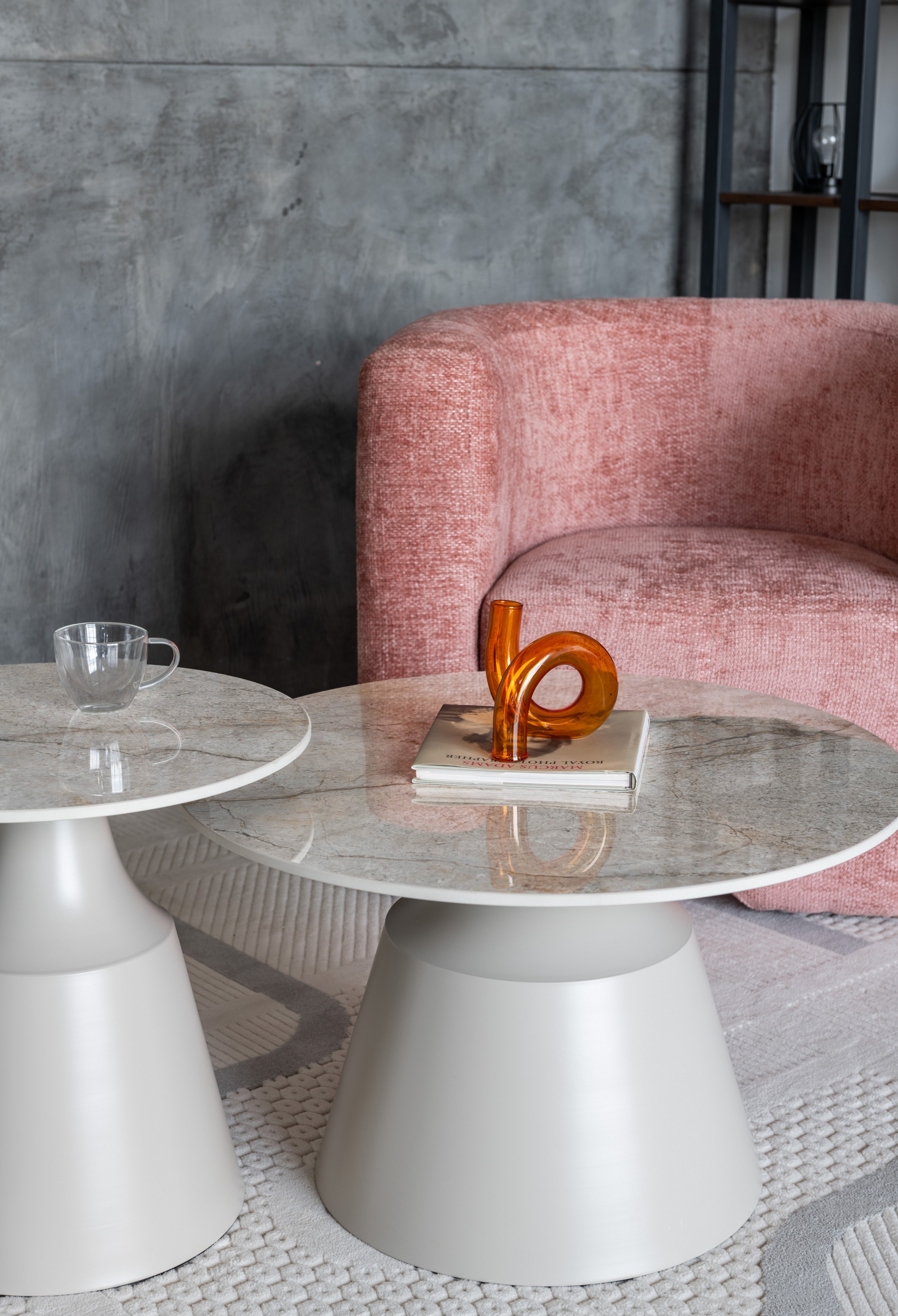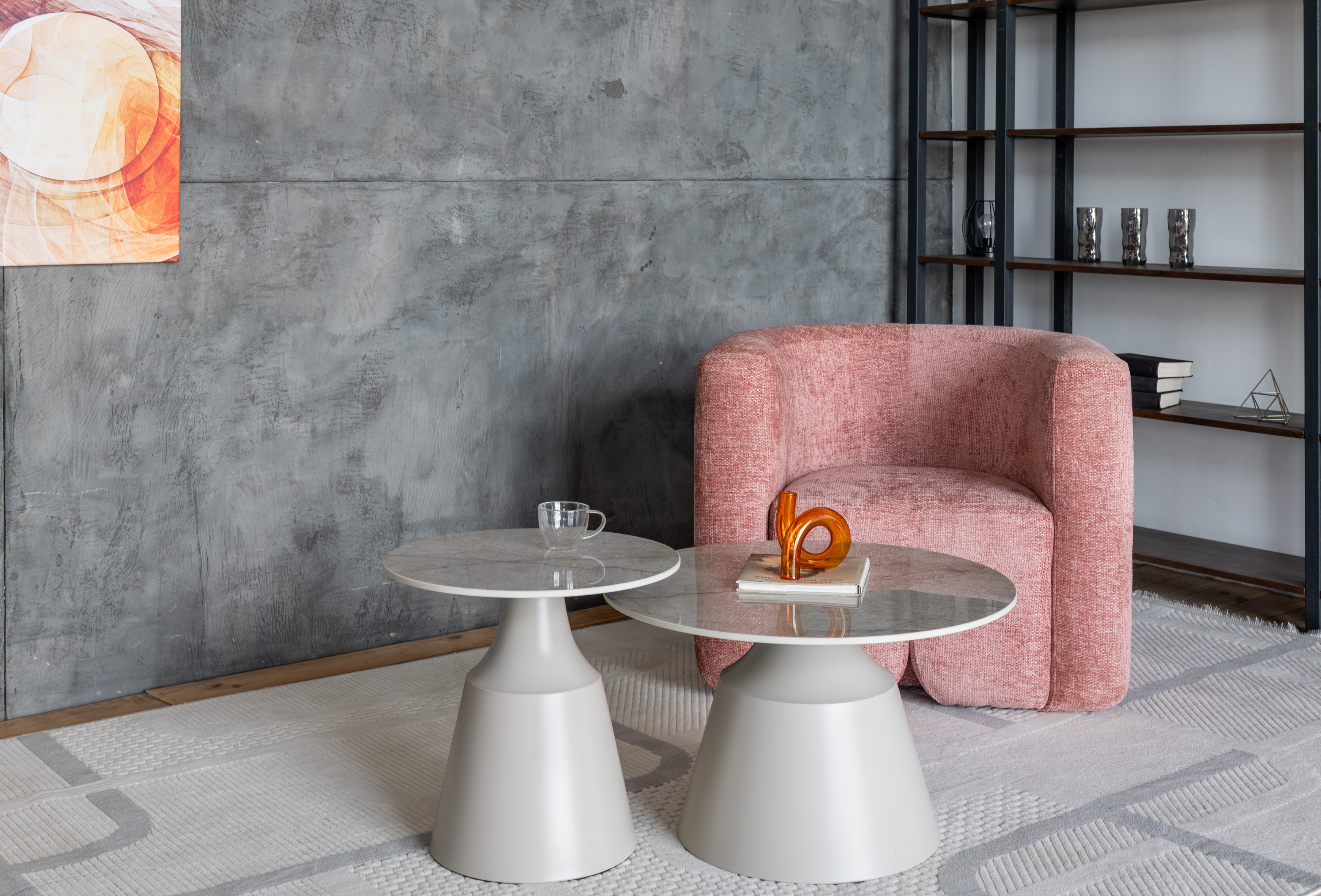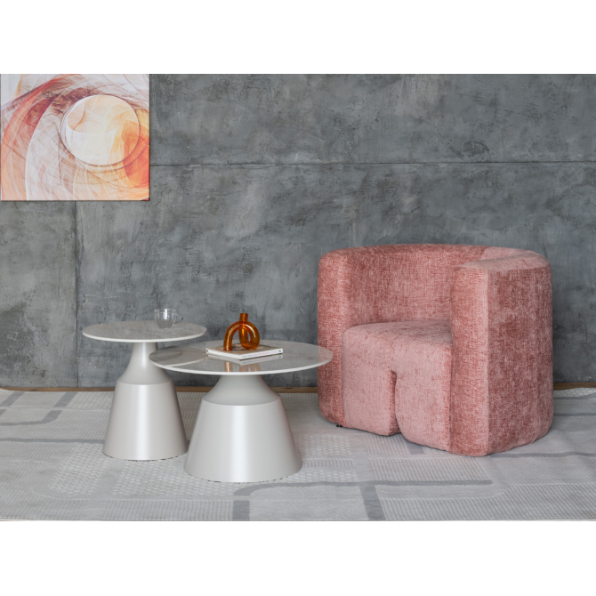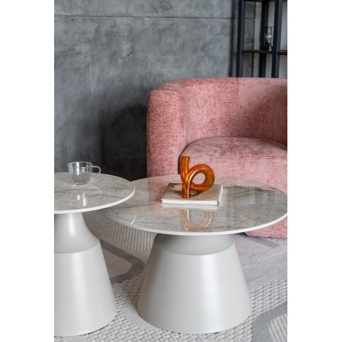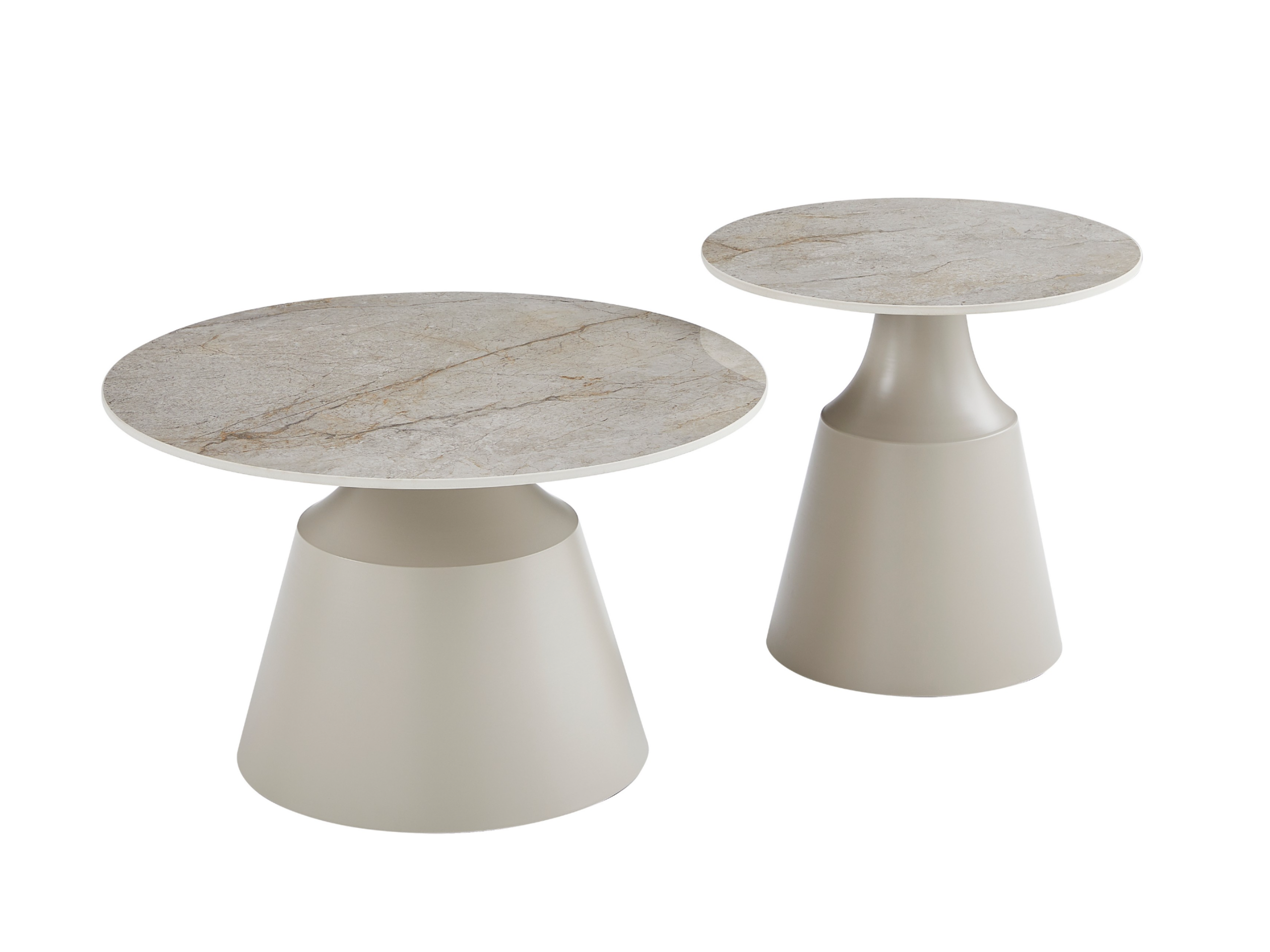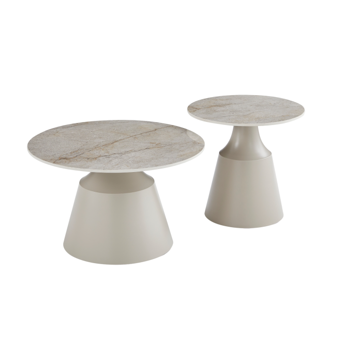 Стільниці виготовлені з глянцевої кераміки в елегантному відтінку містік грей, що надає комплекту витонченого вигляду, а також забезпечує стійкість до вологи та легкість у догляді. Металева основа, пофарбована у ніжний колір капучино, додає конструкції стабільності та підкреслює сучасний дизайн.