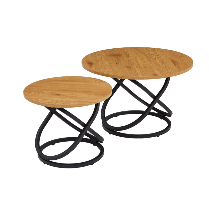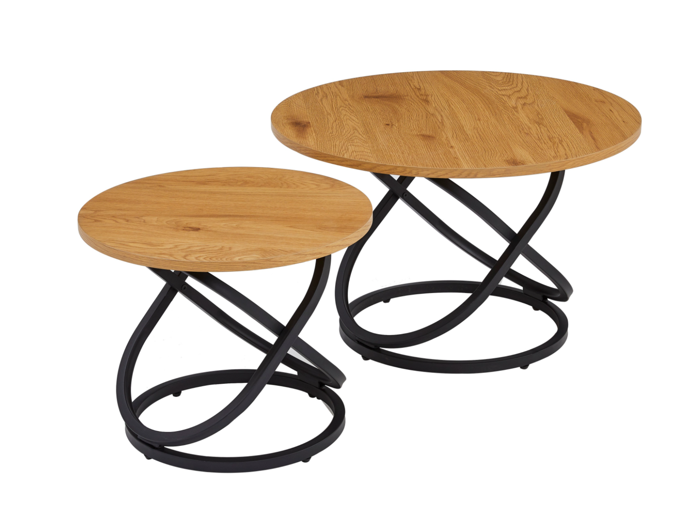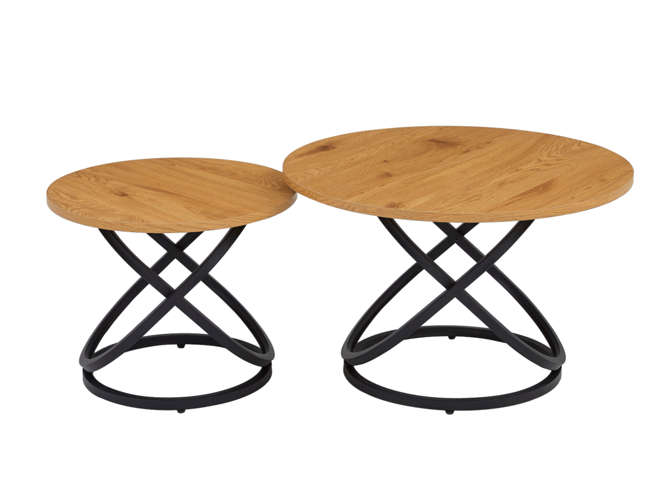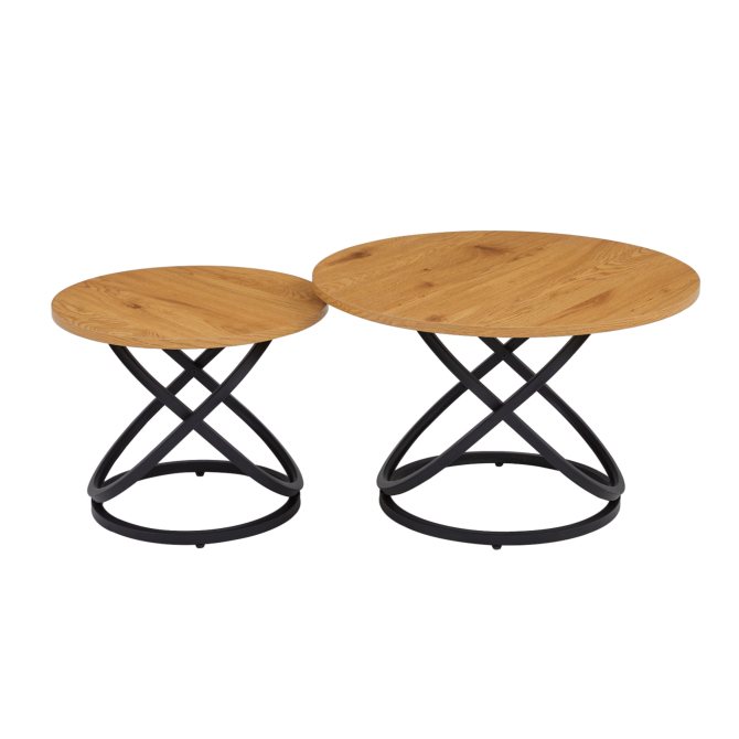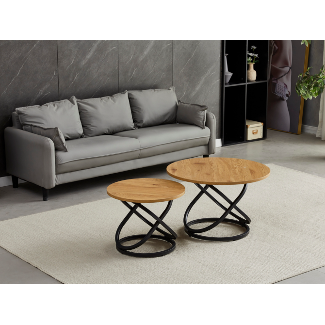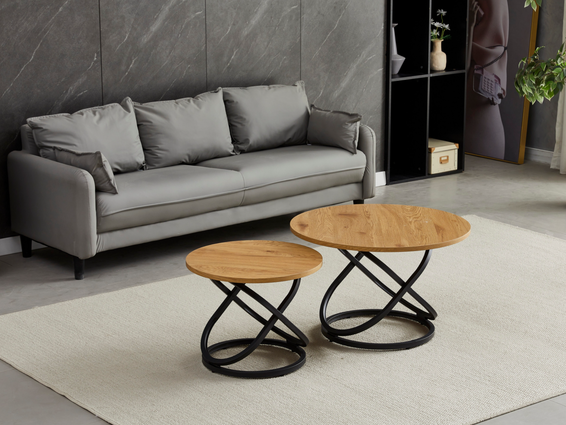 Ламіноване МДФ із реалістичним деревним малюнком приємне на дотик і стійке до щоденного використання. Металеві ніжки з матовим покриттям не тільки доповнюють образ, а й забезпечують конструкції надійність. Завдяки різній висоті столів їх легко компонувати разом або використовувати окремо — як журнальні, кавові чи декоративні.