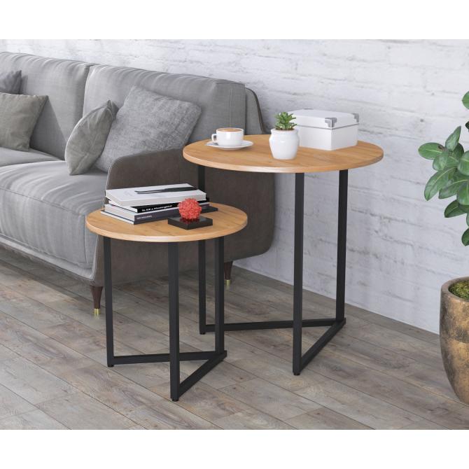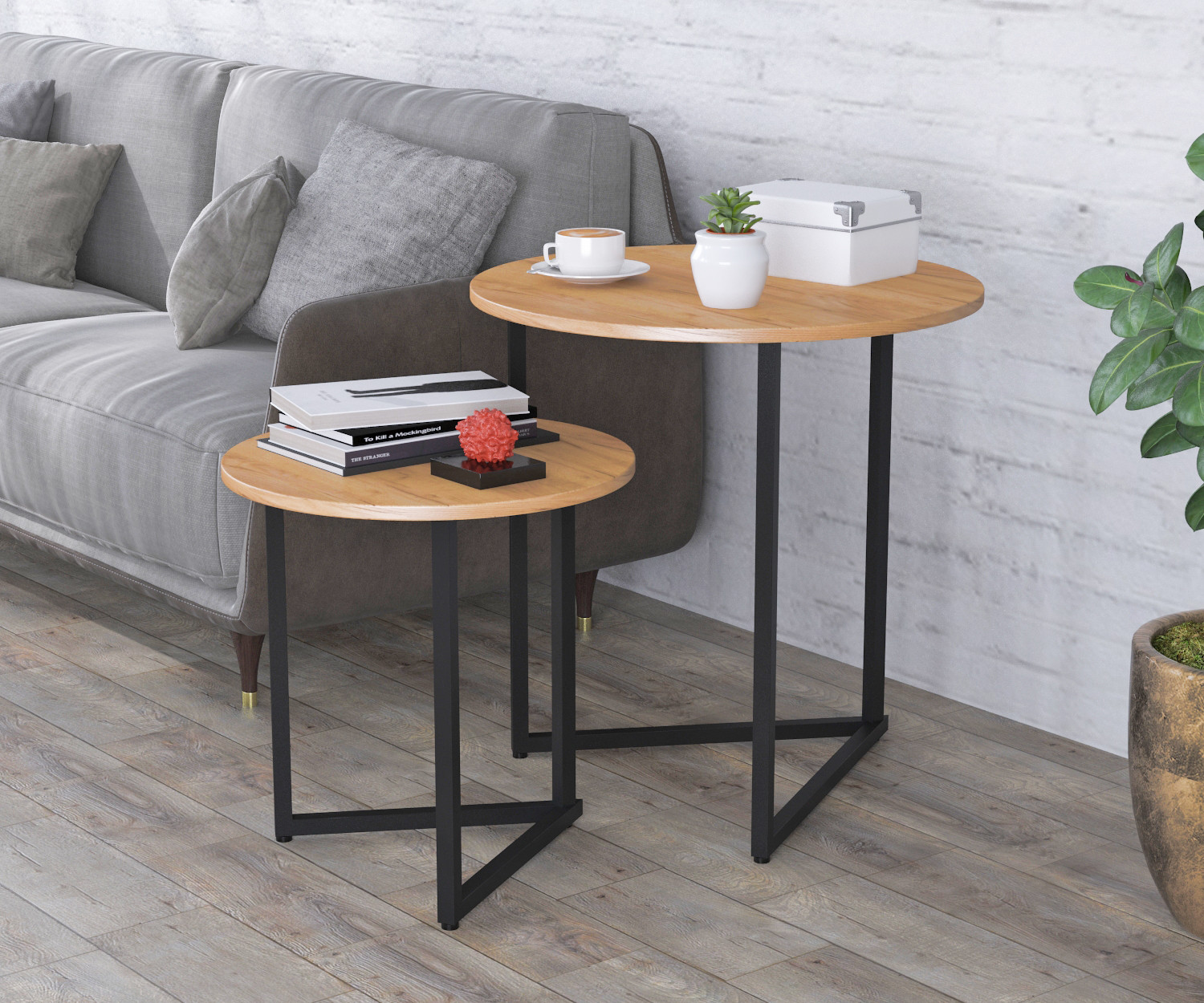 Каркас столиків виготовлено з металевих труб товщиною 20х20 мм. Метал пофарбований у чорний колір, методом порошкового напилення. Завдяки такому покриттю поверхня металу має більш естетичний вигляд і тривалий термін служби. В основі встановлені регульовані ніжки. Вони дадуть змогу компенсувати всі нерівності поверхні, а також захистять від виникнення подряпин і потертостей на поверхні підлоги. Стільниці виготовлені з якісного ЛДСП товщиною 18 мм. Діаметр більшого столу 48 см, а висота 57см. Діаметр меншого столу 35 см, а висота 45 см. З представлених кольорів ЛДСП ви зможете вибрати саме той, який підійде під ваш інтер'єр. Вироби виготовлені з якісного металу та ЛДСП. Рекомендуємо вберігати журнальні столики від вологи і високих температур, щоб вони довгий час зберігали свій первинний зовнішній вигляд.