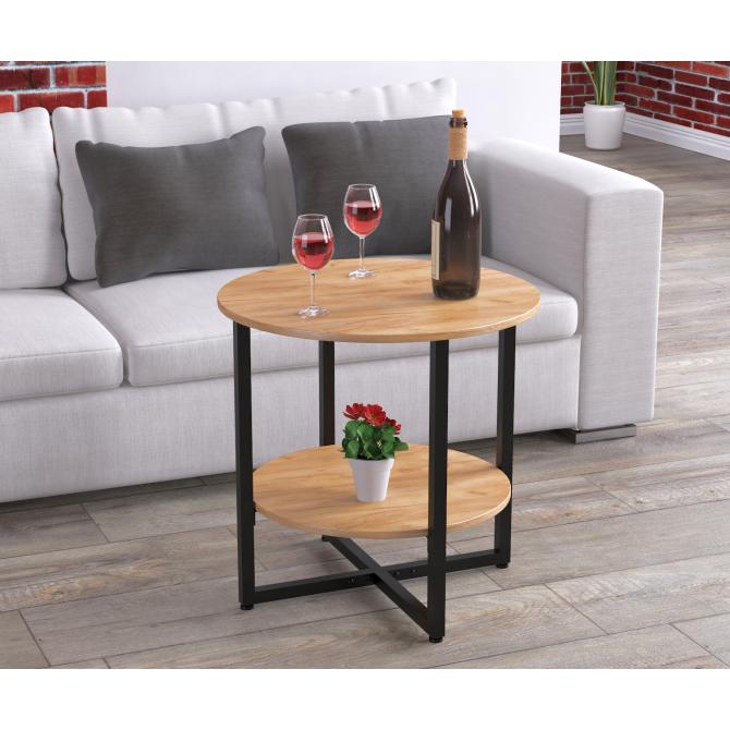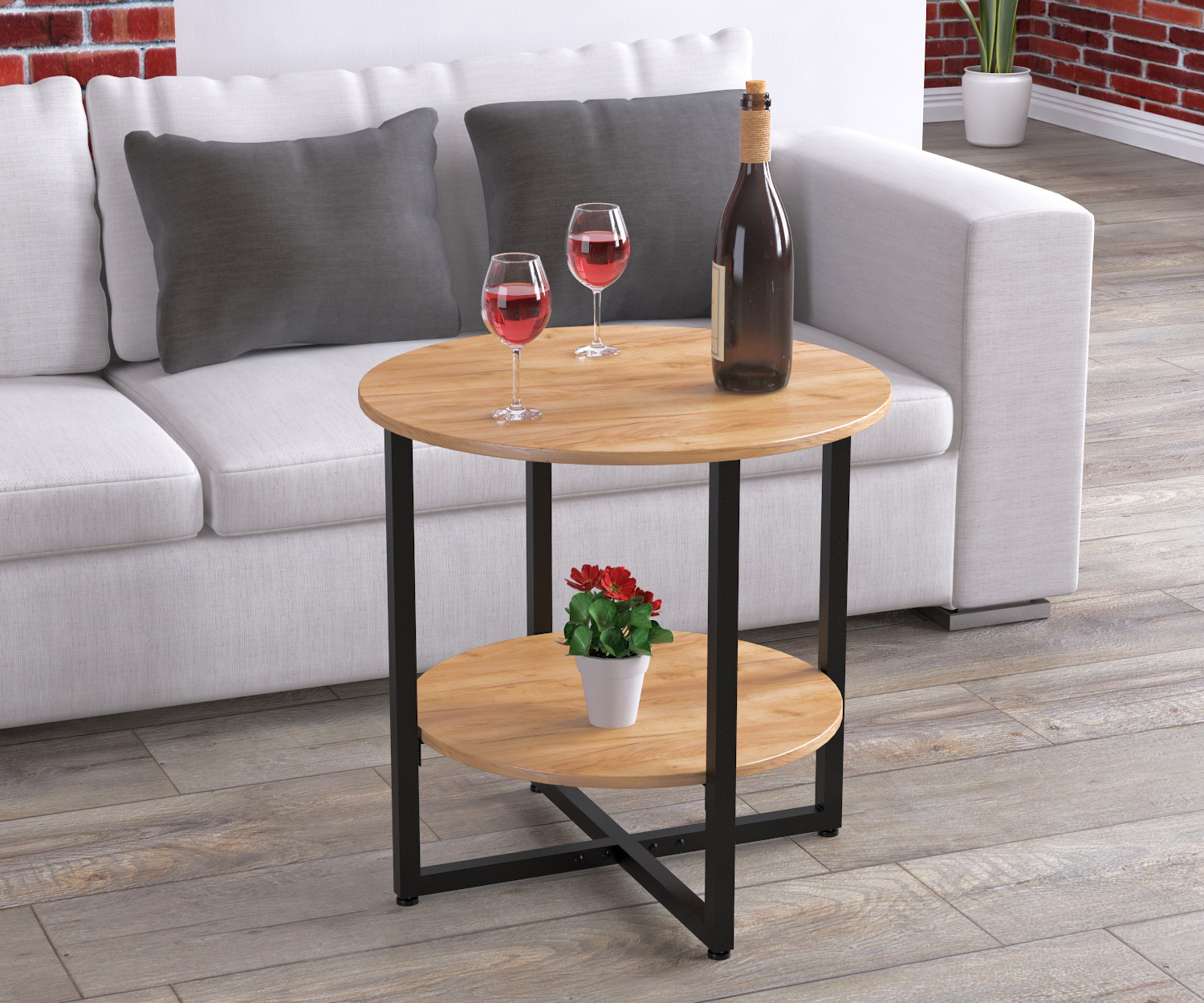 Столик складається з розбірного металевого каркаса, стільниці та нижньої полиці. Основа виготовлена з металевих труб 20х20 мм. Метал пофарбований у чорний колір, методом порошкового напилення. Завдяки такому покриттю поверхня металу має більш естетичний вигляд і тривалий термін служби. В основі встановлені регульовані ніжки. Вони дадуть змогу компенсувати всі нерівності поверхні, а також захистять від виникнення подряпин і потертостей на поверхні підлоги. Стільниці виготовлені з ЛДСП завтовшки 18 мм. З представлених кольорів ЛДСП ви зможете вибрати саме той, який підійде під ваш інтер'єр. Для створення журнального столика використовували якісні та міцні матеріали. Рекомендуємо вберігати журнальний столик від вологи і високих температур, щоб він довгий час зберігав свій первинний зовнішній вигляд.