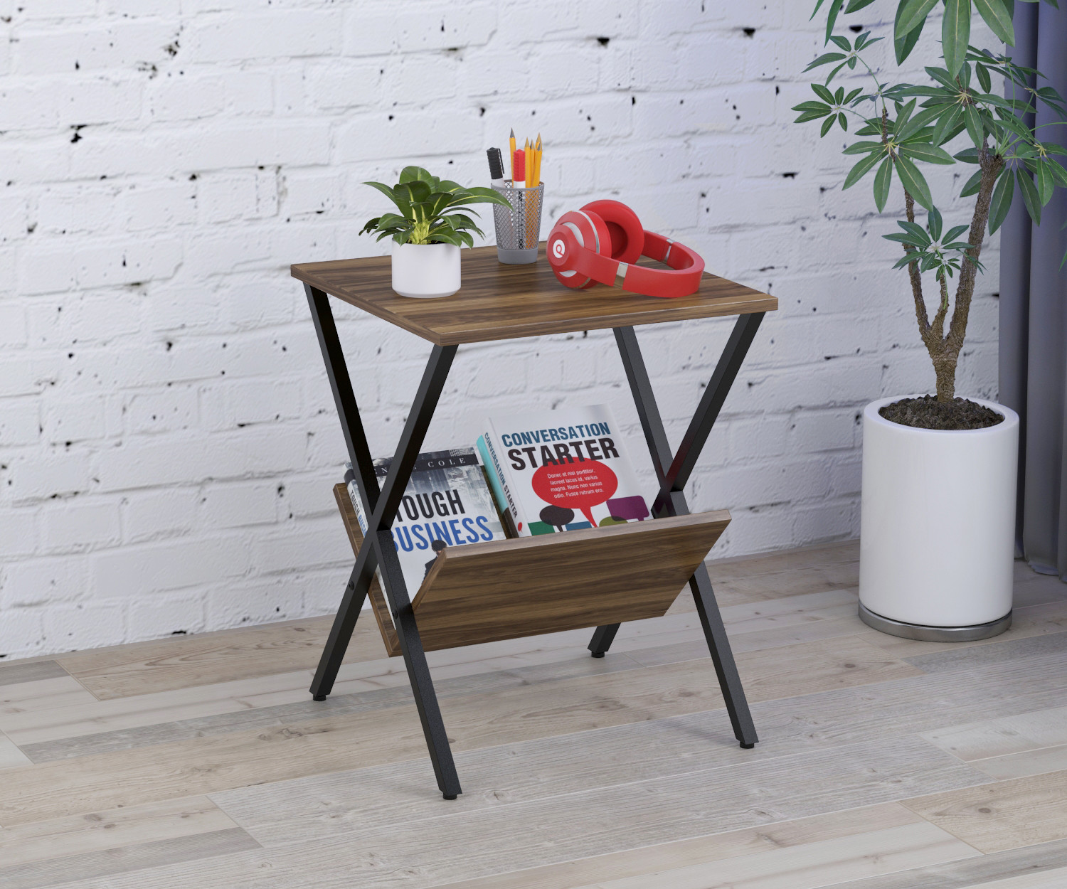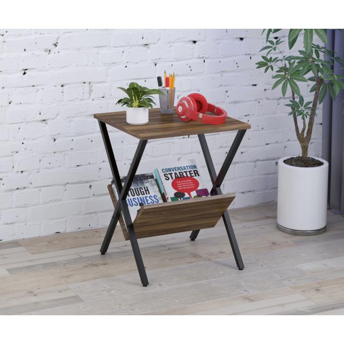 Столик складається з розбірного металевого каркаса, стільниці та нижньої полиці. Основа виготовлена з металевих труб 20х20 мм. Метал пофарбований у чорний колір, методом порошкового напилення. Завдяки такому покриттю поверхня металу має більш естетичний вигляд і тривалий термін служби. В основі встановлені регульовані ніжки. Вони дадуть змогу компенсувати всі нерівності поверхні, а також захистять від виникнення подряпин і потертостей на поверхні підлоги. Стільниці виготовлені з якісного, міцного й естетично привабливого ЛДСП. Основна верхня стільниця пряма, квадратної форми. Внизу поличка V-подібна, для зберігання журналів, книг та іншої друкованої продукції. З представлених кольорів ЛДСП ви зможете вибрати саме той, який підійде під ваш інтер'єр. Рекомендуємо вберігати журнальний столик від вологи і високих температур, щоб він довгий час зберігав свій первинний зовнішній вигляд.