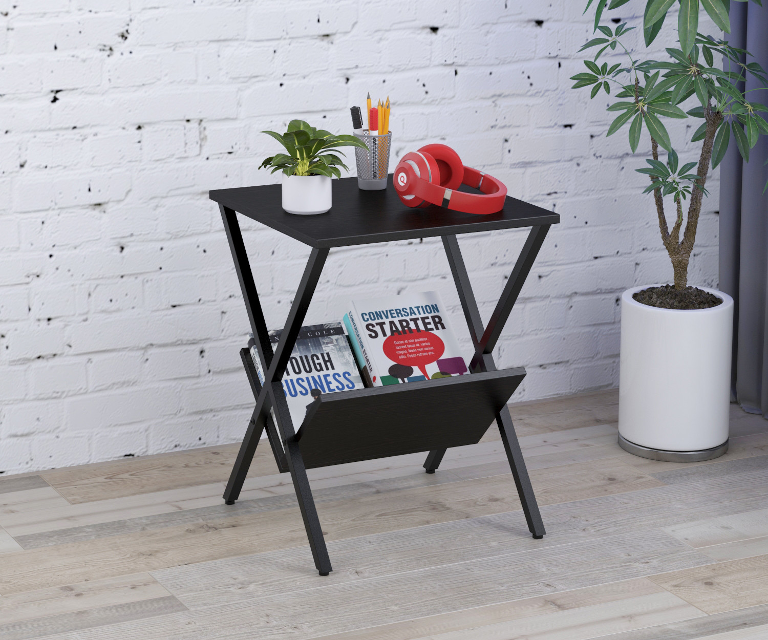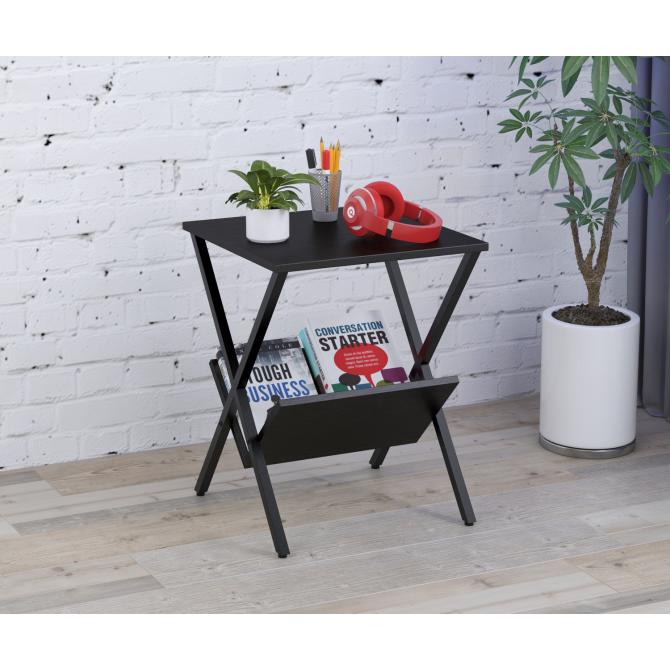 Столик складається з розбірного металевого каркаса, стільниці та нижньої полиці. Основа виготовлена з металевих труб 20х20 мм. Метал пофарбований у чорний колір, методом порошкового напилення. Завдяки такому покриттю поверхня металу має більш естетичний вигляд і тривалий термін служби. В основі встановлені регульовані ніжки. Вони дадуть змогу компенсувати всі нерівності поверхні, а також захистять від виникнення подряпин і потертостей на поверхні підлоги. Стільниці виготовлені з якісного, міцного й естетично привабливого ЛДСП. Основна верхня стільниця пряма, квадратної форми. Внизу поличка V-подібна, для зберігання журналів, книг та іншої друкованої продукції. З представлених кольорів ЛДСП ви зможете вибрати саме той, який підійде під ваш інтер'єр. Рекомендуємо вберігати журнальний столик від вологи і високих температур, щоб він довгий час зберігав свій первинний зовнішній вигляд.