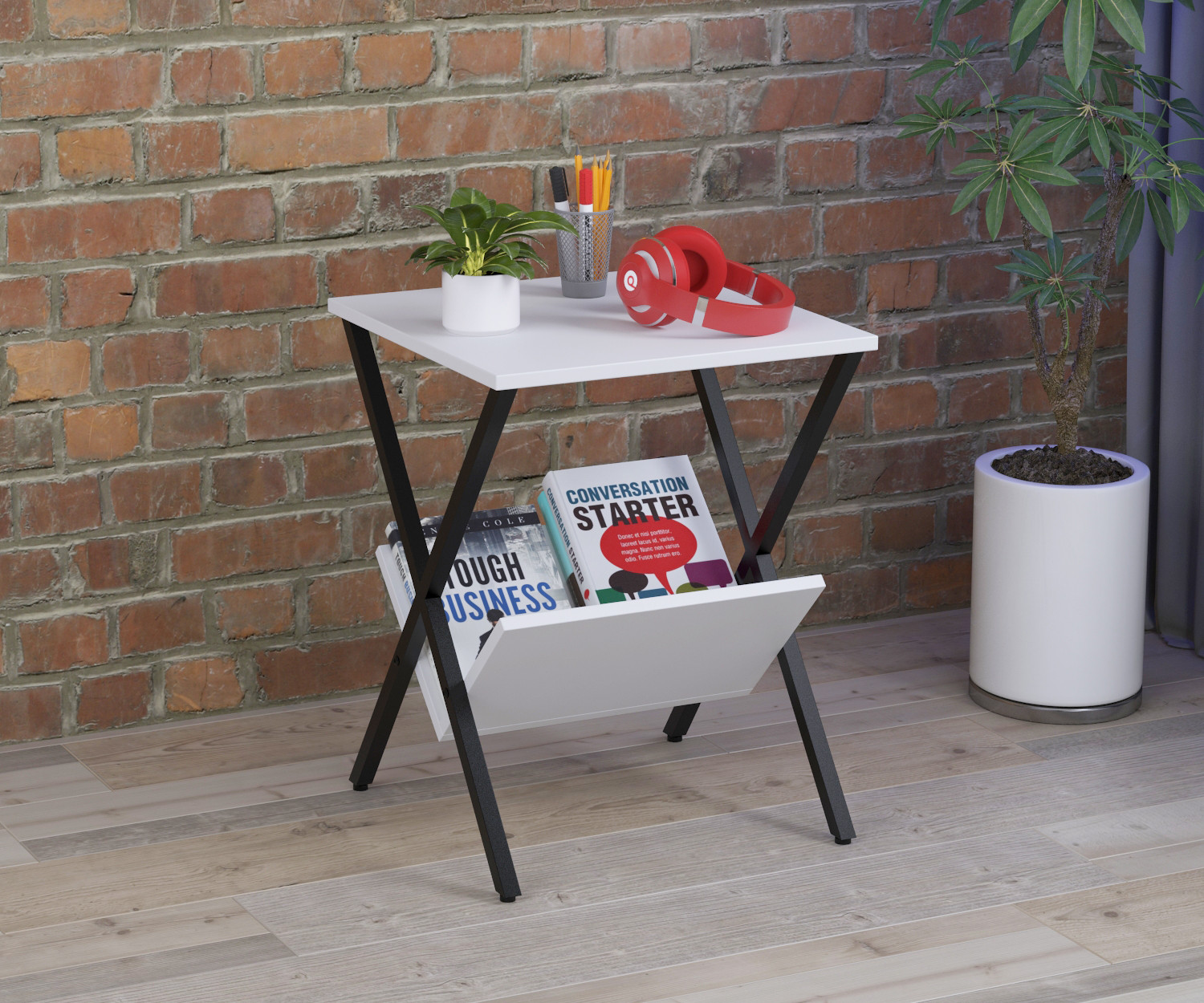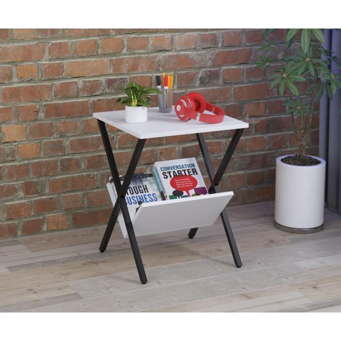 Столик складається з розбірного металевого каркаса, стільниці та нижньої полиці. Основа виготовлена з металевих труб 20х20 мм. Метал пофарбований у чорний колір, методом порошкового напилення. Завдяки такому покриттю поверхня металу має більш естетичний вигляд і тривалий термін служби. В основі встановлені регульовані ніжки. Вони дадуть змогу компенсувати всі нерівності поверхні, а також захистять від виникнення подряпин і потертостей на поверхні підлоги. Стільниці виготовлені з якісного, міцного й естетично привабливого ЛДСП. Основна верхня стільниця пряма, квадратної форми. Внизу поличка V-подібна, для зберігання журналів, книг та іншої друкованої продукції. З представлених кольорів ЛДСП ви зможете вибрати саме той, який підійде під ваш інтер'єр. Рекомендуємо вберігати журнальний столик від вологи і високих температур, щоб він довгий час зберігав свій первинний зовнішній вигляд.