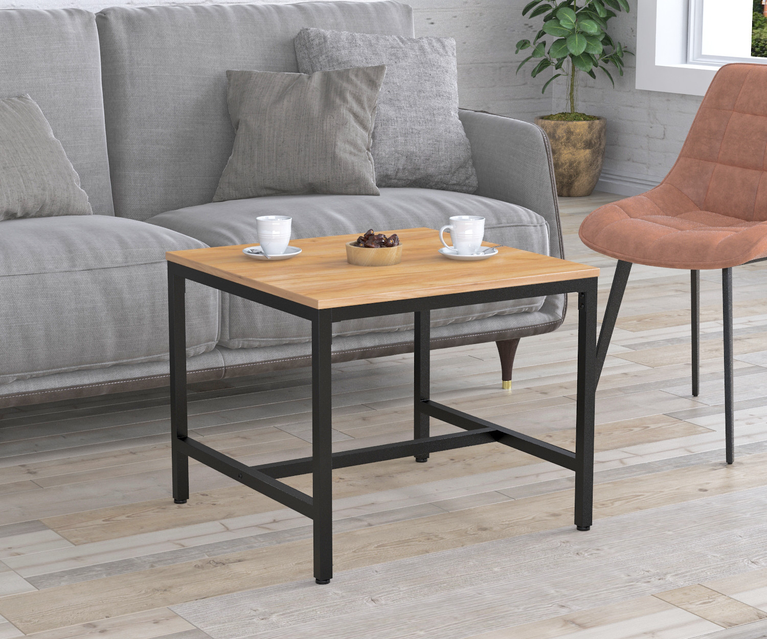 Каркас виготовлено з металевих труб товщиною 25х25 мм. Метал пофарбовано в чорний колір методом порошкового напилення. Завдяки такому покриттю поверхня металу має більш естетичний вигляд і тривалий термін служби. В основі встановлені регульовані ніжки. Вони дадуть змогу компенсувати всі нерівності поверхні, а також захистять від виникнення подряпин і потертостей на поверхні підлоги. Стільниця виготовлена з якісного ЛДСП. З представлених кольорів ви зможете вибрати саме той, який підійде під ваш інтер'єр. На стільниці можна розмістити частування, ноутбук для роботи, чашку кави та інші предмети.