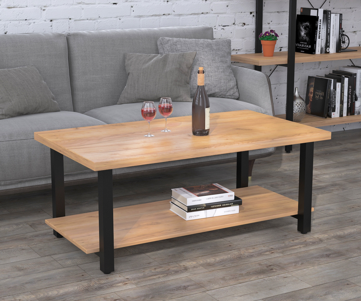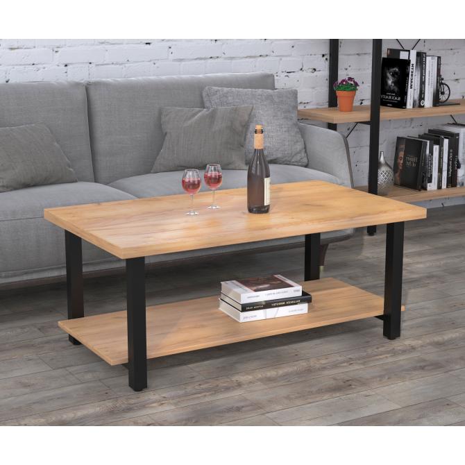 Столик складається з двох суцільнозварних опор, стільниці та нижньої полиці. Опори виготовлені з металевих труб товщиною 40х40 мм. Метал пофарбовано в чорний колір методом порошкового напилення. Завдяки такому покриттю поверхня металу має більш естетичний вигляд і тривалий термін служби. В основі встановлені регульовані ніжки. Вони дадуть змогу компенсувати всі нерівності поверхні, а також захистять від виникнення подряпин і потертостей на поверхні підлоги. Стільниця виготовлена з якісного і міцного ЛДСП товщиною 36 мм. Нижня поличка має товщину в 18 мм. З представлених кольорів ЛДСП ви зможете вибрати саме той, який підійде під ваш інтер'єр. Столик завдяки своїй конструкції може витримувати велике навантаження. Рекомендуємо вберігати журнальний столик від вологи і високих температур, щоб він довгий час зберігав свій первинний зовнішній вигляд.