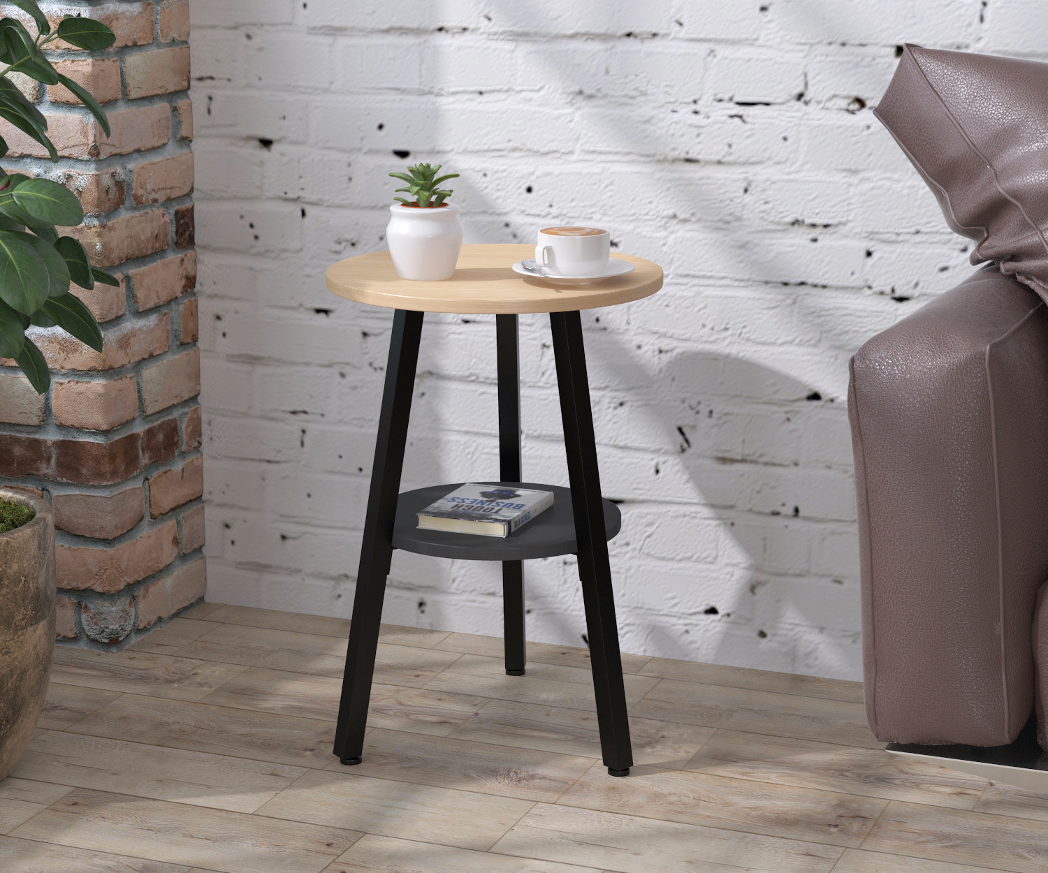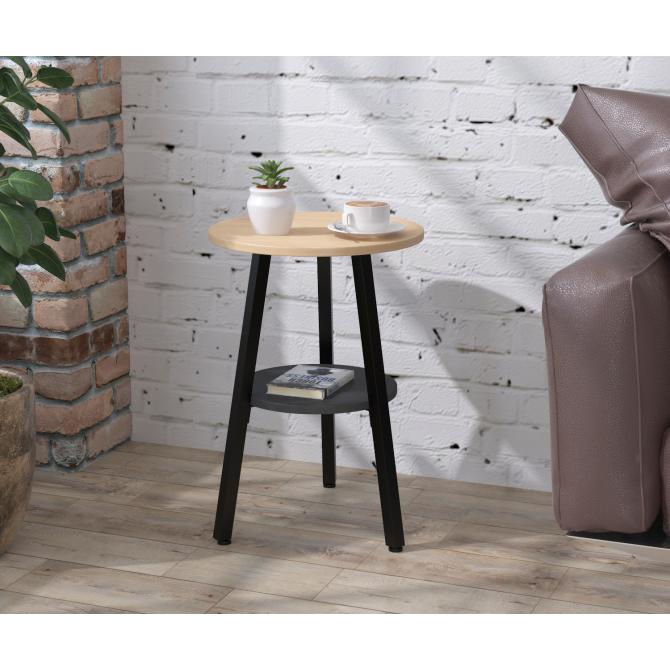 Столик виготовлений із трьох металевих опор, стільниці та нижньої полиці. Опори - це металеві труби товщиною 25х25 мм. Метал пофарбований у чорний колір, методом порошкового напилення. Завдяки такому покриттю поверхня металу має більш естетичний вигляд і тривалий термін служби. В основі встановлені регульовані ніжки. Вони дадуть змогу компенсувати всі нерівності поверхні, а також захистять від виникнення подряпин і потертостей на поверхні підлоги. Стільниці виготовлені з ЛДСП товщиною 18 мм. Діаметр верхньої стільниці становить 40 см, а нижньої 30 см. Нижня поличка оформлена в кольорі антрацит. З представлених кольорів ЛДСП ви зможете вибрати саме той, який підійде під ваш інтер'єр. Для створення журнального столика використовували якісні та міцні матеріали. Рекомендуємо вберігати журнальний столик від вологи і високих температур, щоб він довгий час зберігав свій первинний зовнішній вигляд.