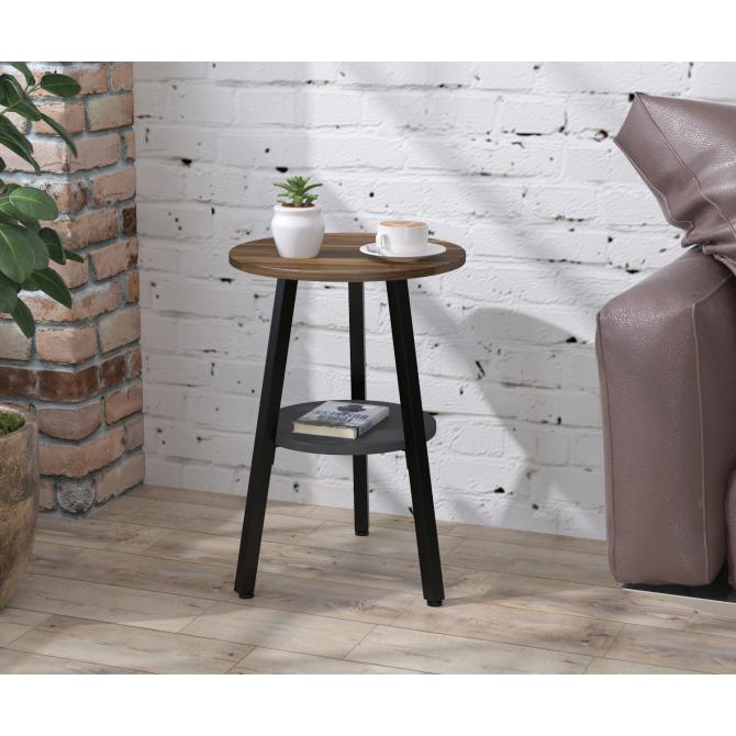 Столик виготовлений із трьох металевих опор, стільниці та нижньої полиці. Опори - це металеві труби товщиною 25х25 мм. Метал пофарбований у чорний колір, методом порошкового напилення. Завдяки такому покриттю поверхня металу має більш естетичний вигляд і тривалий термін служби. В основі встановлені регульовані ніжки. Вони дадуть змогу компенсувати всі нерівності поверхні, а також захистять від виникнення подряпин і потертостей на поверхні підлоги. Стільниці виготовлені з ЛДСП товщиною 18 мм. Діаметр верхньої стільниці становить 40 см, а нижньої 30 см. Нижня поличка оформлена в кольорі антрацит. З представлених кольорів ЛДСП ви зможете вибрати саме той, який підійде під ваш інтер'єр. Для створення журнального столика використовували якісні та міцні матеріали. Рекомендуємо вберігати журнальний столик від вологи і високих температур, щоб він довгий час зберігав свій первинний зовнішній вигляд.