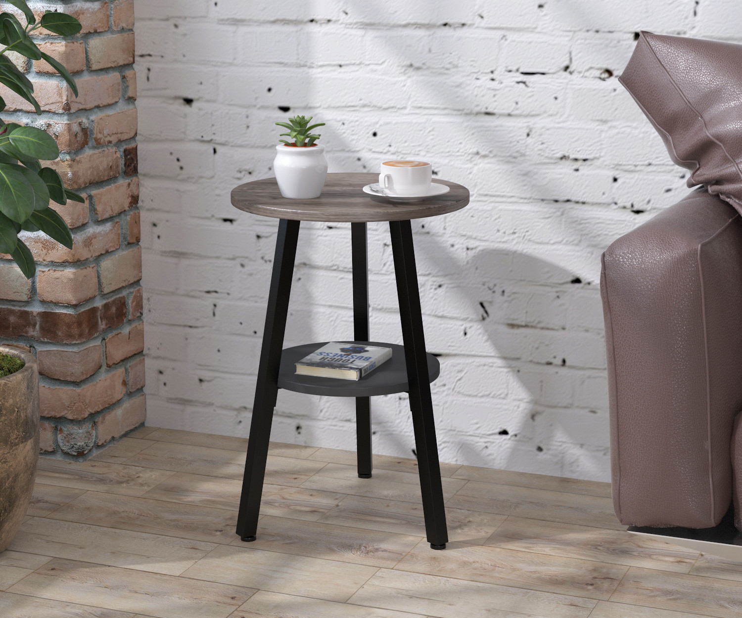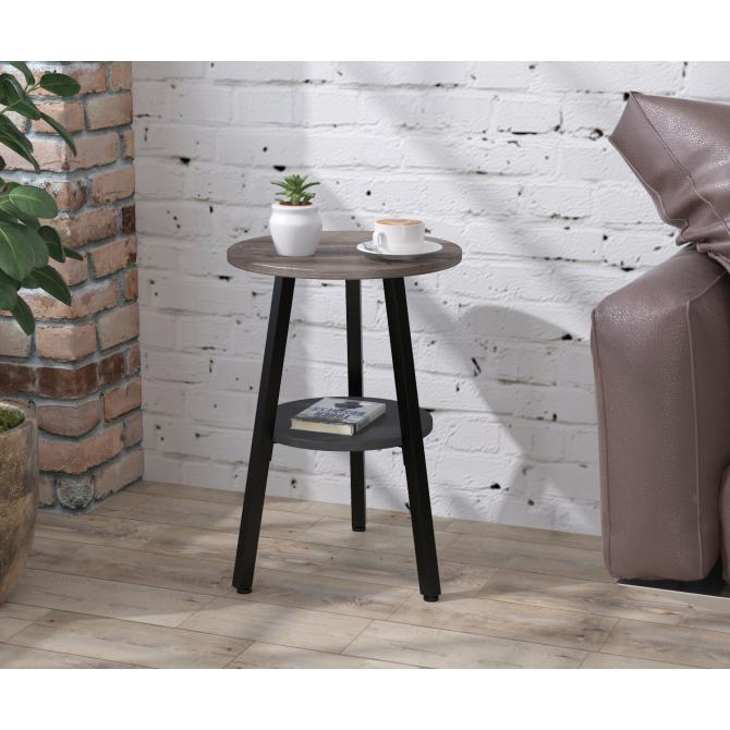 Столик виготовлений із трьох металевих опор, стільниці та нижньої полиці. Опори - це металеві труби товщиною 25х25 мм. Метал пофарбований у чорний колір, методом порошкового напилення. Завдяки такому покриттю поверхня металу має більш естетичний вигляд і тривалий термін служби. В основі встановлені регульовані ніжки. Вони дадуть змогу компенсувати всі нерівності поверхні, а також захистять від виникнення подряпин і потертостей на поверхні підлоги. Стільниці виготовлені з ЛДСП товщиною 18 мм. Діаметр верхньої стільниці становить 40 см, а нижньої 30 см. Нижня поличка оформлена в кольорі антрацит. З представлених кольорів ЛДСП ви зможете вибрати саме той, який підійде під ваш інтер'єр. Для створення журнального столика використовували якісні та міцні матеріали. Рекомендуємо вберігати журнальний столик від вологи і високих температур, щоб він довгий час зберігав свій первинний зовнішній вигляд.