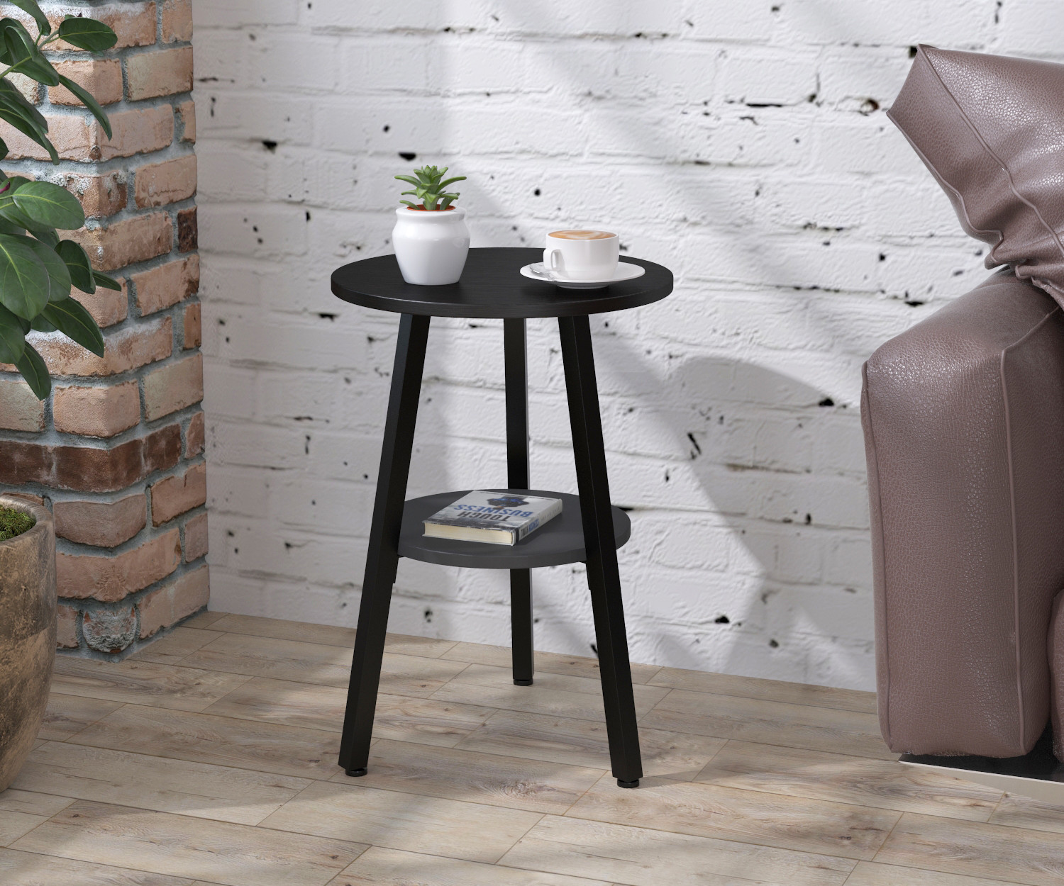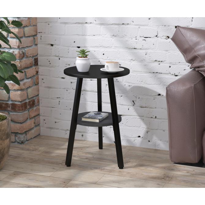 Столик виготовлений із трьох металевих опор, стільниці та нижньої полиці. Опори - це металеві труби товщиною 25х25 мм. Метал пофарбований у чорний колір, методом порошкового напилення. Завдяки такому покриттю поверхня металу має більш естетичний вигляд і тривалий термін служби. В основі встановлені регульовані ніжки. Вони дадуть змогу компенсувати всі нерівності поверхні, а також захистять від виникнення подряпин і потертостей на поверхні підлоги. Стільниці виготовлені з ЛДСП товщиною 18 мм. Діаметр верхньої стільниці становить 40 см, а нижньої 30 см. Нижня поличка оформлена в кольорі антрацит. З представлених кольорів ЛДСП ви зможете вибрати саме той, який підійде під ваш інтер'єр. Для створення журнального столика використовували якісні та міцні матеріали. Рекомендуємо вберігати журнальний столик від вологи і високих температур, щоб він довгий час зберігав свій первинний зовнішній вигляд.