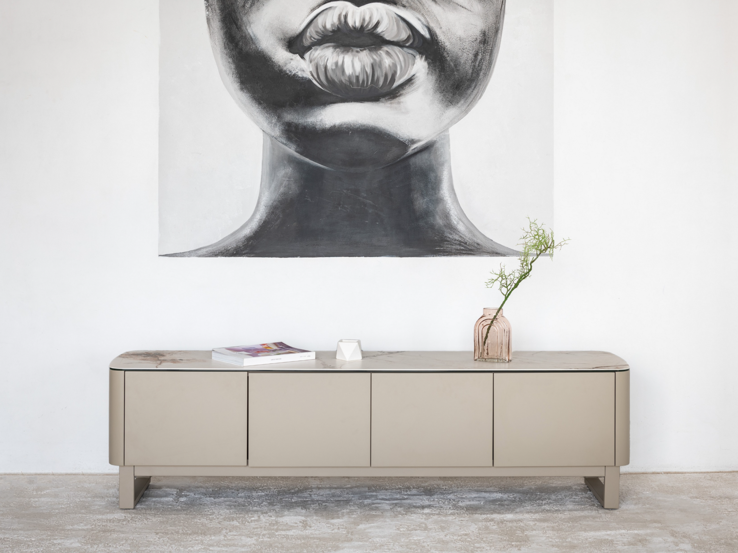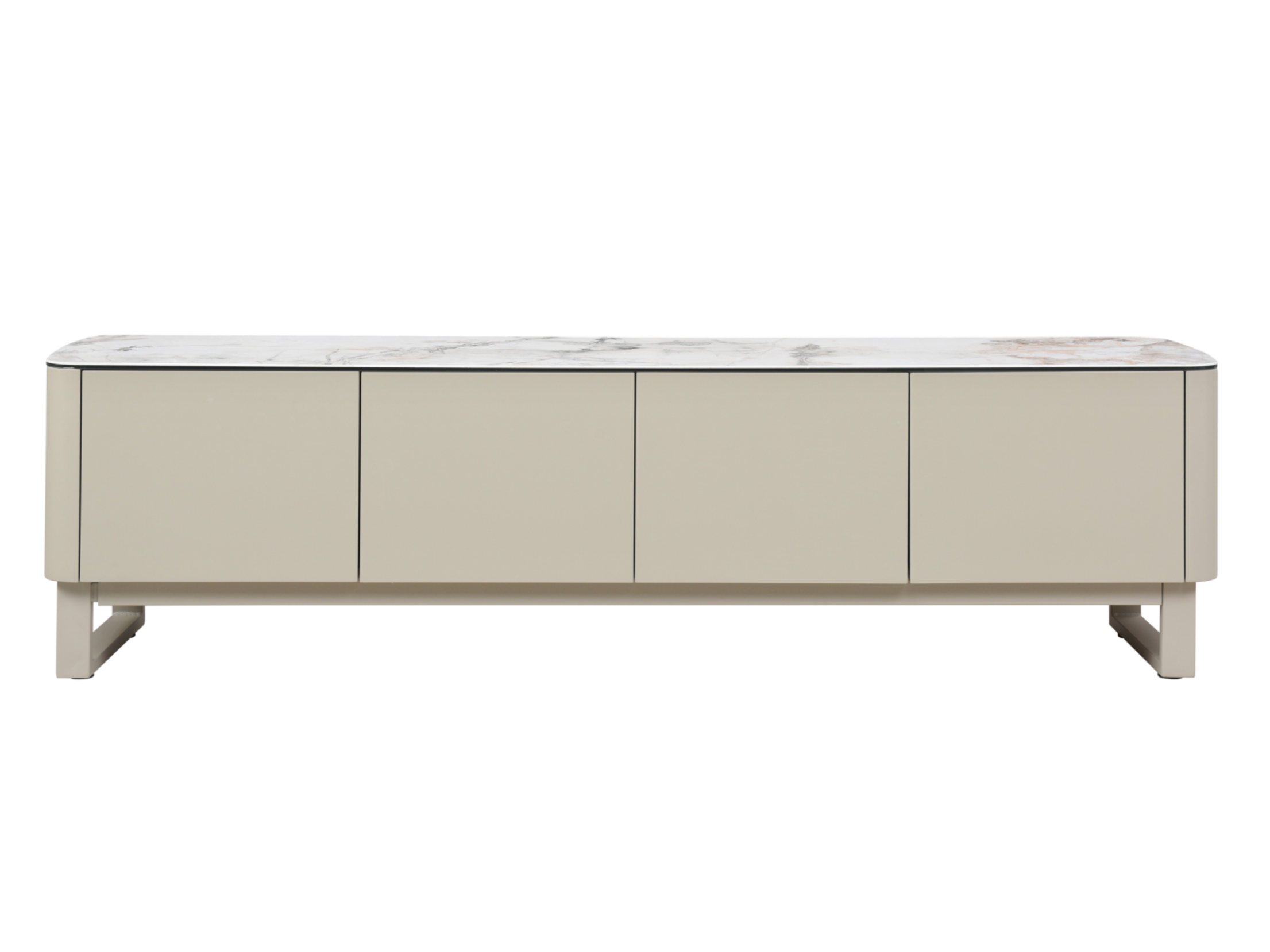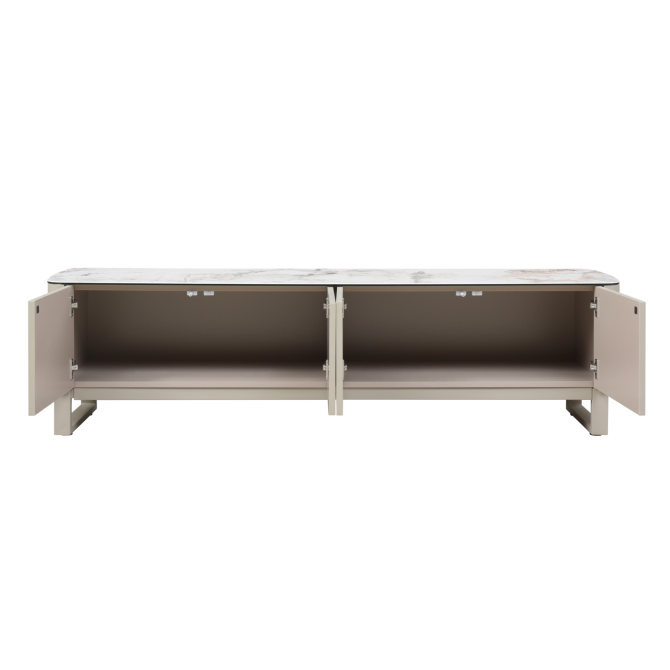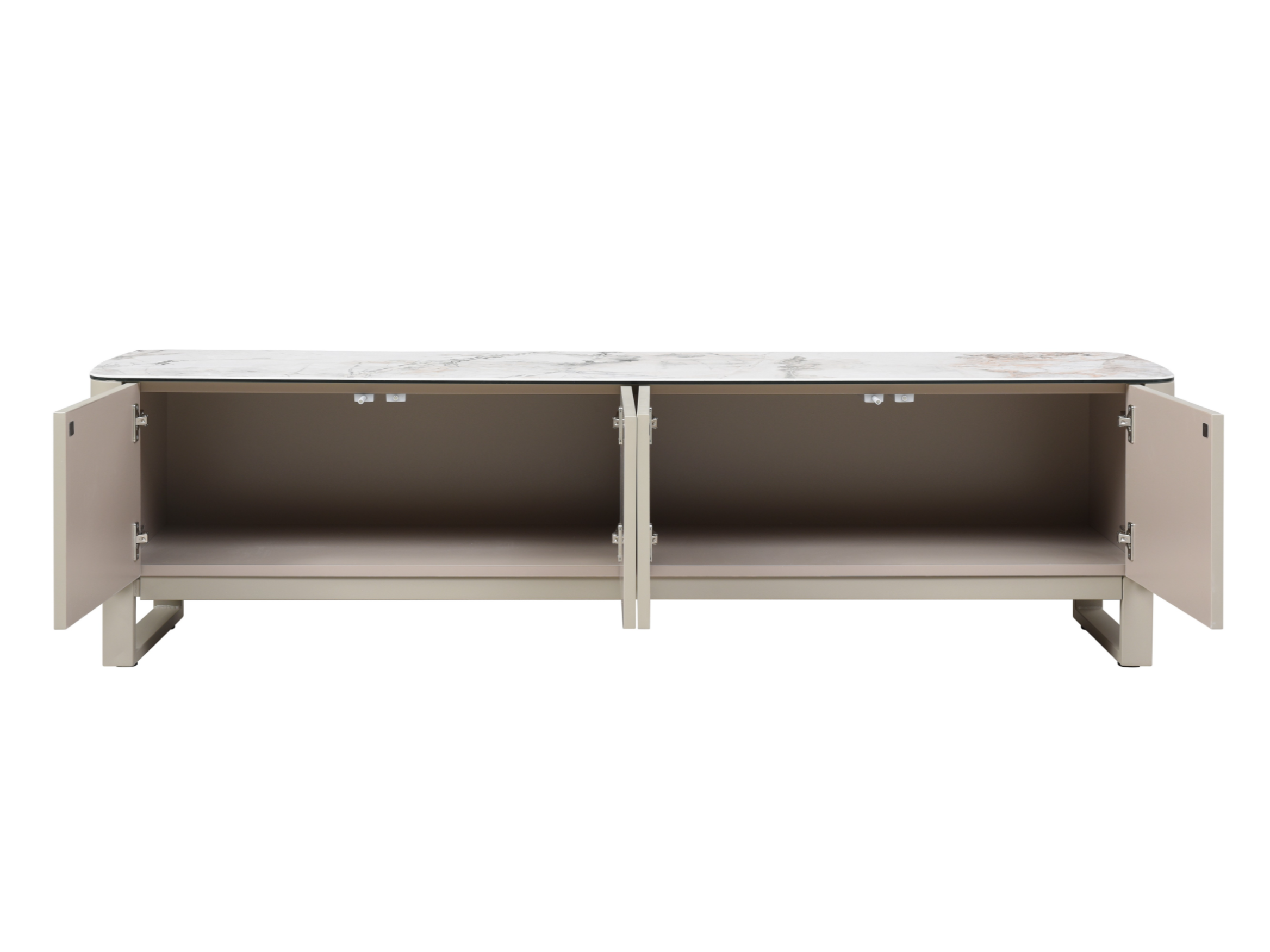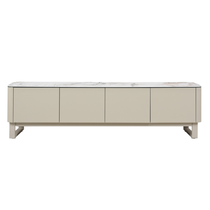 Основа з фарбованого металу в бежевому кольорі додає конструкції стабільності та гармонійно вписується в сучасний інтер’єр. Завдяки продуманим розмірам 180×44×48 см тумба є місткою, пропонуючи зручне місце для телевізора, техніки та інших аксесуарів.