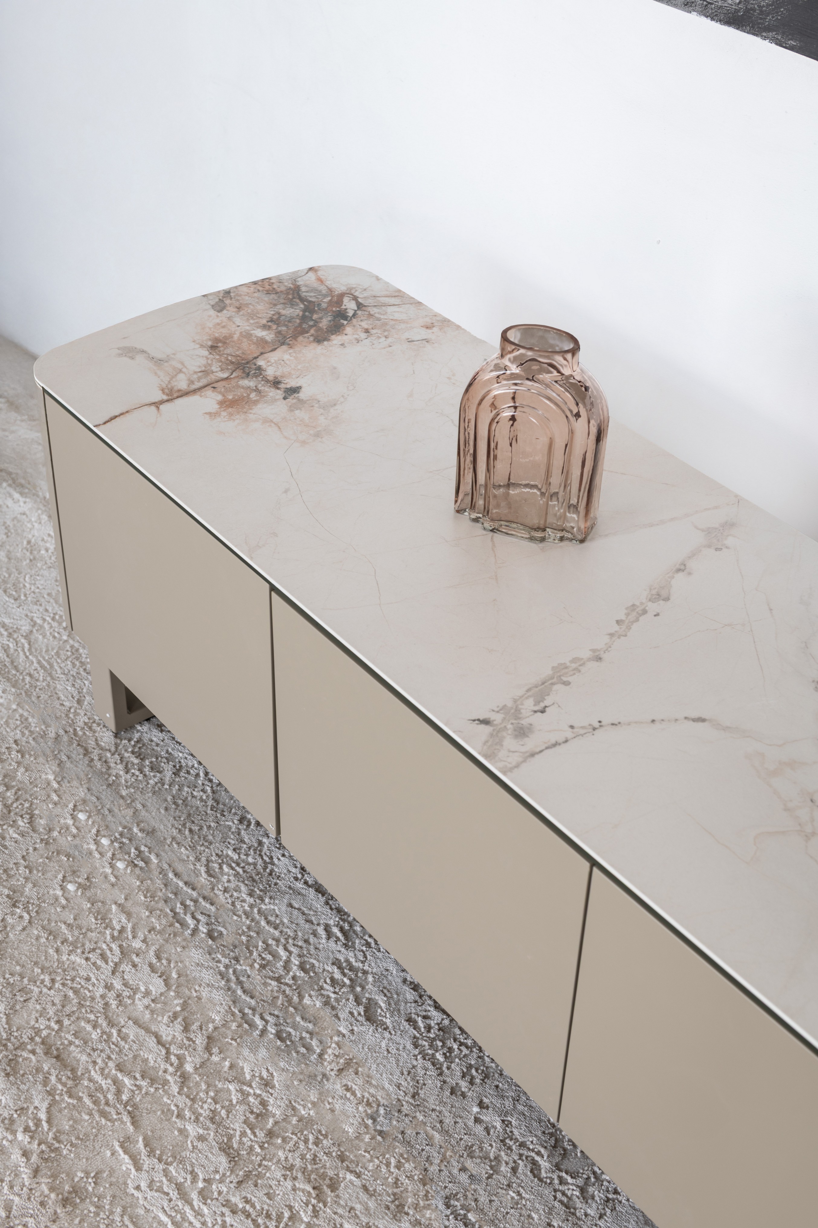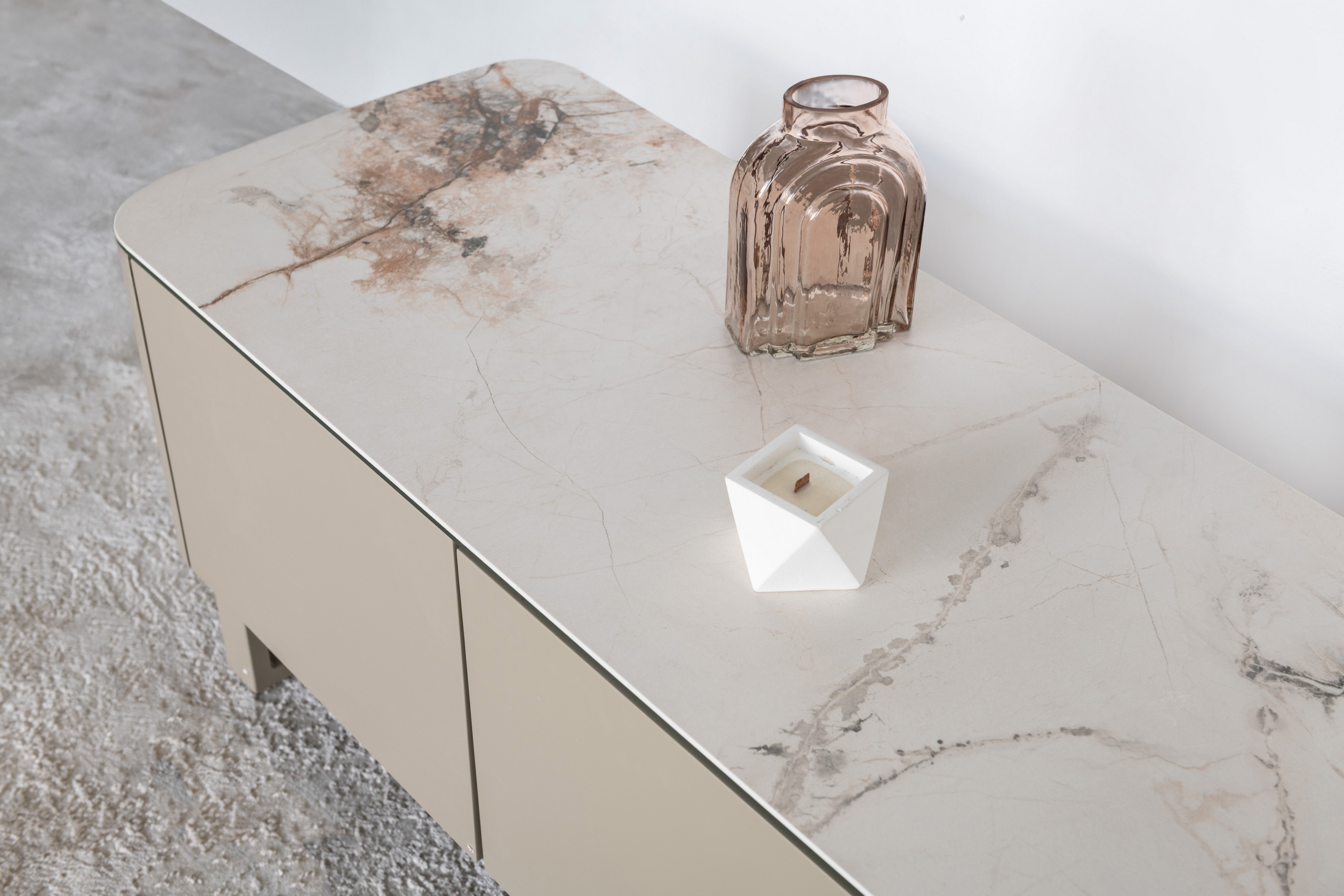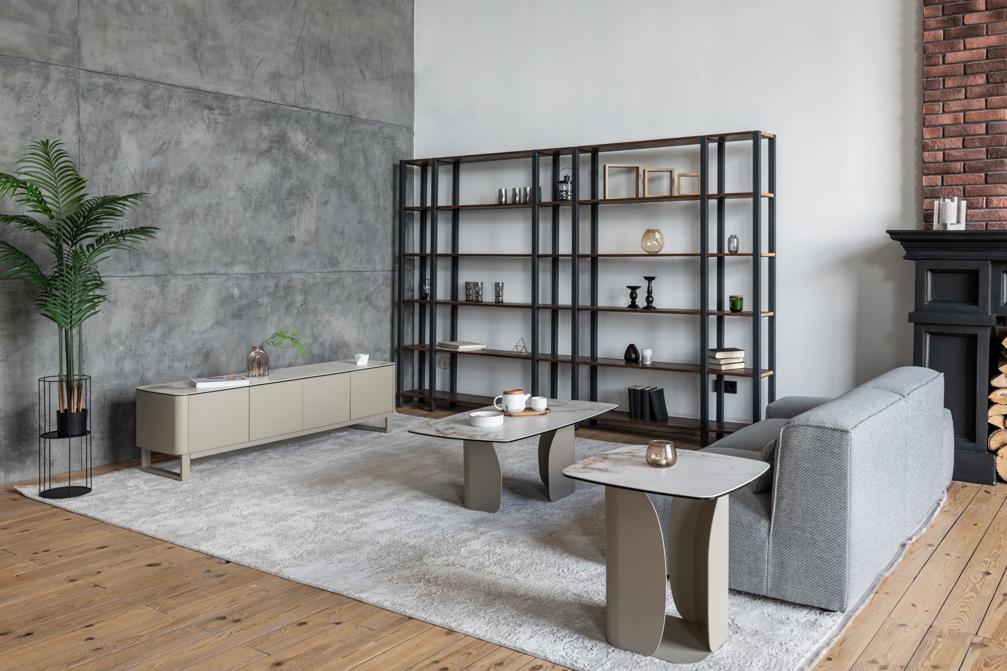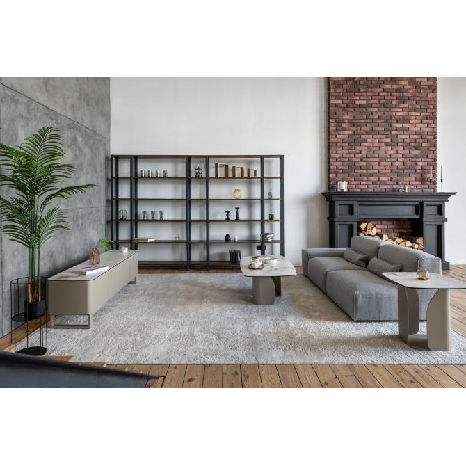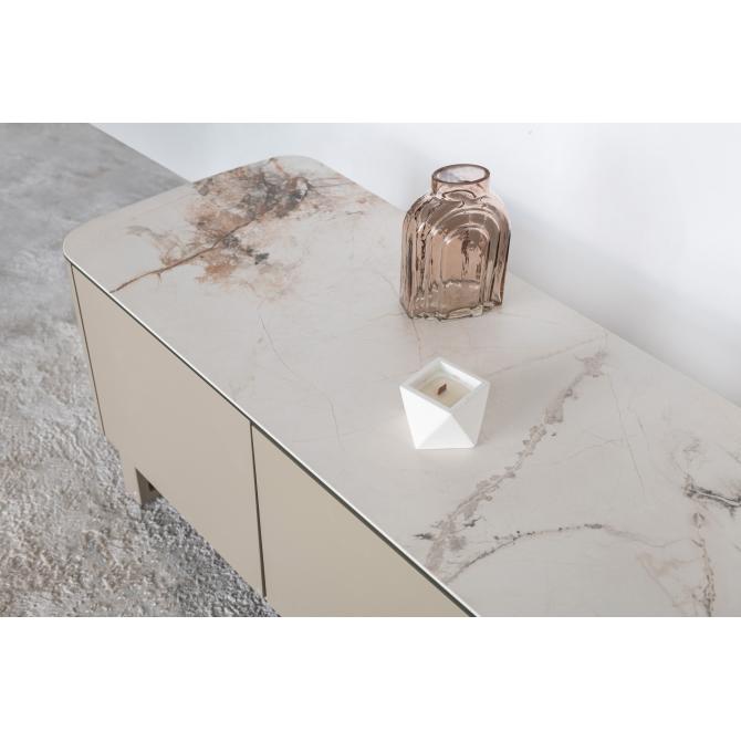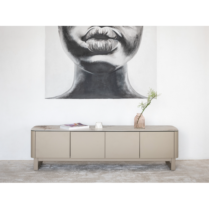 Основа з фарбованого металу в бежевому кольорі додає конструкції стабільності та гармонійно вписується в сучасний інтер’єр. Завдяки продуманим розмірам 180×44×48 см тумба є місткою, пропонуючи зручне місце для телевізора, техніки та інших аксесуарів.