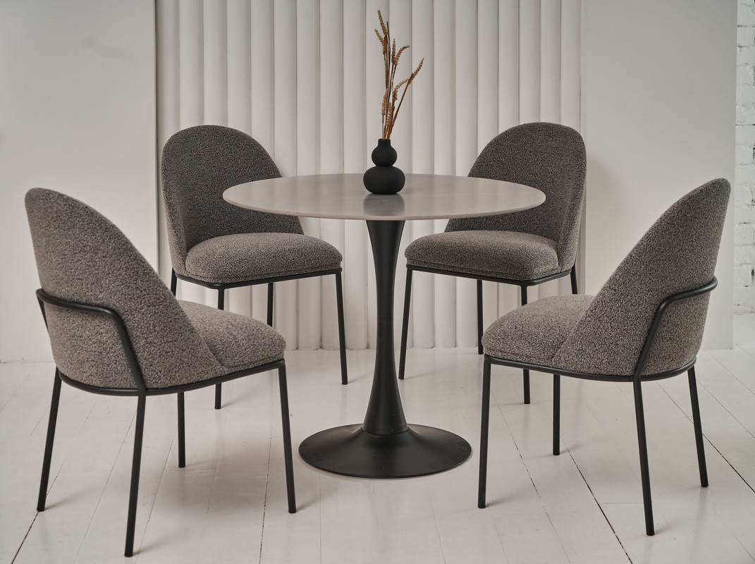 - Сірий букле + Чорний метал: Чорні металеві деталі меблів, сірі штори і декоративні елементи.