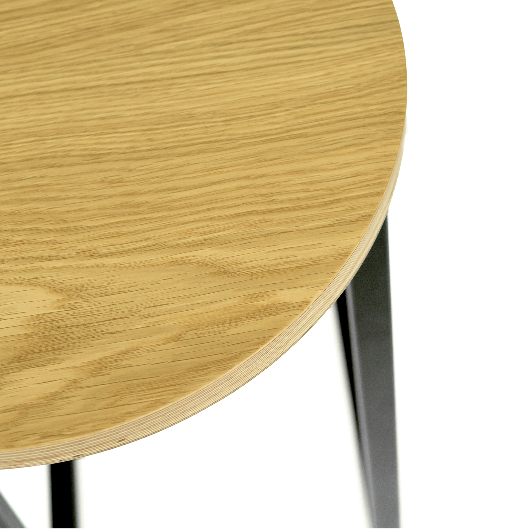 Для виготовлення каркаса використовується квадратна труба 25х25 мм, яка зробила стілець неймовірно міцним, але при цьому легким. Він відрізняється стійкістю до великих навантажень, а також негативного впливу вологи та інших зовнішніх впливів. Сидіння в моделі компактне, але при цьому комфортне. Воно виконане з фанери шпонованої натуральним дубом і має діаметр 35 см, а для збільшення довговічності покривається лаком.