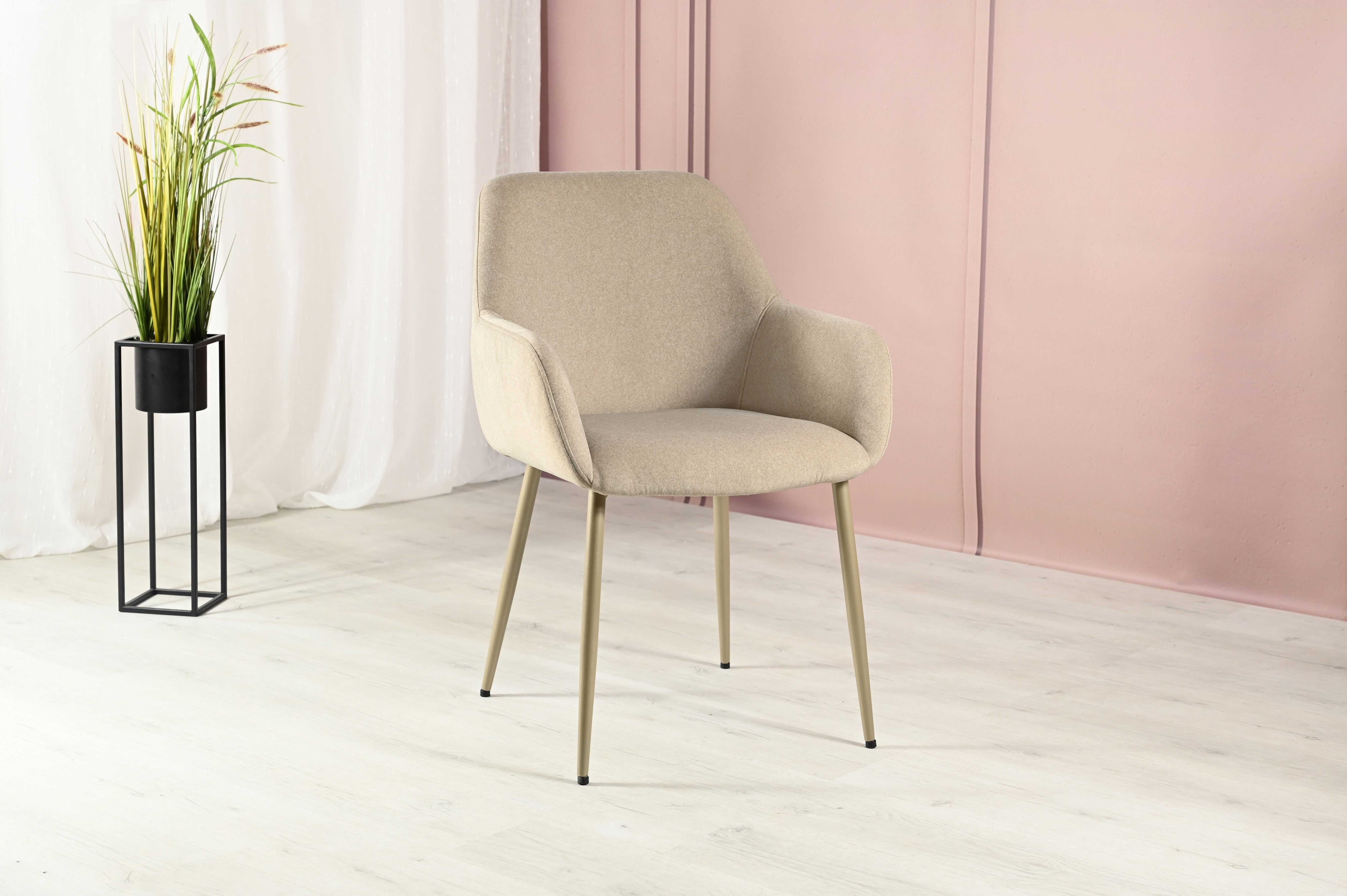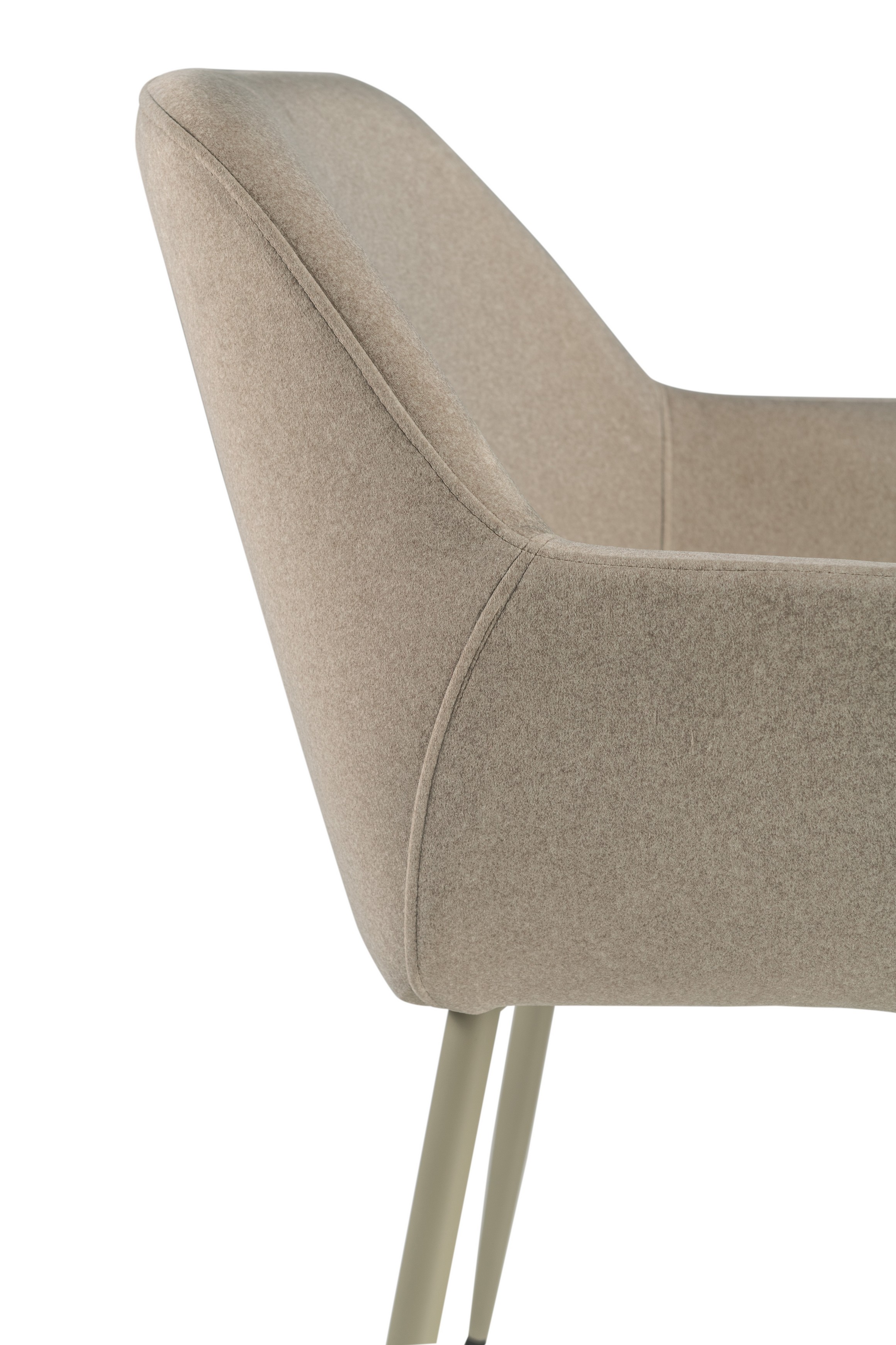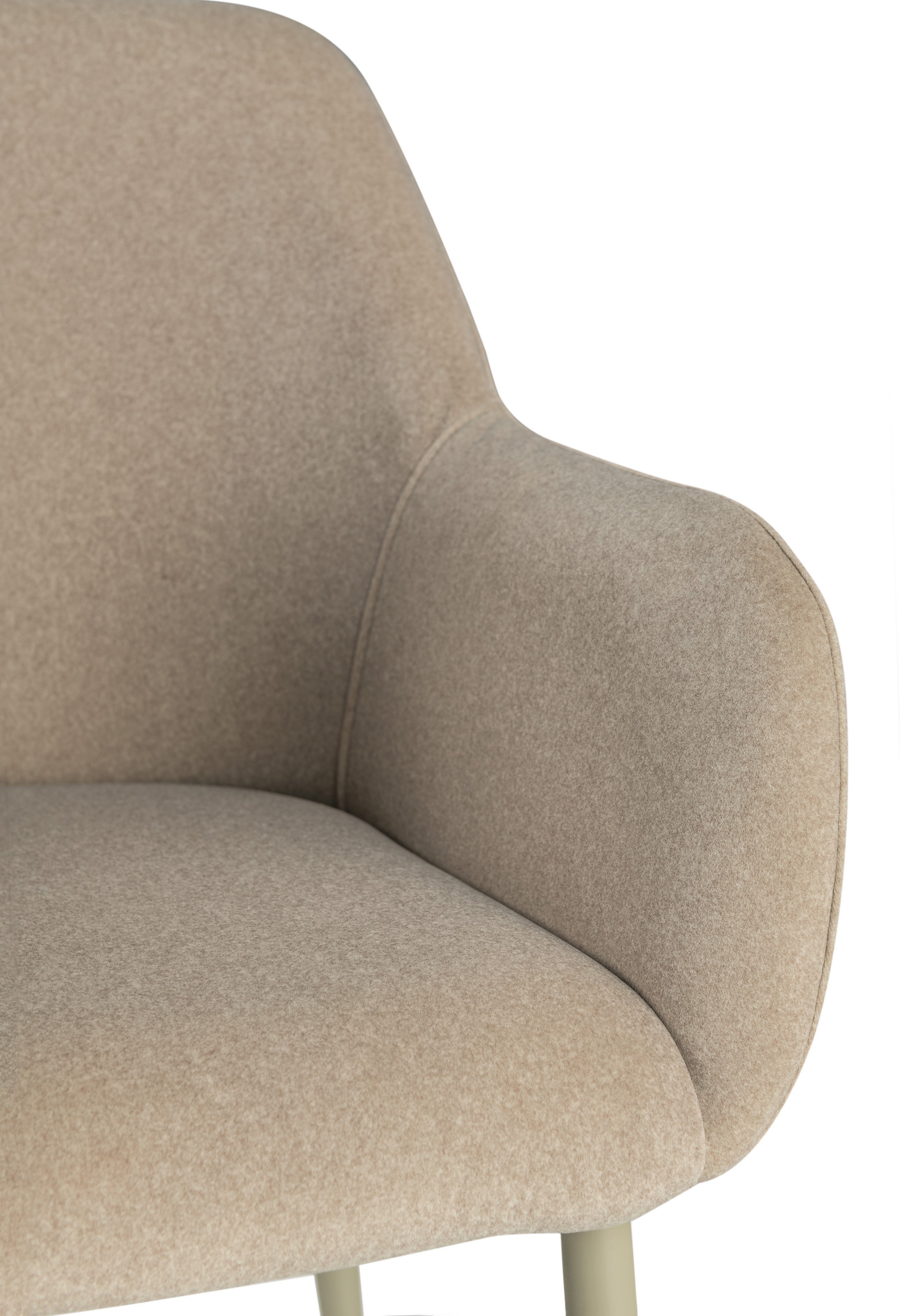 Оббивка стільця виконана з мохеру — тканини, яка відома своєю м'якістю і довговічністю. Колір "устричний" має приємний нейтральний відтінок, що додає елегантності і гармонійно виглядає в будь-якому інтер'єрі. Біла фарбована металева основа забезпечує стабільність і надає стільцю сучасного вигляду.