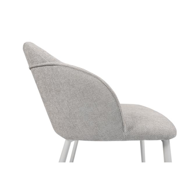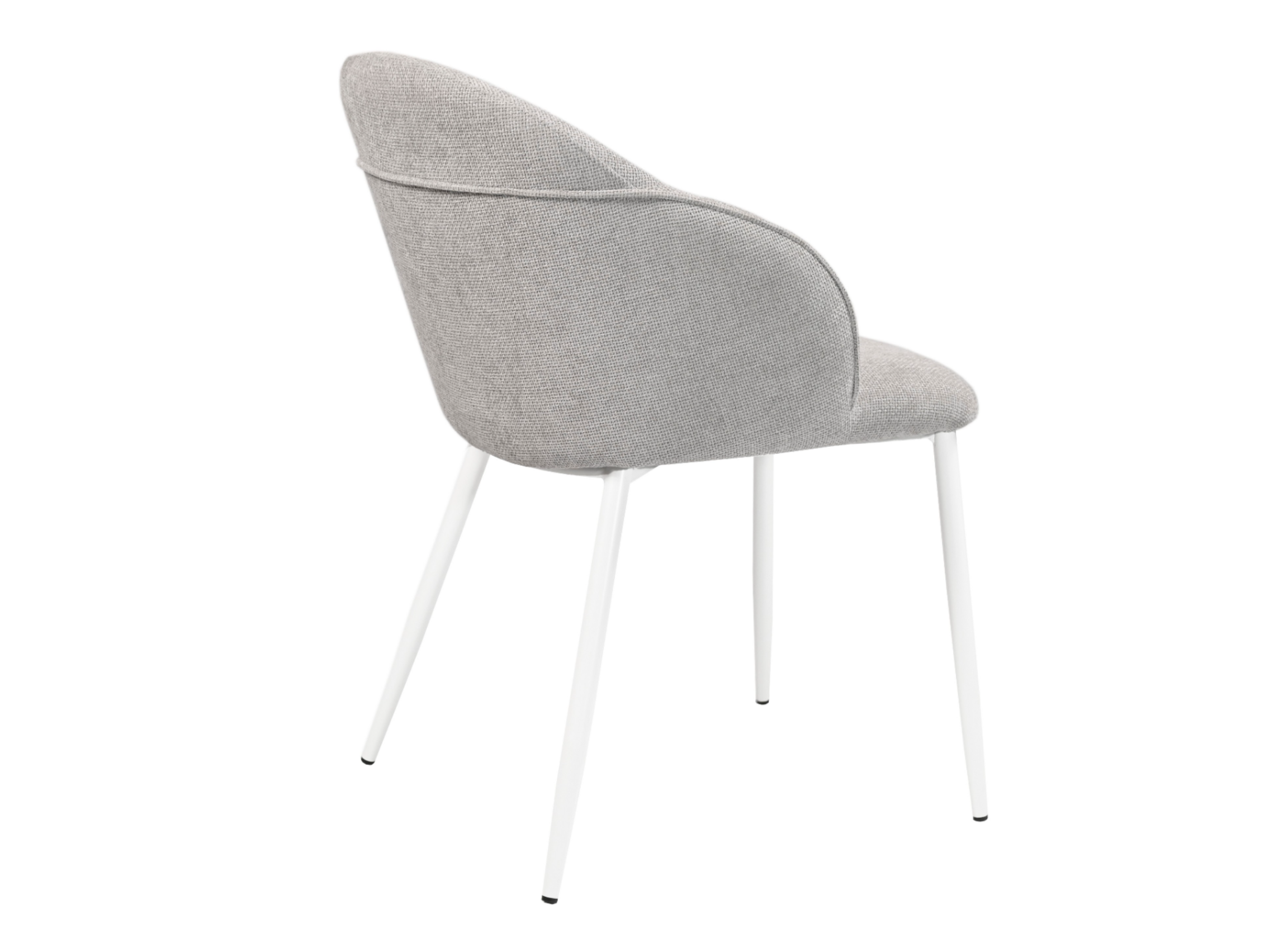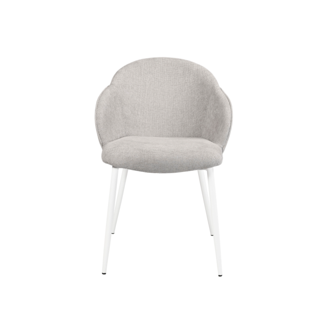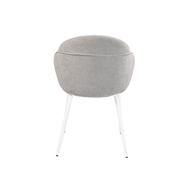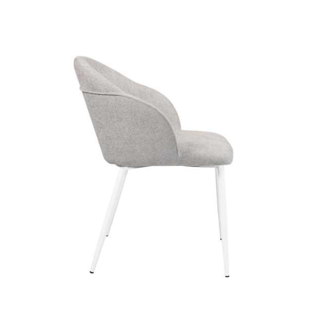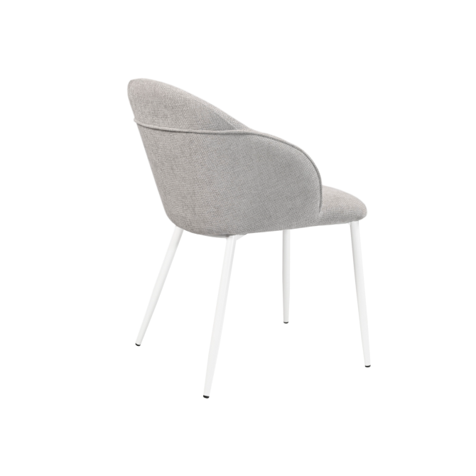 Підлокітники та зручна форма сидіння забезпечують комфорт під час тривалого сидіння — як за обіднім столом, так і в зонах відпочинку. Металеві ніжки, пофарбовані у білий колір, додають конструкції легкості та свіжості, утворюючи контраст з темною оббивкою.