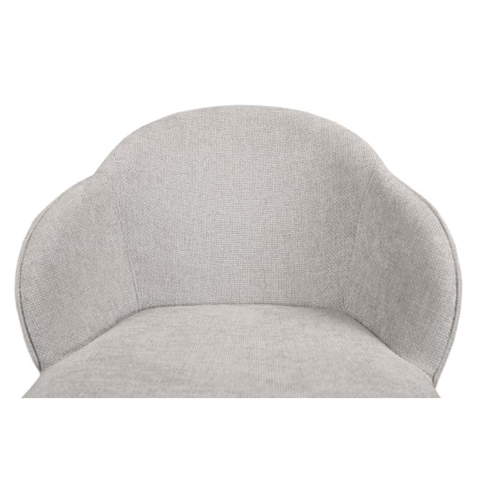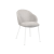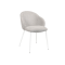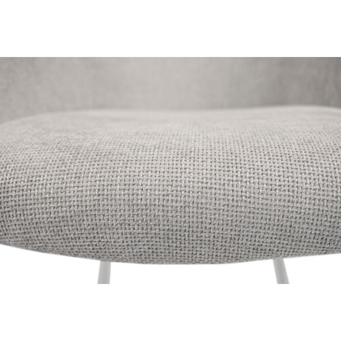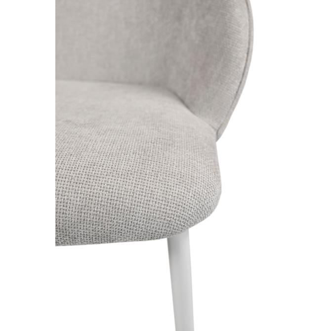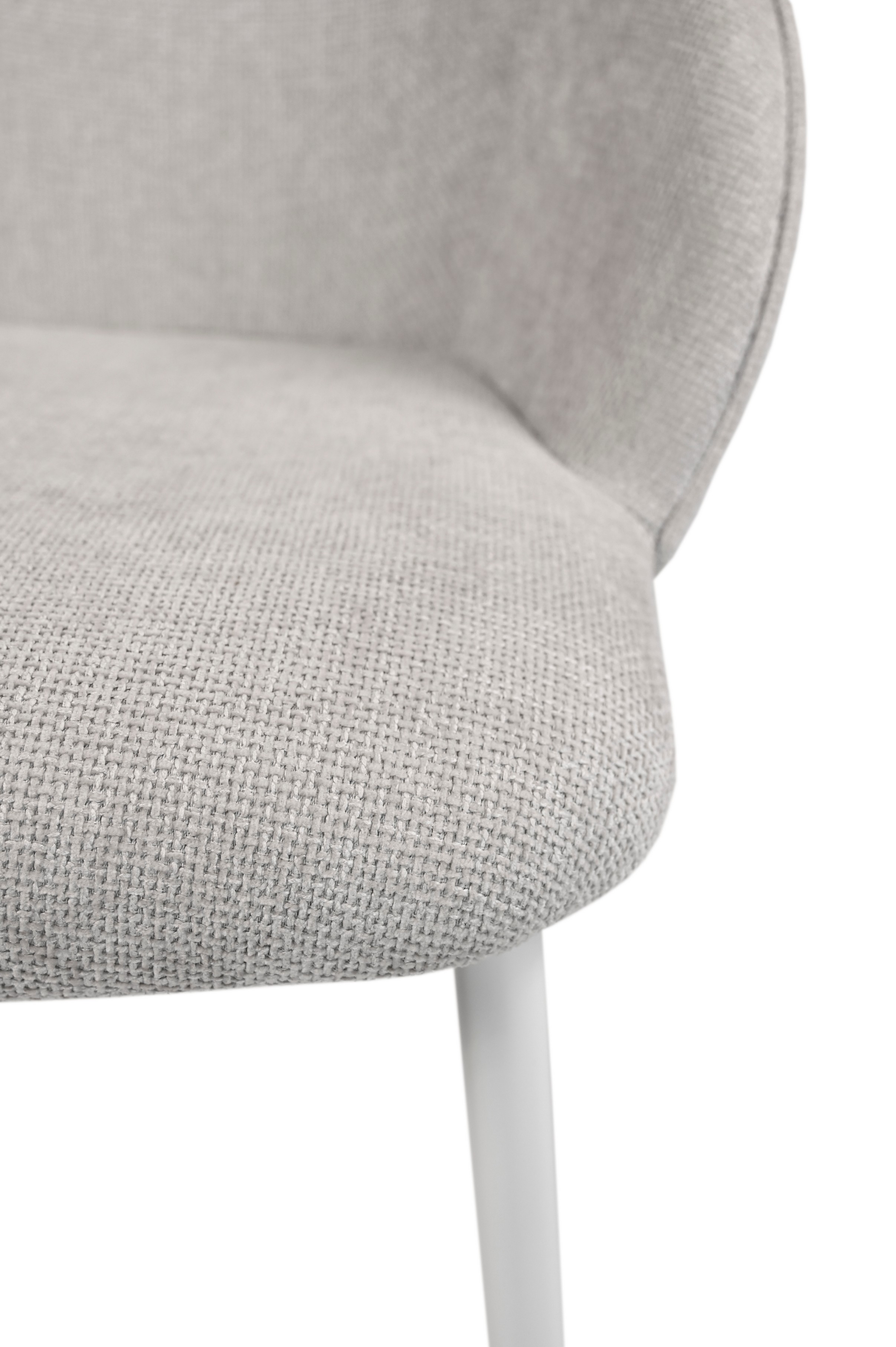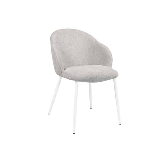 Підлокітники та зручна форма сидіння забезпечують комфорт під час тривалого сидіння — як за обіднім столом, так і в зонах відпочинку. Металеві ніжки, пофарбовані у білий колір, додають конструкції легкості та свіжості, утворюючи контраст з темною оббивкою.