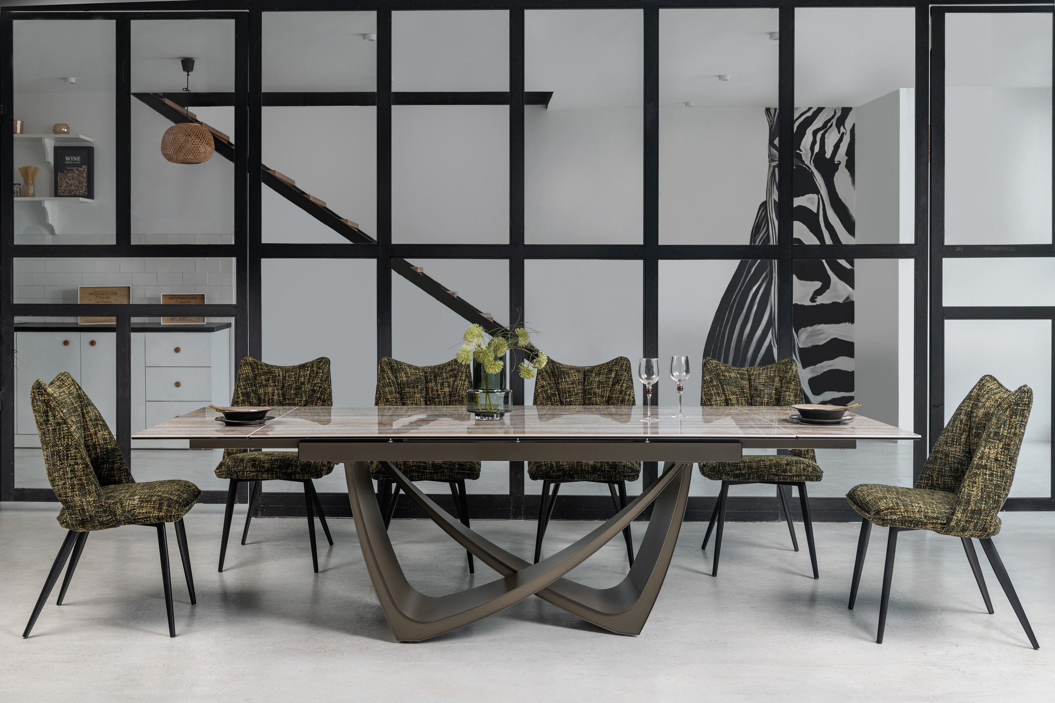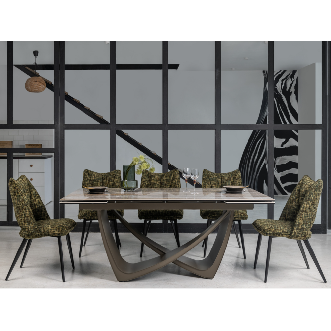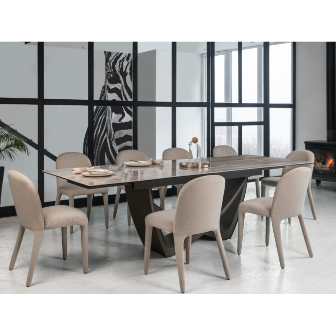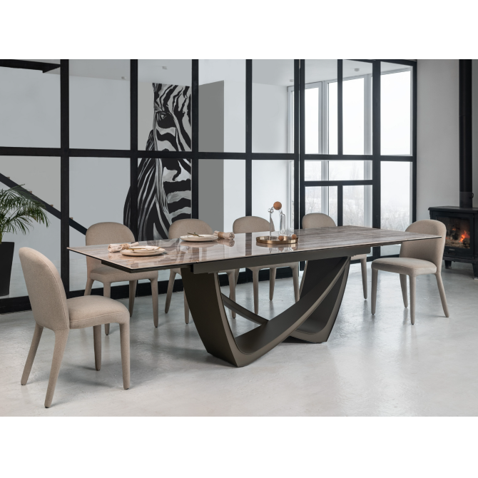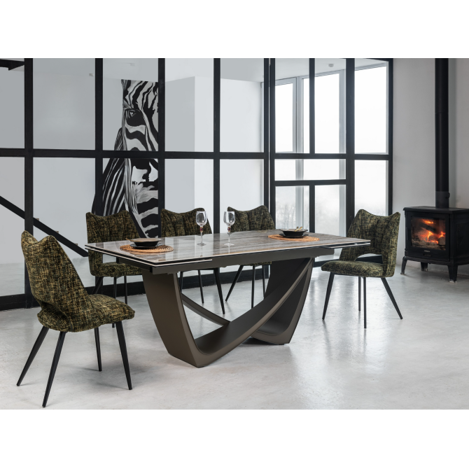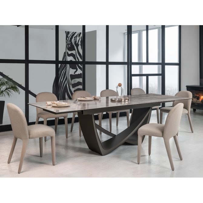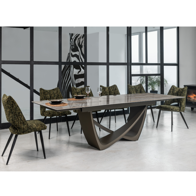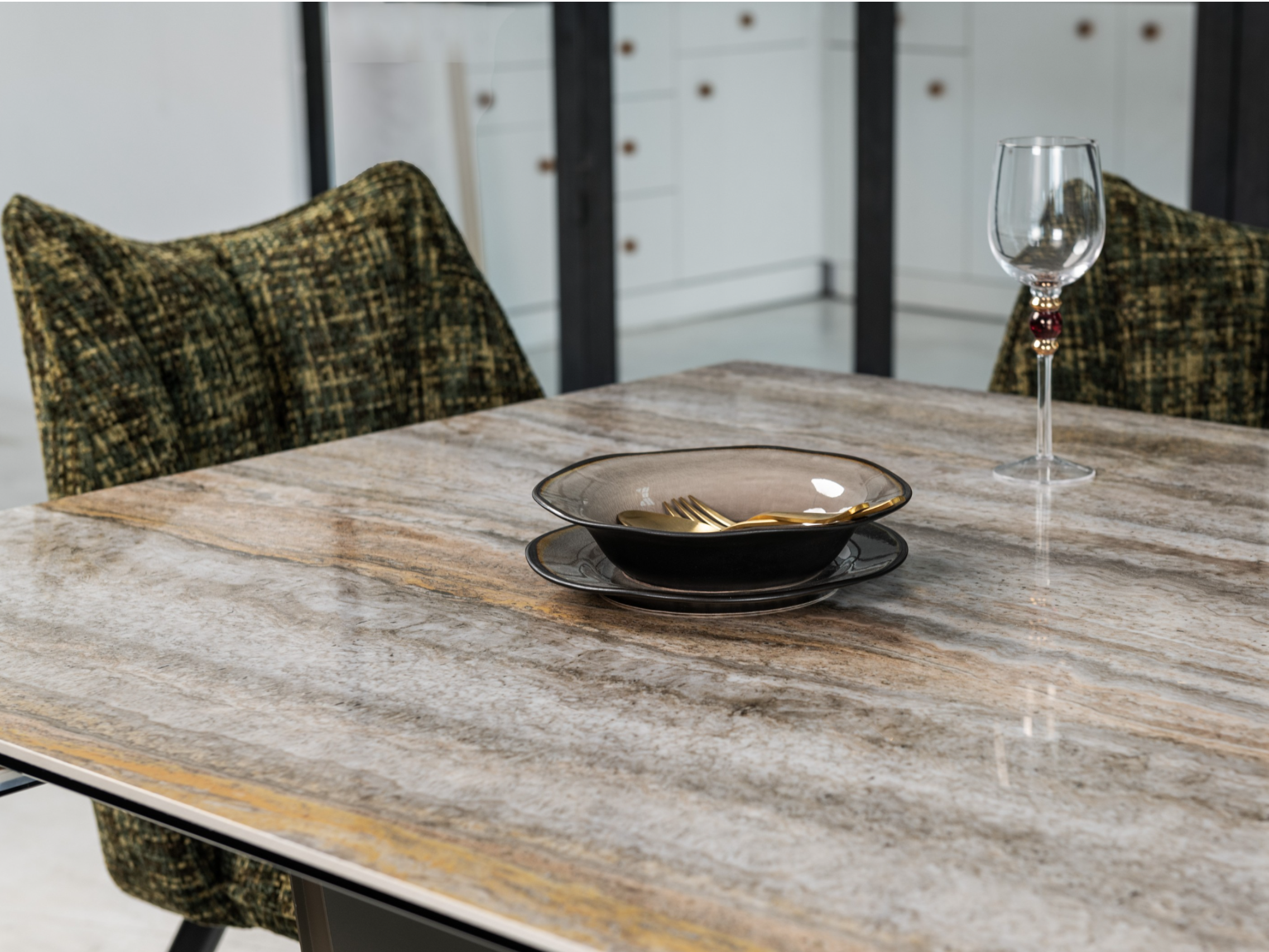 Стільниця поєднує глянцеву кераміку та гартоване скло, що робить її дуже стійкою до тепла, перепадів температур і вигорання на сонці. Фарбований метал основи також додає стійкості та надійності конструкції.