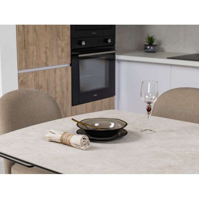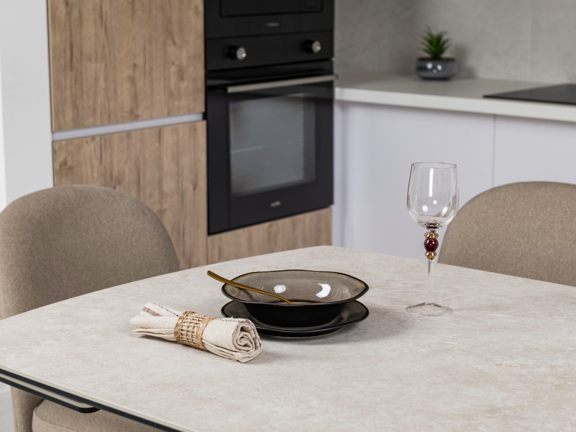 Стільниця з кераміки на гартованому склі забезпечує підвищену стійкість до подряпин, високих температур і впливу вологи. Це робить його довговічним, особливо для активного використання.