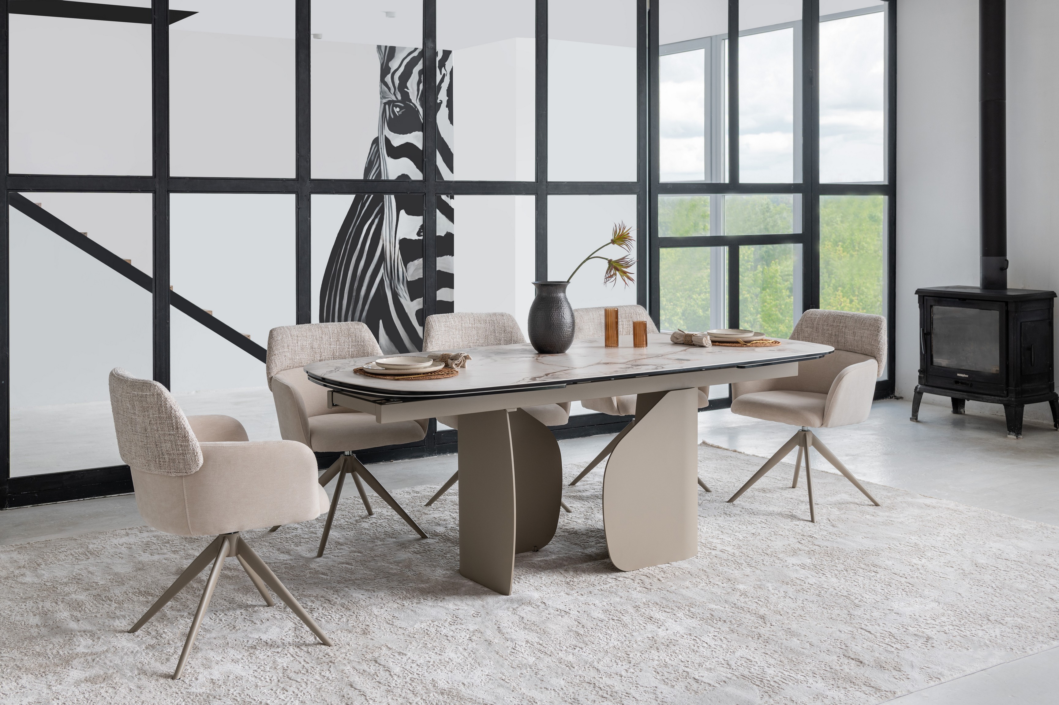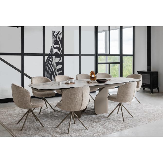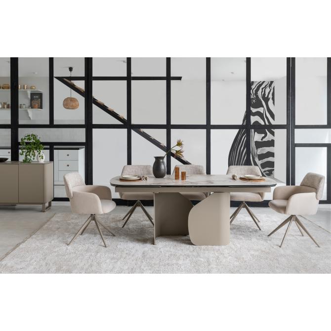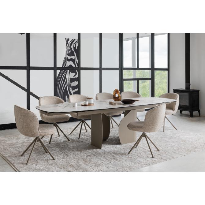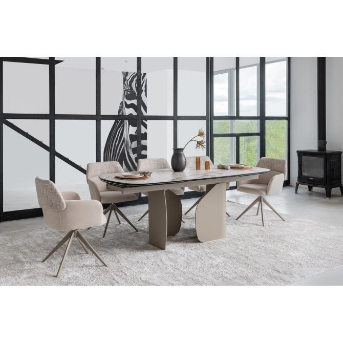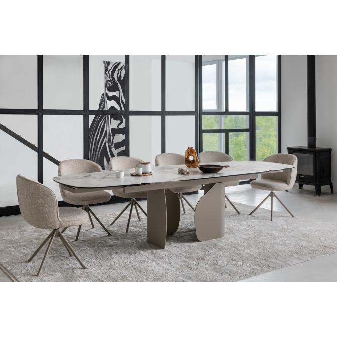 Механізм розкладки столу — боковий — дозволяє збільшити довжину стільниці з 200 см до 300 см, що робить стіл надзвичайно зручним для великих компаній або сімейних зборів. Основа з фарбованого металу гарантує надійність і стабільність конструкції, додаючи їй сучасного вигляду.