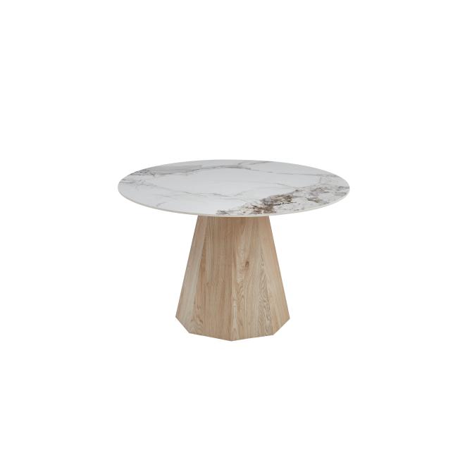 Стільниця виконана з глянцевої кераміки у вишуканому відтінку голден сенд, що надає столу елегантного вигляду, а також забезпечує довговічність і стійкість до подряпин і вологи. Основа з ламінованого МДФ у відтінку дуба додає конструкції природної теплоти та гармонійно поєднується із загальним дизайном.
