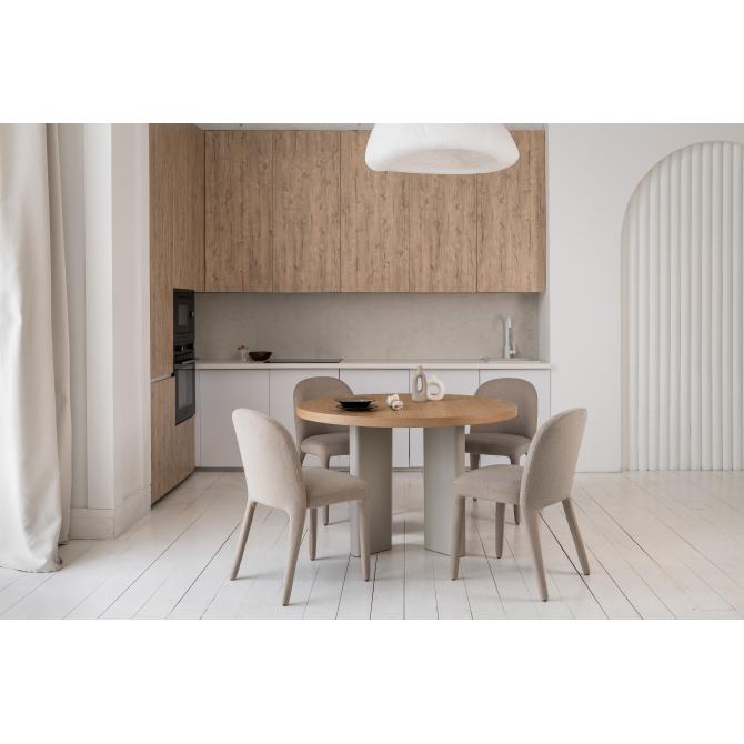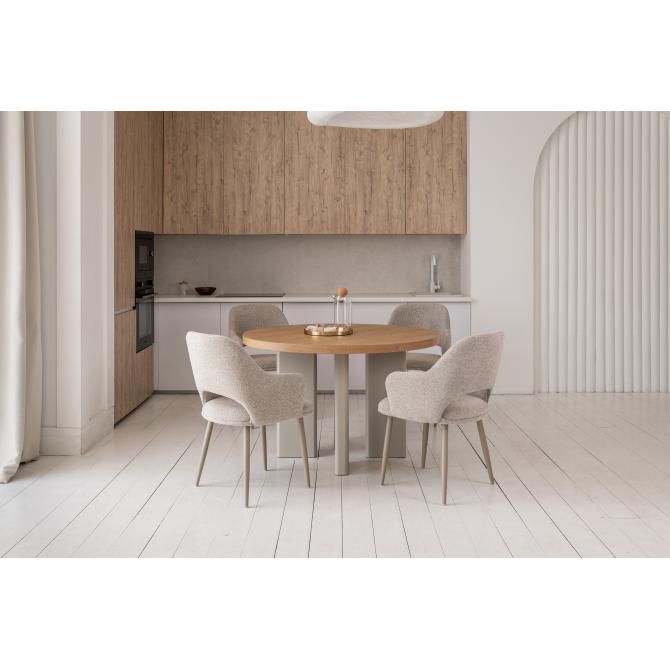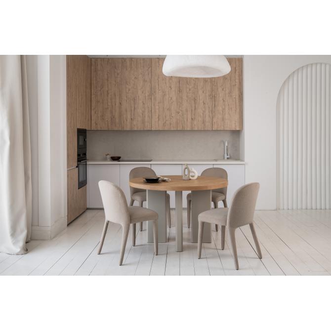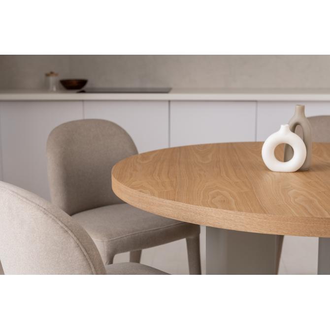 Кругла стільниця діаметром 120 см виготовлена зі шпонованого МДФ у відтінку “ясень”, що додає виробу природного шарму та тепла.