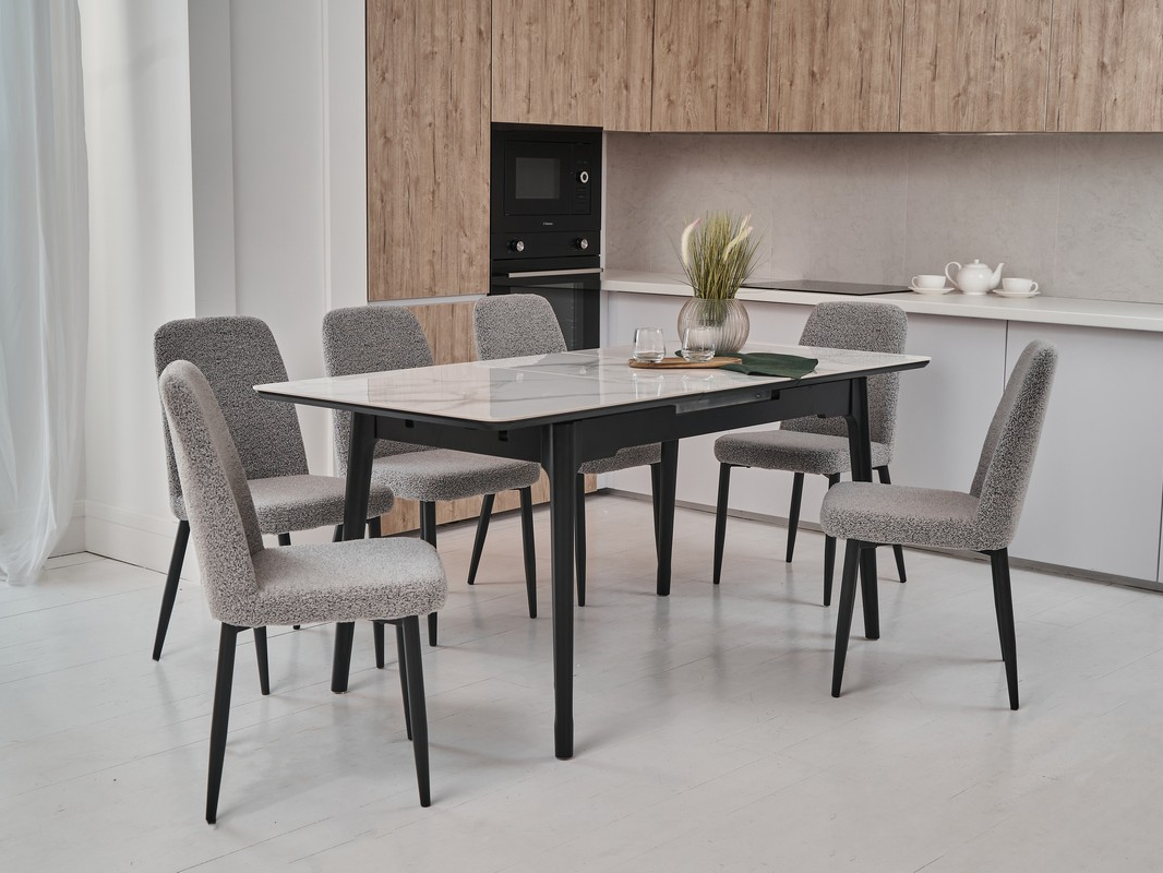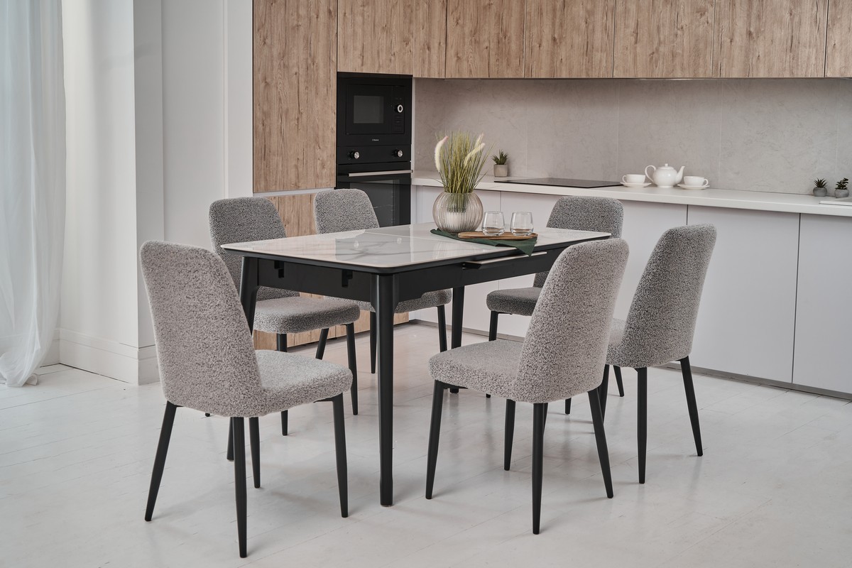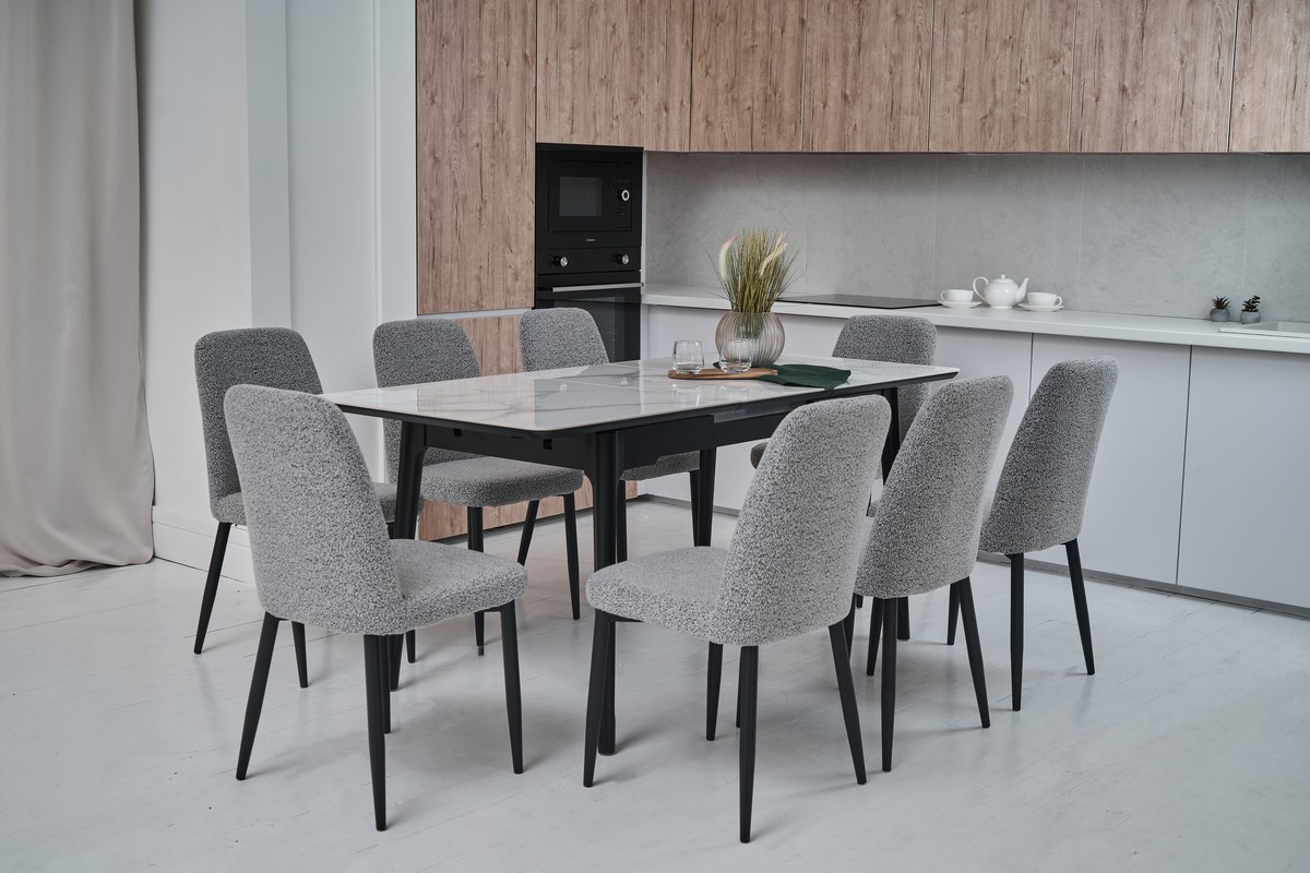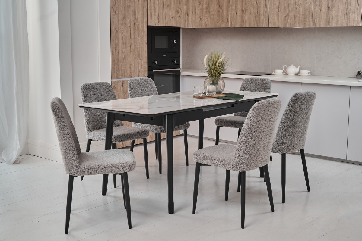 Стіл виготовлений з глянцевої кераміки та глянцевого МДФ, він привнесе в ваш інтер'єр витонченість і шарм. Автоматичний механізм розкладання дозволяє легко змінювати його розміри, роблячи його ідеальним для різних ситуацій - від сімейних обідів до вечірок з друзями.