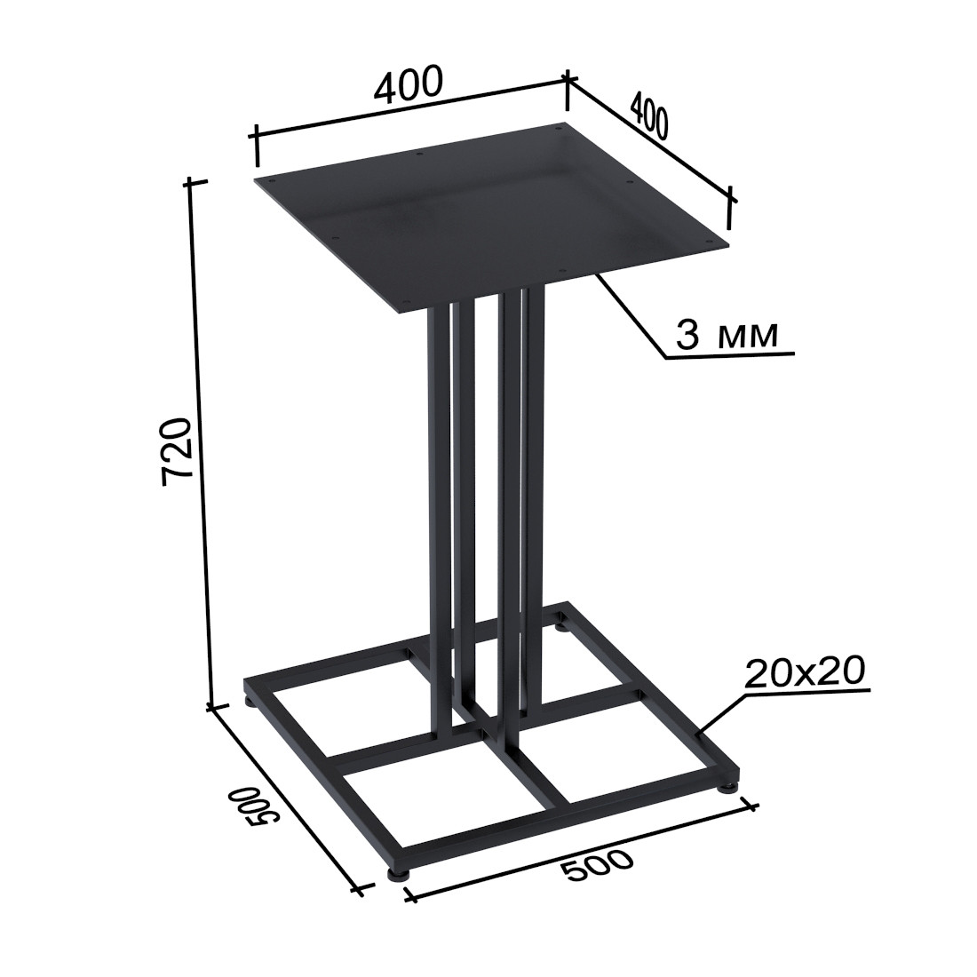 Основа столу виготовлена з труби з профілем 20х20 мм. Опора пофарбована в чорний колір RAL 9011 порошковою фарбою, стійкою до стирання.