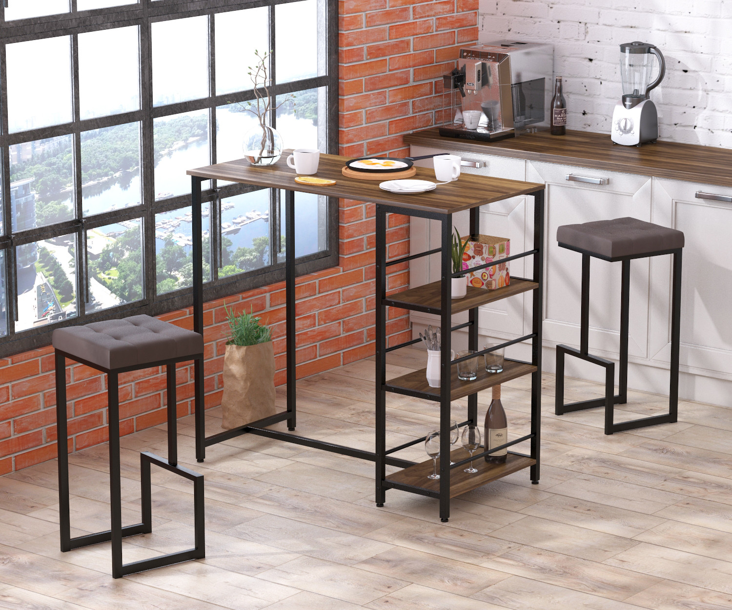 На відміну від більшості інших барних столів, ця модель поєднує барну стійку і невеликий стелаж. 3 глибокі полиці ідеально підходять для розміщення посуду, чашок, закусок та вина. А стільці можна поставити під стіл, щоб заощадити місце, коли вони не використовуються.