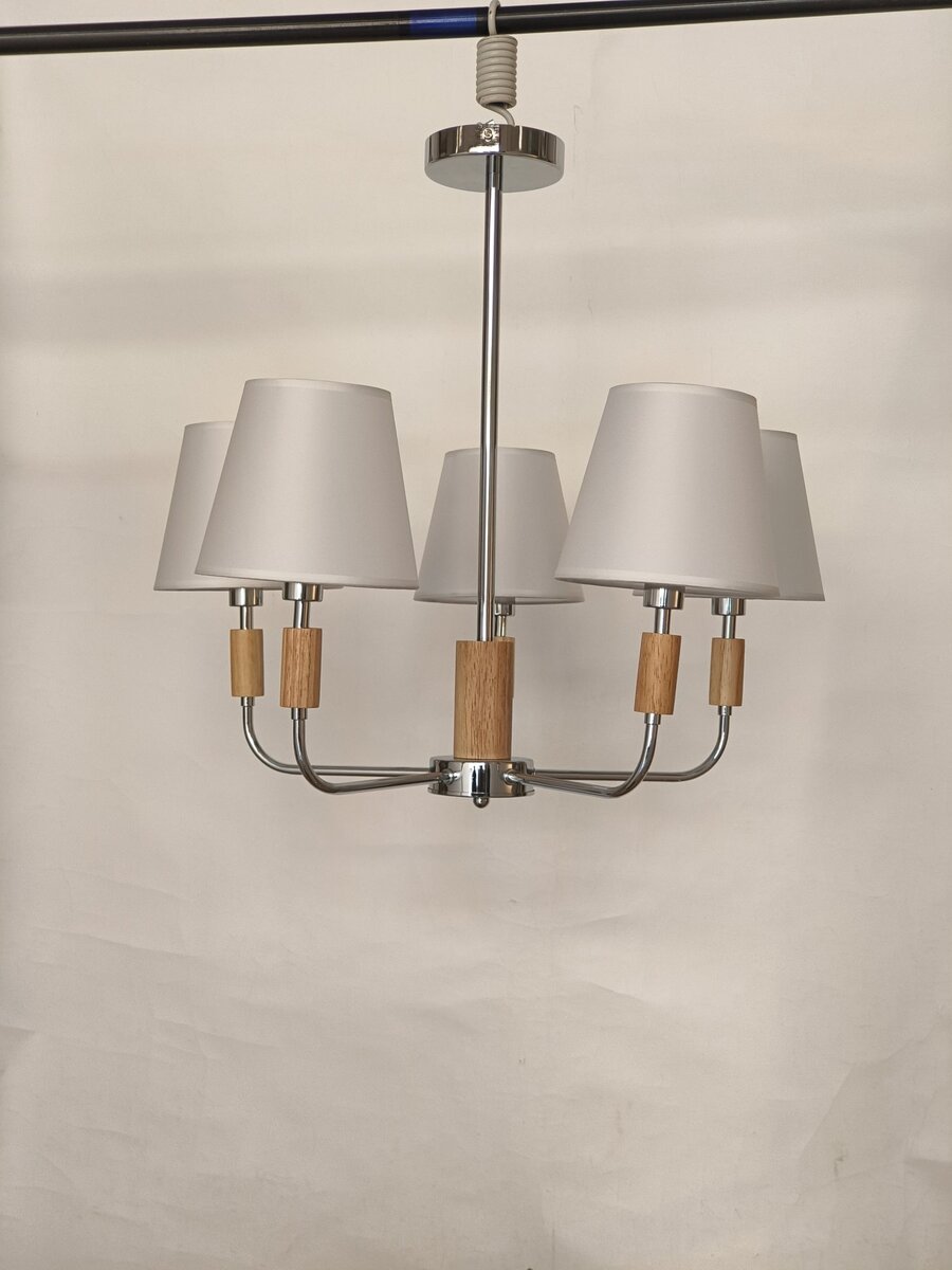 Люстра класична для вітальні VALESO V16-5 CH — стильний акцент у вашій вітальні, який гармонійно поєднує класику з сучасними елементами дизайну. Завдяки витонченій комбінації хромового металу, дерев'яних деталей і білих текстильних плафонів, ця модель додає тепла, затишку і неперевершеної елегантності вашому інтер’єру.