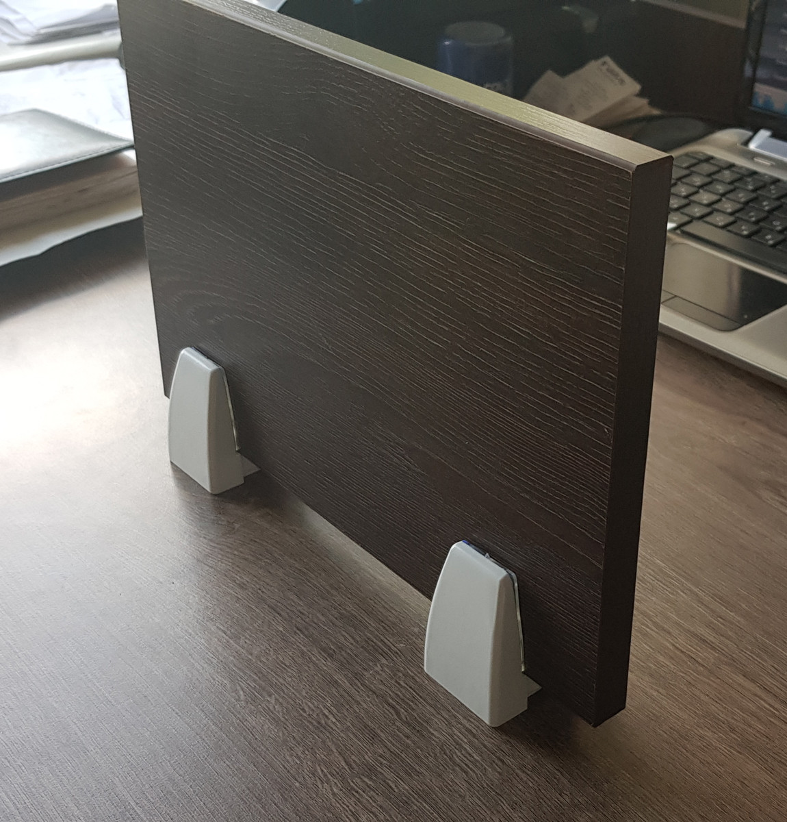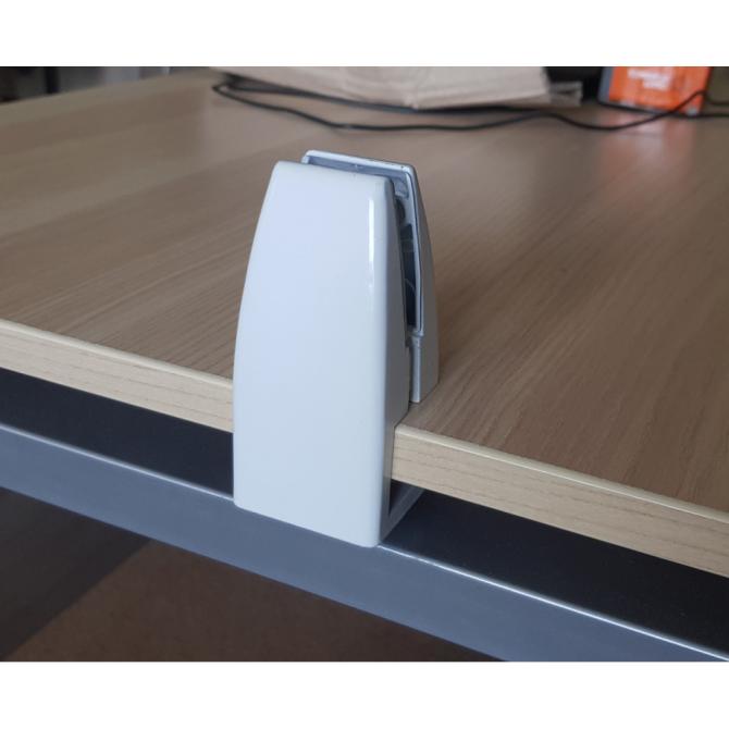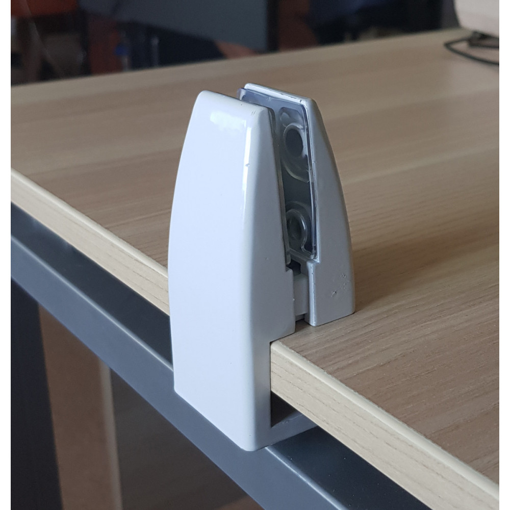 Тримач-кріплення №2 підходить для кріплення перегородки між двома столами або для одного столу, щоб сховатися екраном від відвідувачів. Ця модель тримача екрану для столу підходить для столу, у якого є виліт стільниці ззаду на 25 мм. товщина стільниці має перевищувати 26 мм. Кріплення надійно кріпиться за край стільниці за допомогою гвинтів, має привабливий вигляд, підходить для багаторазового використання. Як перегородка може виступити різний матеріал: акрил, скло, фанера, ДСП або спеціальний звукопоглинаючий екран. Товщина матеріалу має бути 3-18 мм. Затискач здійснюється за допомогою гвинта з головкою під шестигранний ключ. Гвинт та ключ входять у комплект. Утримувачі також комплектуються силіконовими накладками для захисту екрана від пошкодження при затиску.