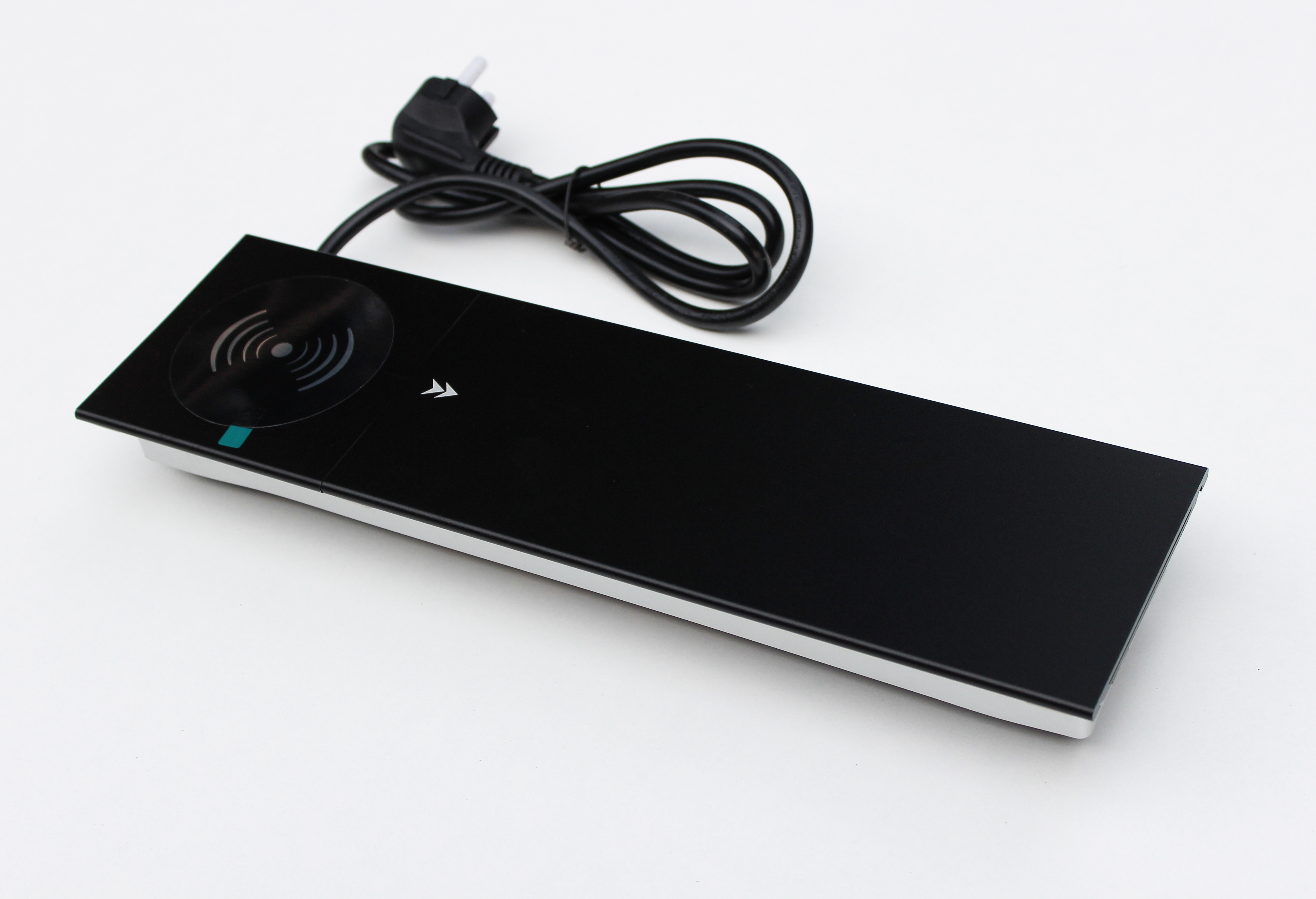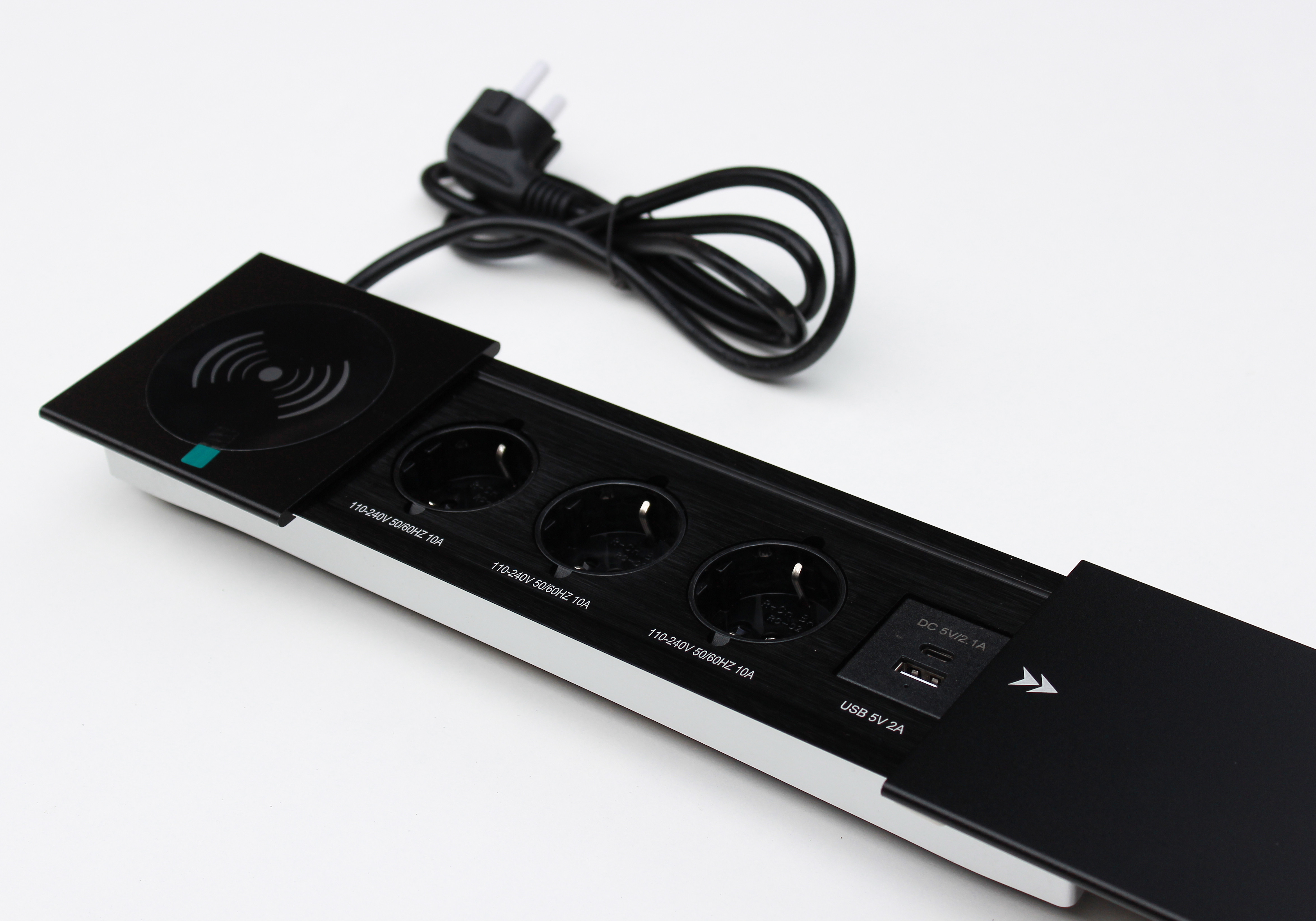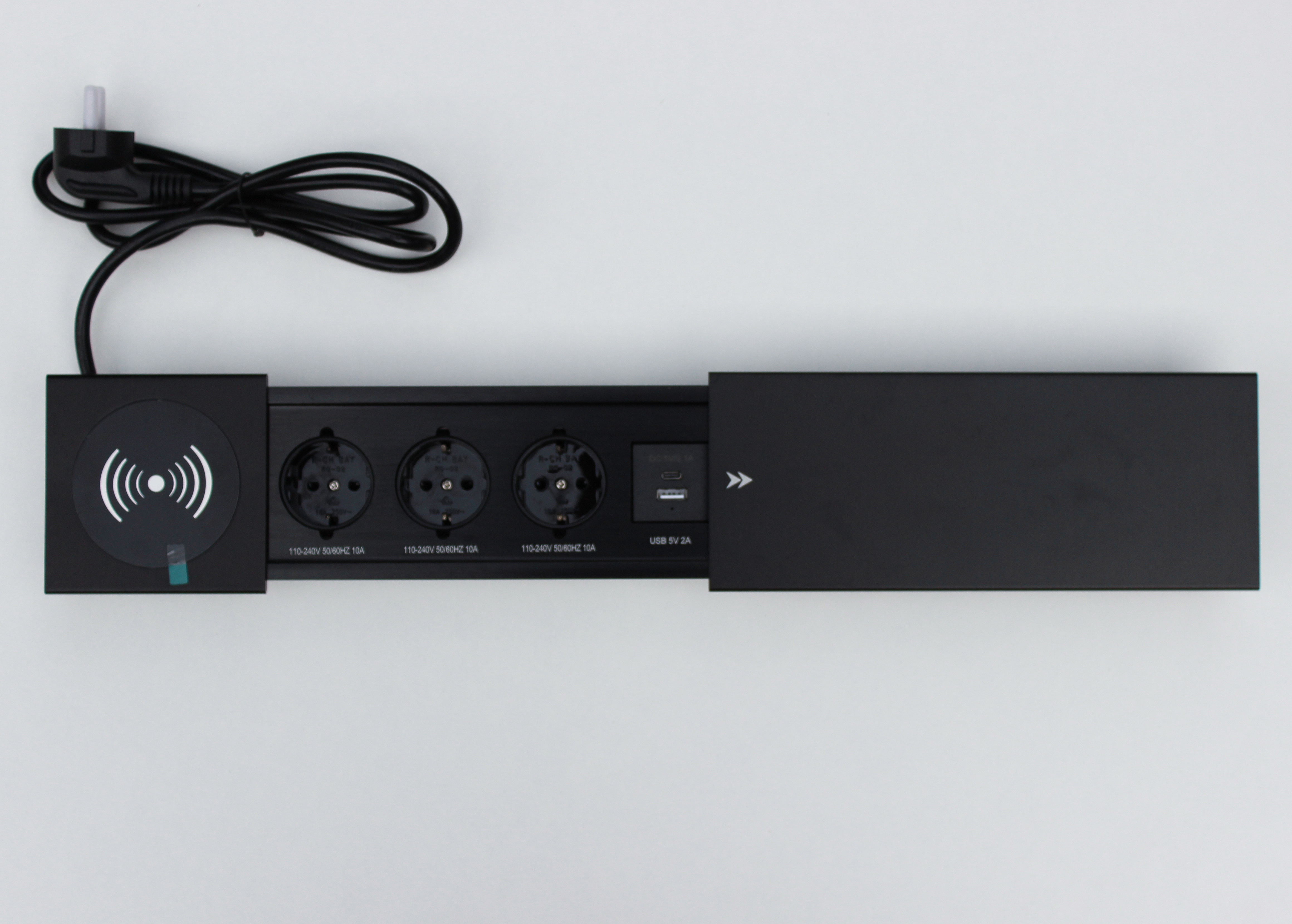 Настільна розетка з бездротовою зарядкою 350x100 призначена для столів для переговорів і звичайних офісних столів. Вона дає змогу вивести на стіл усі необхідні для роботи роз'єми, а також зарядити телефон бездротовою зарядкою, USB дріт виведено, необхідно його під'єднати до комп'ютера або зарядного пристрою. Для USB портів потрібен додатково кабель для під'єднання.