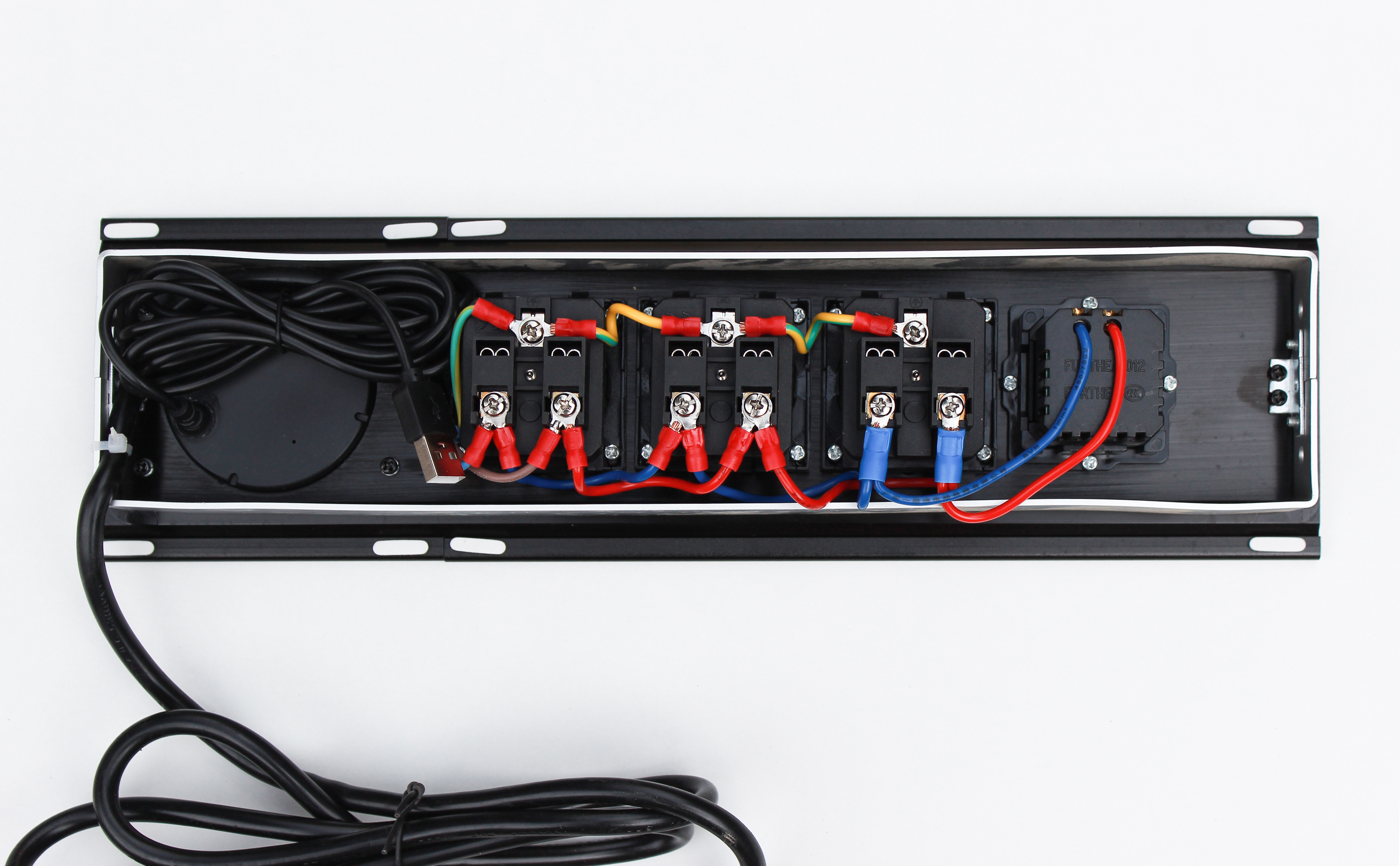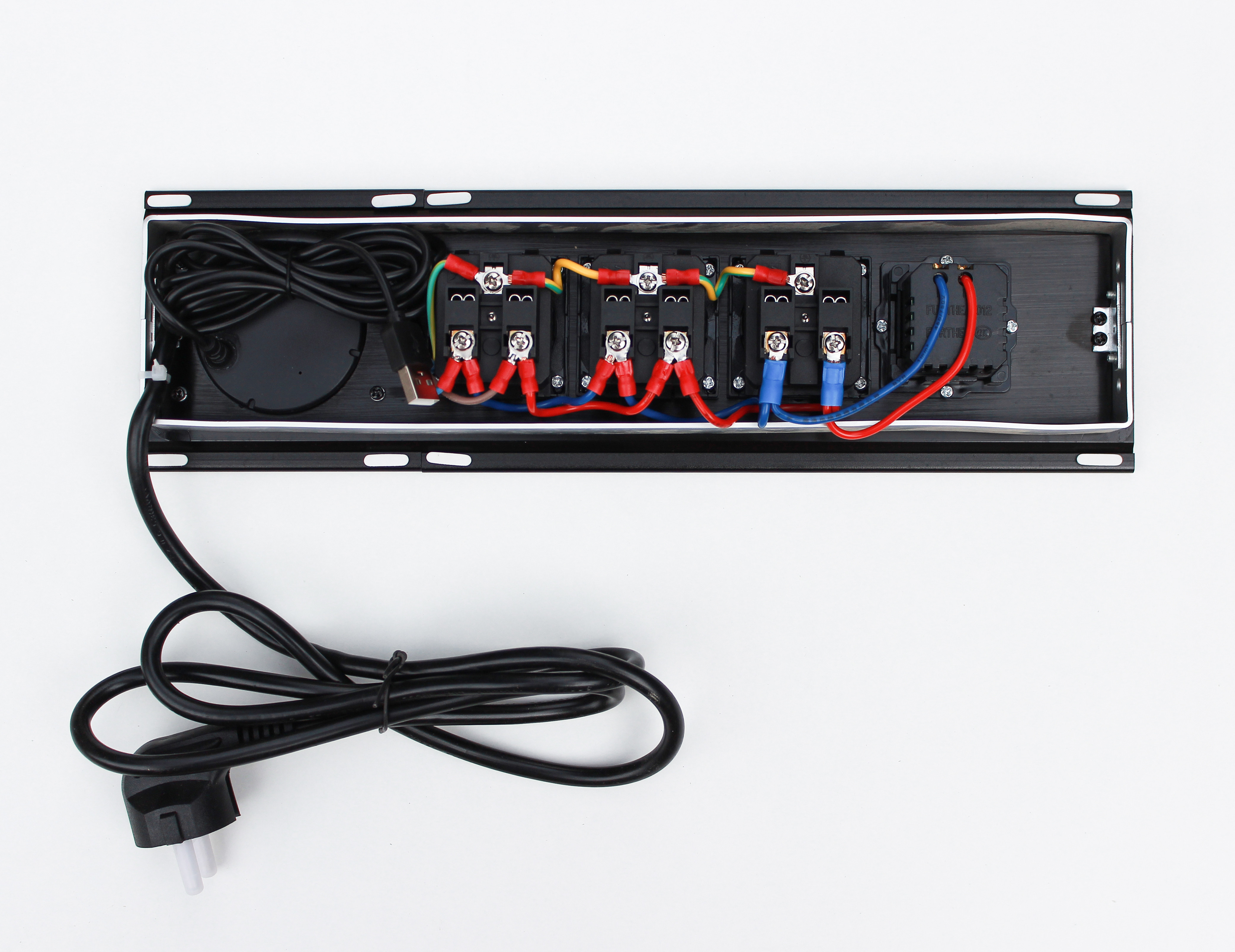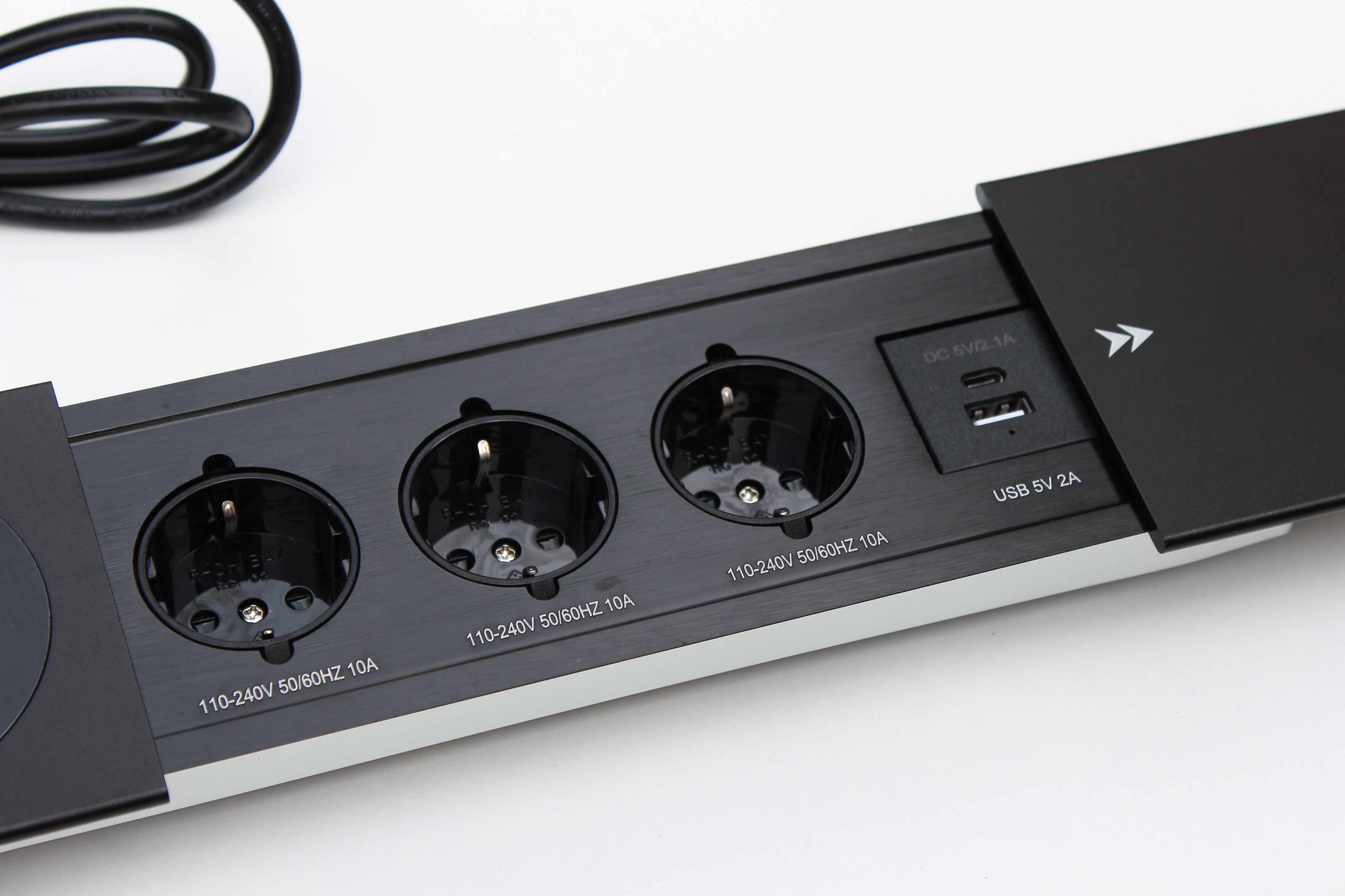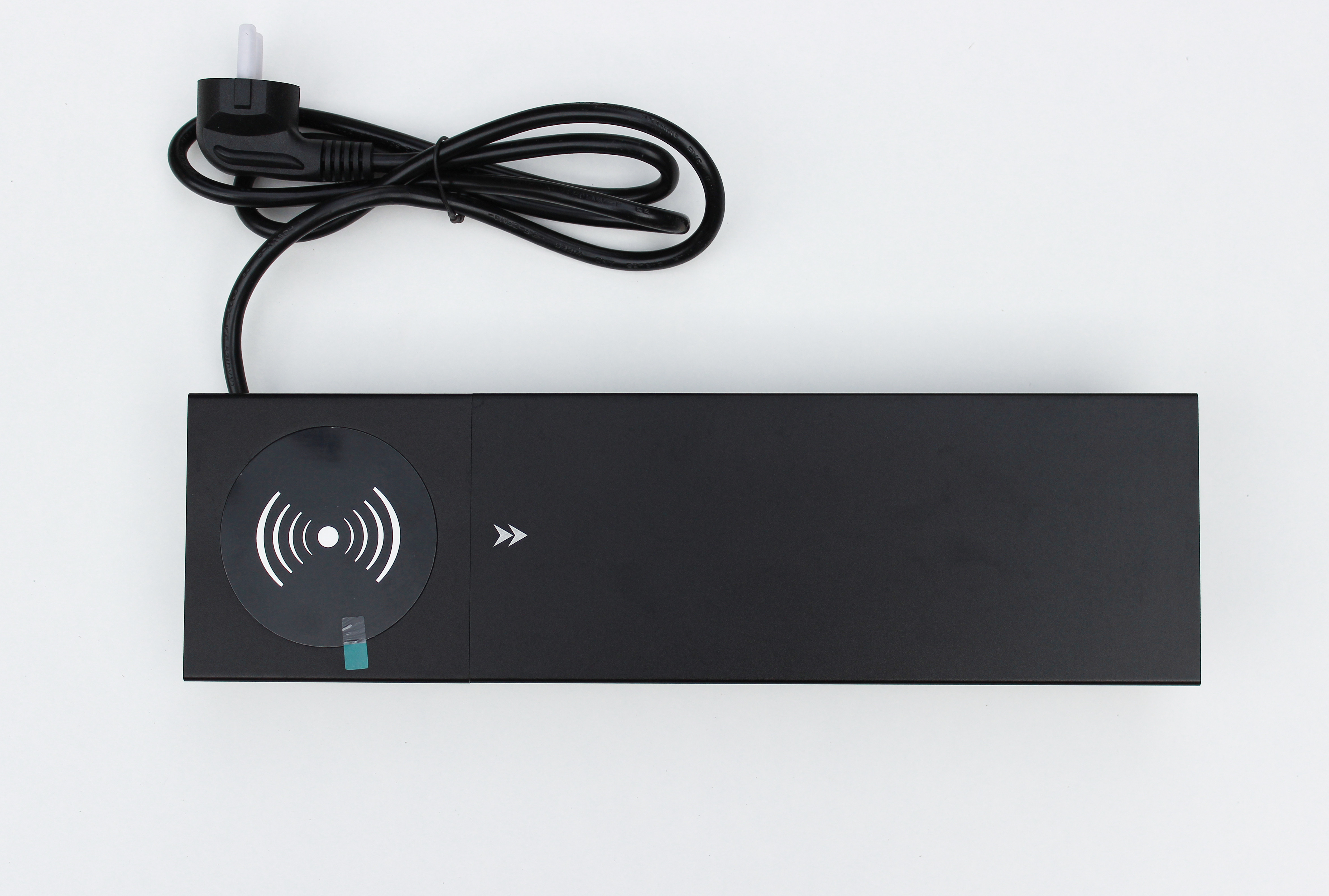Настільна розетка з бездротовою зарядкою 350x100 призначена для столів для переговорів і звичайних офісних столів. Вона дає змогу вивести на стіл усі необхідні для роботи роз'єми, а також зарядити телефон бездротовою зарядкою, USB дріт виведено, необхідно його під'єднати до комп'ютера або зарядного пристрою. Для USB портів потрібен додатково кабель для під'єднання.