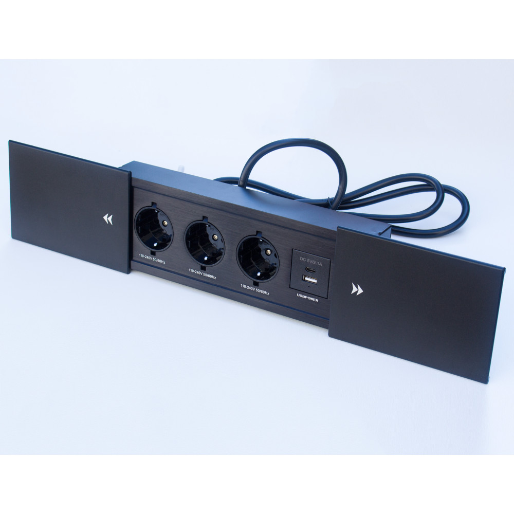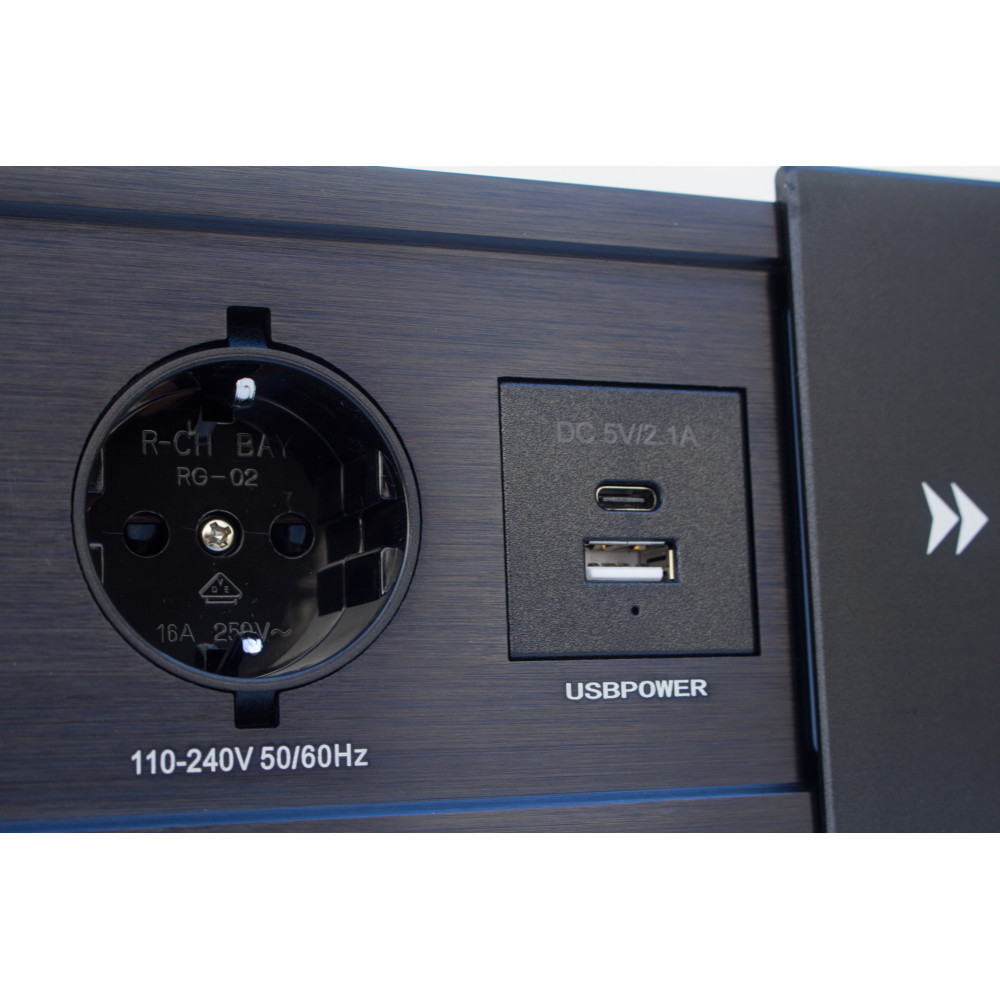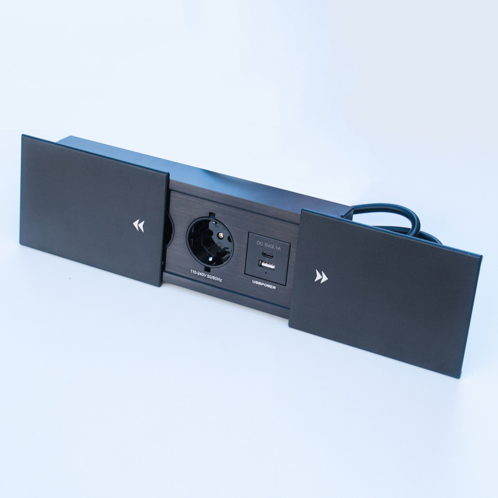 Настільна розетка 280x100 двостороння чорна призначена для столів для переговорів і звичайних офісних столів. Вона дозволяє вивести на стіл роз'єми розетки і порти USB і Type - C для заряджання ваших гаджетів. Настільна розетка оснащена засувками, які розкриваються в дві сторони, якщо потрібний доступ до роз'ємів.