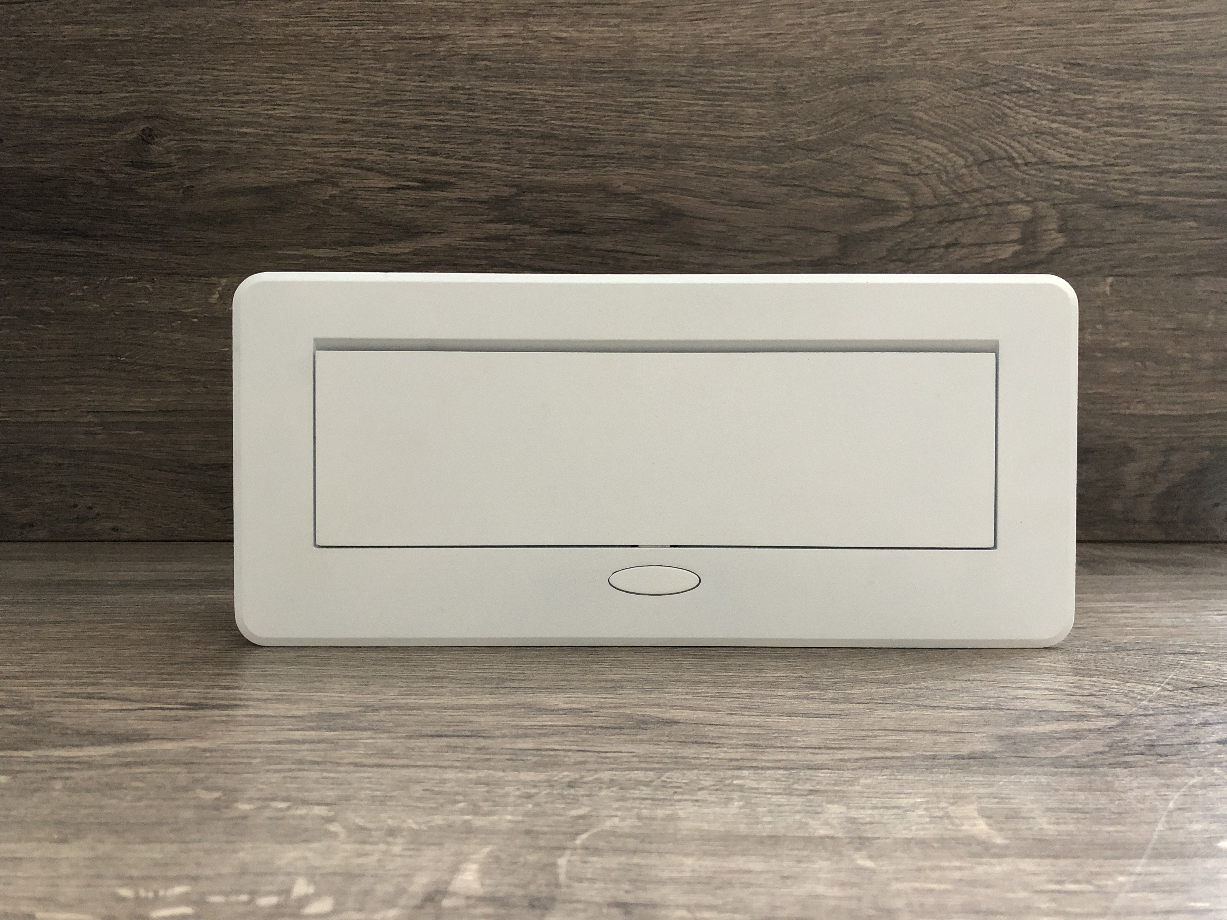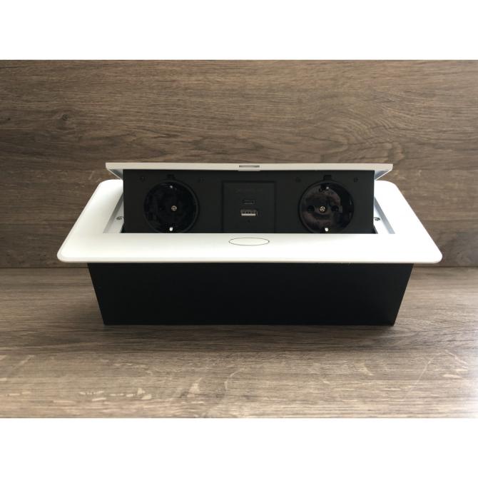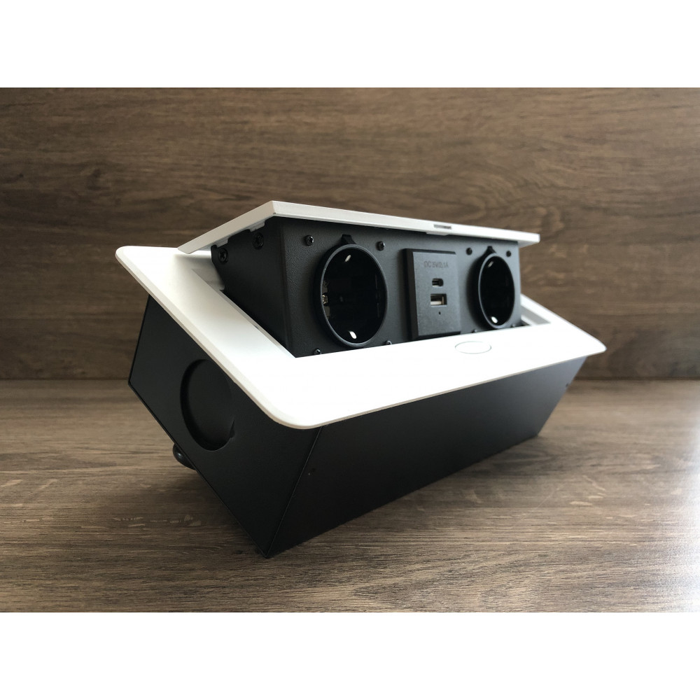 Настільна розетка 2R+USB+Type-C біла призначена для столів для переговорів, звичайних офісних столів та інших поверхонь, де необхідно вивести розетку і зарядку телефону. Блок відкривається натисканням кнопки, після чого розетка плавно відкривається. Це чудове рішення для письмового столу, столу для переговорів або кухні.