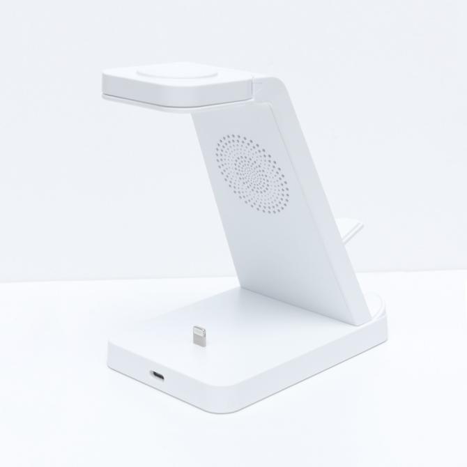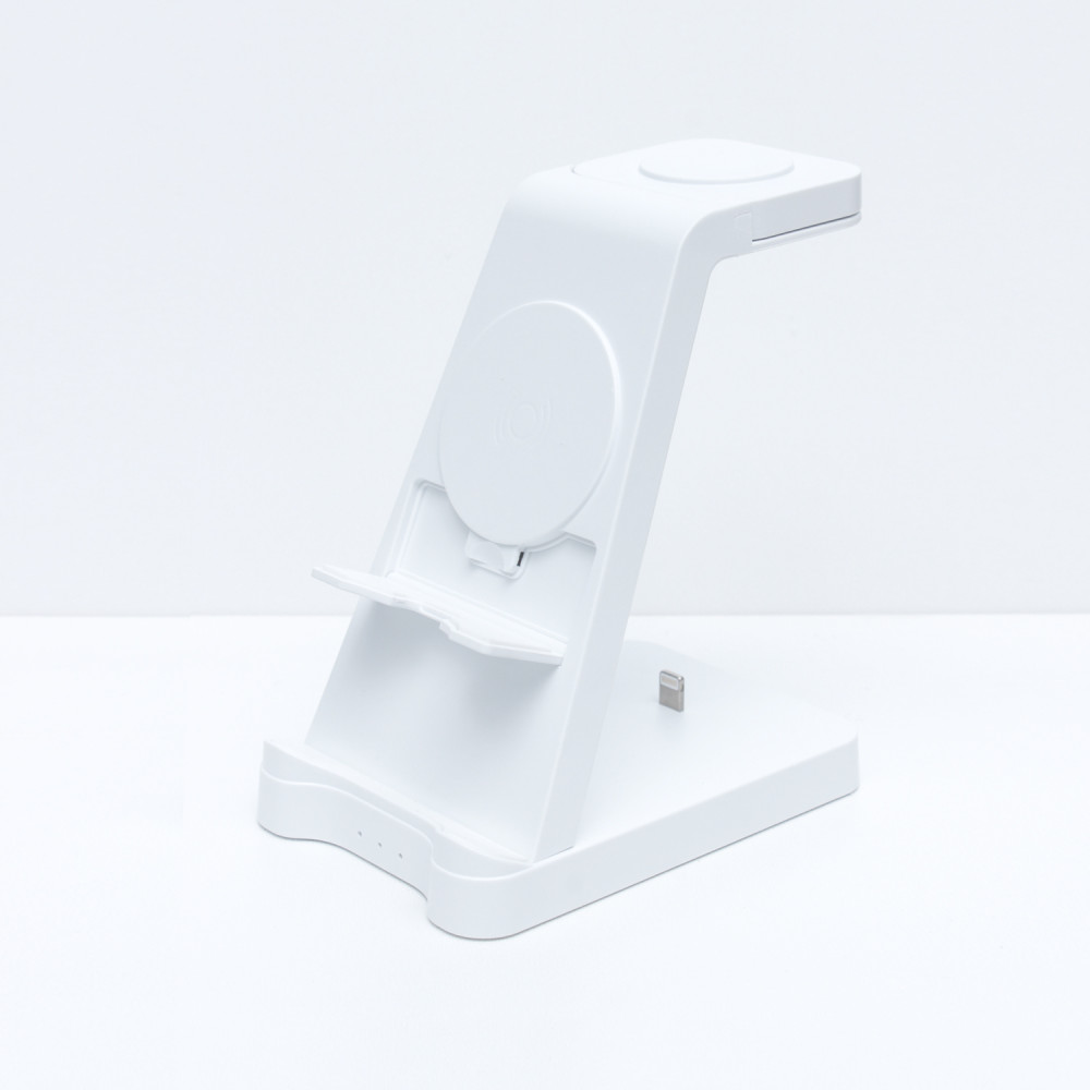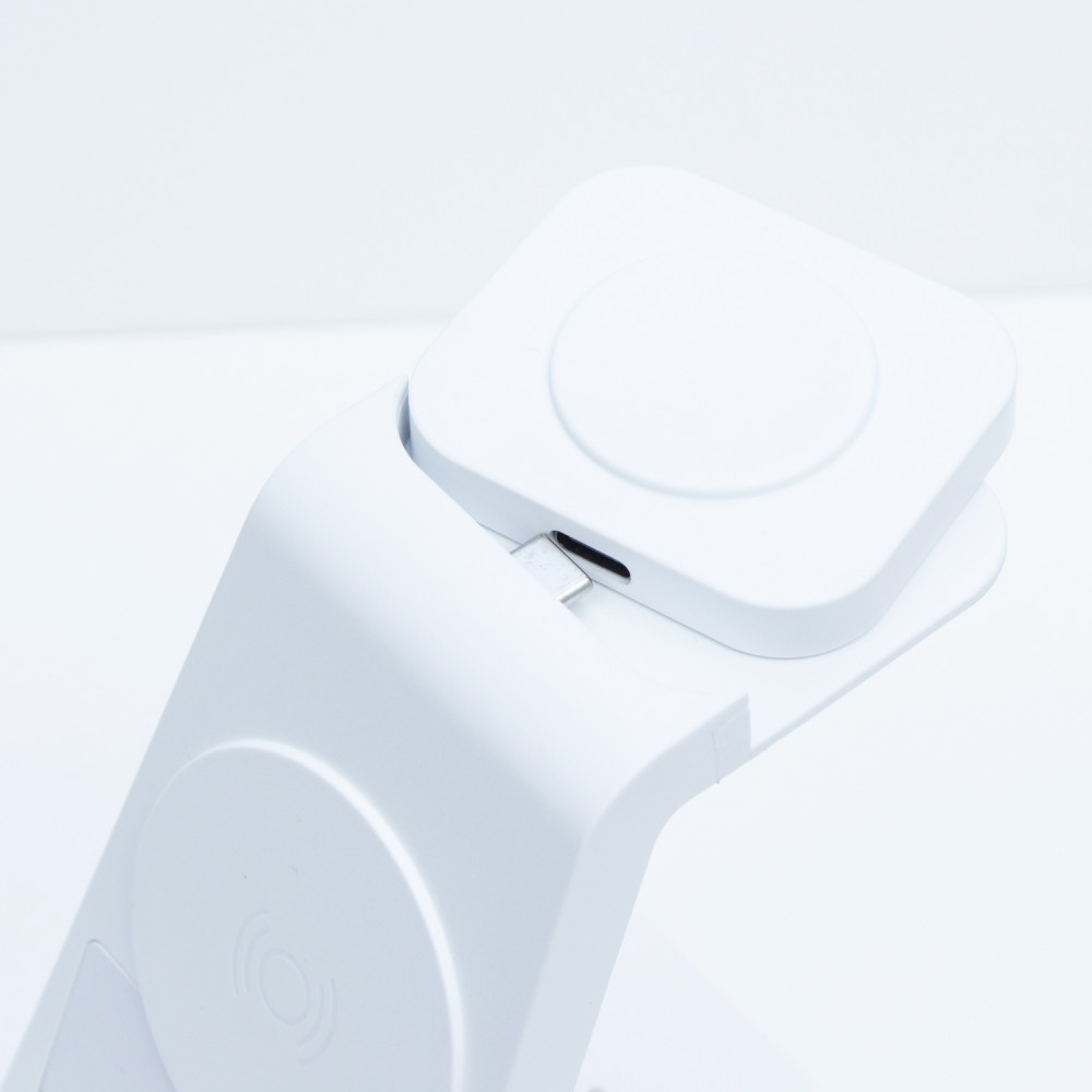 Багатофункціональне рішення для одночасної зарядки трьох пристроїв: смартфона, навушників і смарт-годинника. Підтримує швидке бездротове заряджання, сумісна з iPhone, AirPods, Apple Watch та іншими пристроями з підтримкою Qi.
