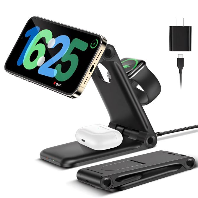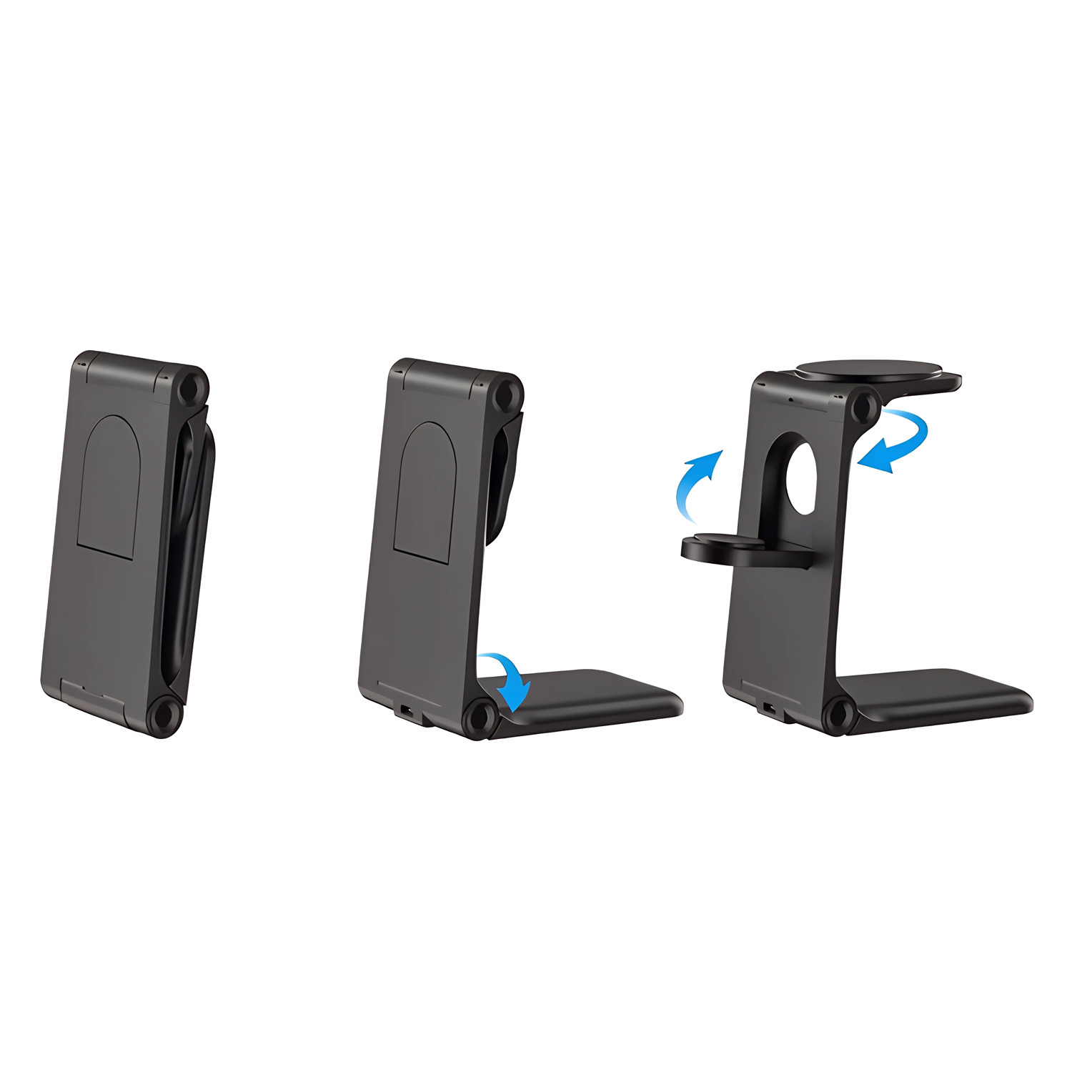 Эта универсальная складная зарядная станция позволяет одновременно заряжать ваш смартфон, смарт-часы и наушники. Заряжайте все сразу быстро и удобно. Идеальное решение для дома, офиса или путешествий.
