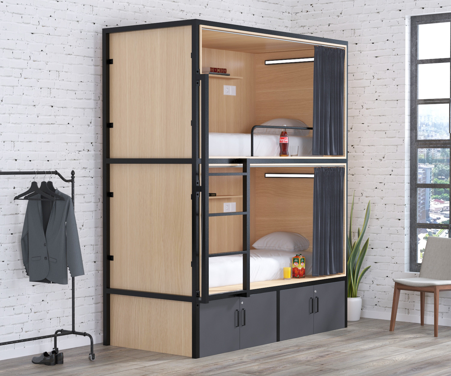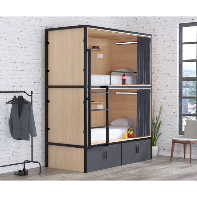 Також на другому ярусі встановлено обмежувач, завдяки якому можна спокійно і безпечно відпочити. Дана модель ліжка може бути з обшивкою з ЛДСП для більш привабливого зовнішнього вигляду. Варіанти забарвлення можуть бути й іншими, залежно від ваших потреб і дизайну інтер'єру. Для комфортнішого і спокійнішого відпочинку спальне місце закривається щільною шторкою з темної тканини, яка захищає від зайвого світла і звуку ззовні. Капсула оснащена вбудованою розеткою, світильником біля узголів'я і поличкою для особистого приладдя.