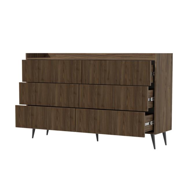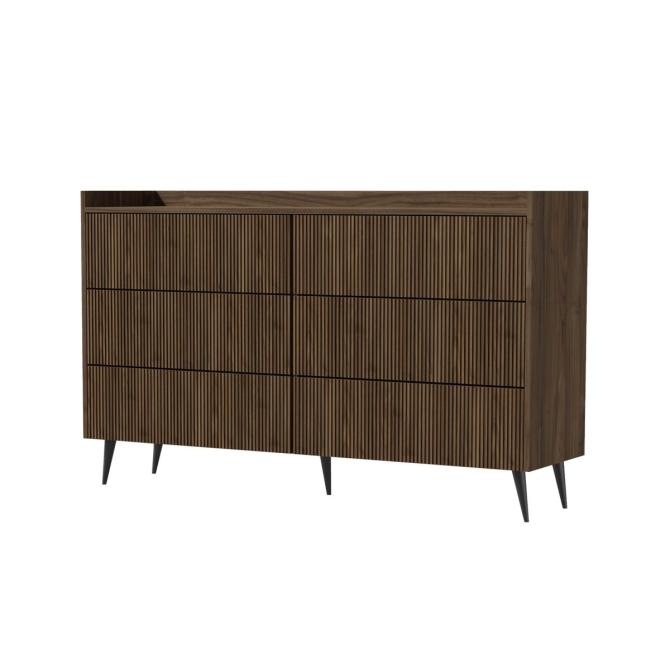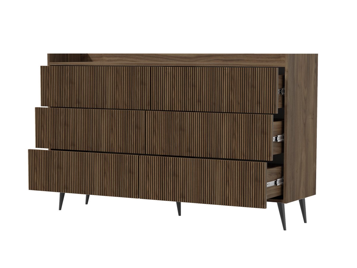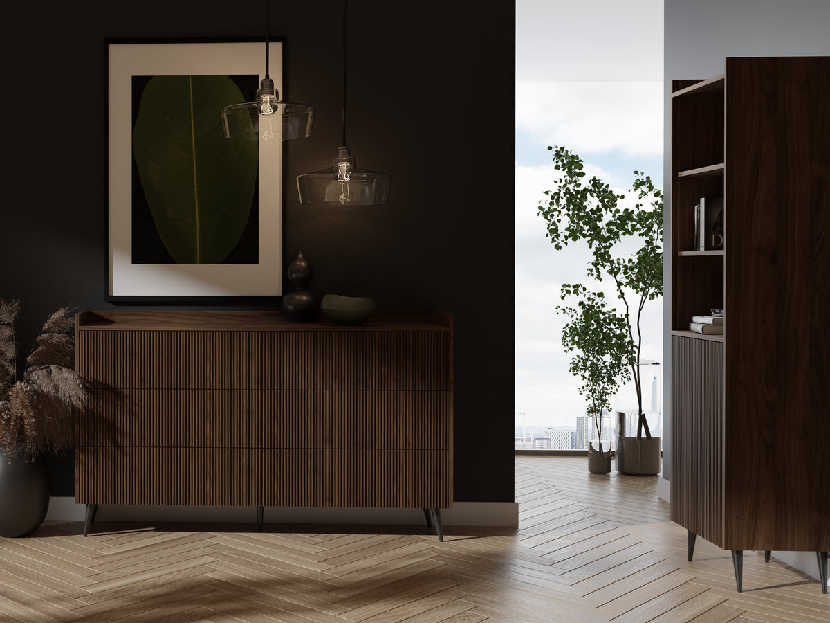 Меблі з рифленими фасадами - один з найгарячіших трендів в дизайні інтер'єру. Унікальний зовнішній вигляд і висока практична цінність меблів для вітальні ADEMO відрізняються виразним стилем і оригінальністю. Рифлені фасади в поєднанні з красивим кольором горіхової деревини надають їм стильну глибину.
