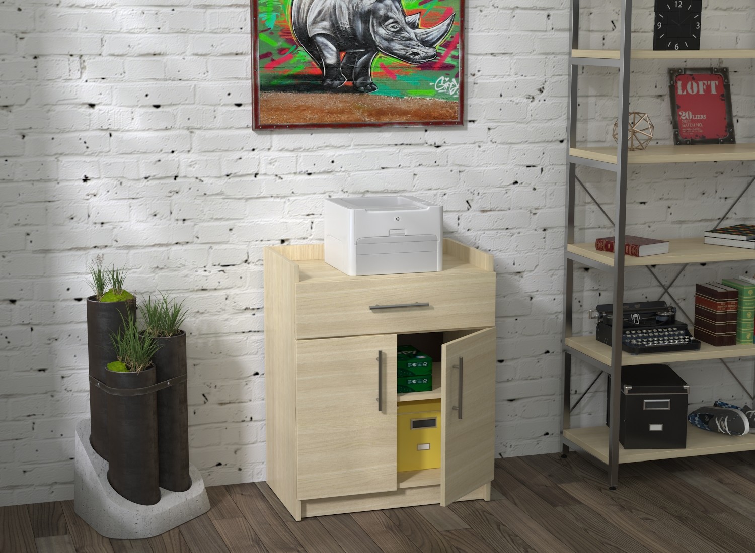 В тумбі має огорожену верхню поверхню для принтера або іншого обладнання, висувний ящик на всю ширину тумби та відділення, закрите двома дверцятами. Всередині відділення присутня поличка, що дозволяє розділити внутрішній простір тумби на дві зони.