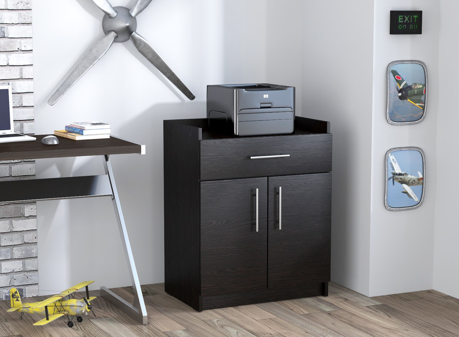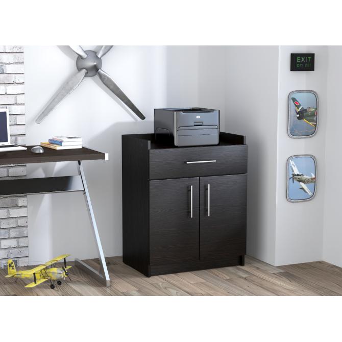 В тумбі має огорожену верхню поверхню для принтера або іншого обладнання, висувний ящик на всю ширину тумби та відділення, закрите двома дверцятами. Всередині відділення присутня поличка, що дозволяє розділити внутрішній простір тумби на дві зони.