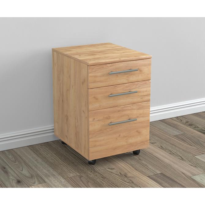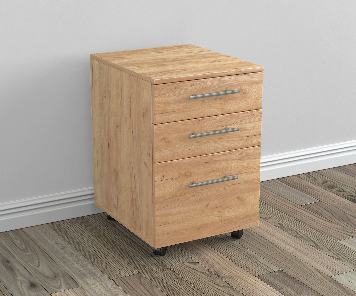 Тумбу виконано з преміального ЛДСП серії One World товщиною 18 мм. На робочих поверхнях використовується кромка ПВХ товщиною 2мм. Мобільна тумба має три висувних ящика. Один великий та два трохи менші. Ящики висуваються на телескопічні напрямні. Для зручності мобільна тумба оснащена коліщатками. Скриньки оснащені металевими рейлінговими ручками. Тумба виглядає дуже стильно і сучасно. Завдяки підбору кращого ДСП в цікавих забарвленнях ця мобільна тумба вигідно виділяється з ряду офісних меблів. Частіш за все цю Модель беруть разом з письмовим столом L2p, або письмовими столами L10 і L15.