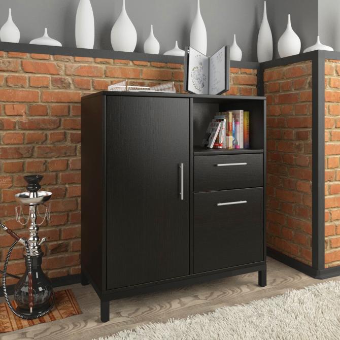 Варіанти висоти розташувань полиць у великому відділенні: 255 мм, 325 мм, 510 мм (вказано відстань від дна до початку полки). Матеріал корпусу – це ламинированное ДСП (ЛДСП) високої якості. Варіанти кольорів у поєднанні з текстурными малюнками дерева надають тумбі витонченого вигляду.