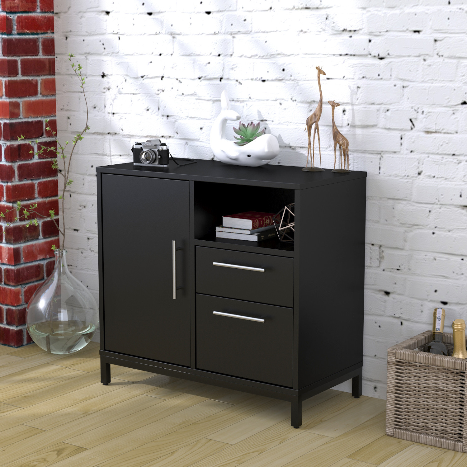 Тумба L-800 combi має різні відділення для зберігання речей: ніша розмірами 370х395х230 мм, малий (315х335х160 мм) і великий (315х335х305 мм) висувні ящики. В висувних ящиках використовуються телескопічні напрямні. Також у виробі присутнє велике відділення з полками, положення яких можна варіювати