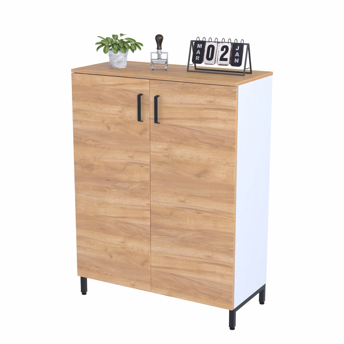 LT-900-1200 біла - це класична висока офісна тумба з двома дверима та трьома полицями всередині. Однак вона має деякі відмінні риси, які виділяють її серед аналогів. Це металеві опори, які надають зовні легкість і незвичайність, а також двоколірне забарвлення, що робить акцент на красивих фасадах і водночас відводить погляд від громіздкого каркасу.
