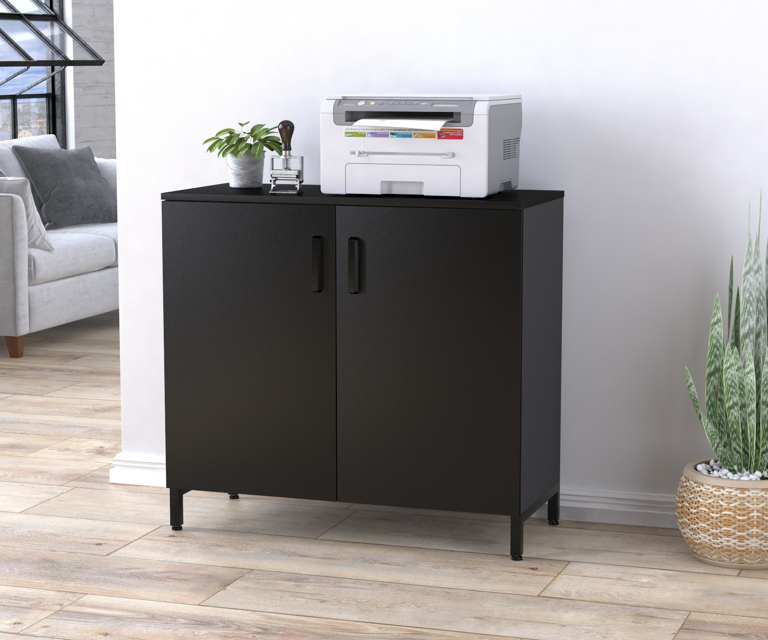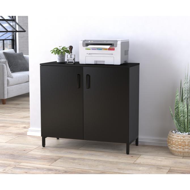 LT-900-830 антрацит - це класична невисока офісна тумба з двома дверима та полицями всередині. Однак вона має деякі відмінні риси, які виділяють її серед аналогів. Це металеві опори, які надають зовні легкість і незвичайність, а також двоколірне забарвлення, що робить акцент на красивих фасадах і водночас відводить погляд від громіздкого каркасу.