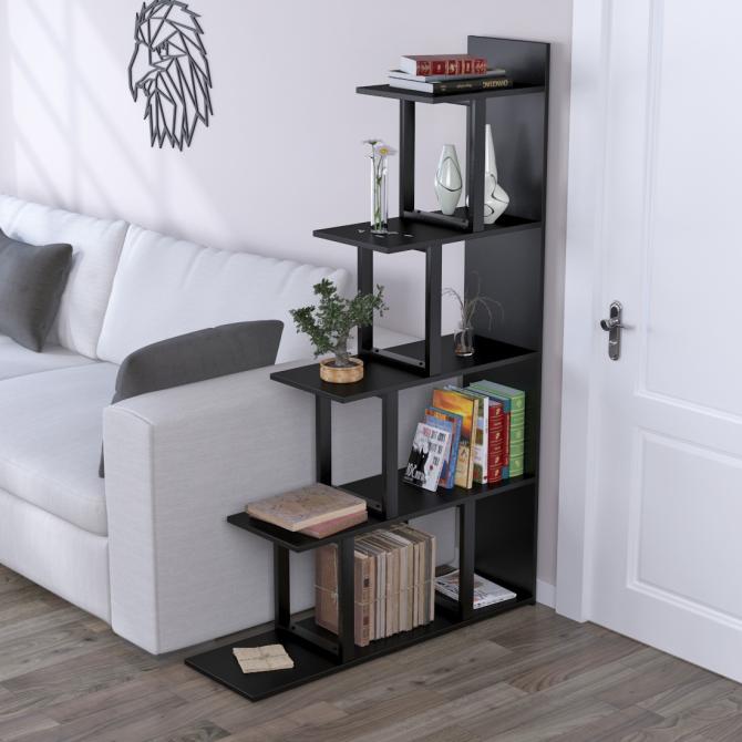 Каркас стелажа виготовлений з хромованого металу, пофарбованого в чорний колір. Стійкий до стирання, механічних пошкоджень і окислення. Ніжки регулюються, тому стелаж легко встановити на нерівній підлозі. Полиці виконані з якісного ЛДСП товщиною 18 мм.