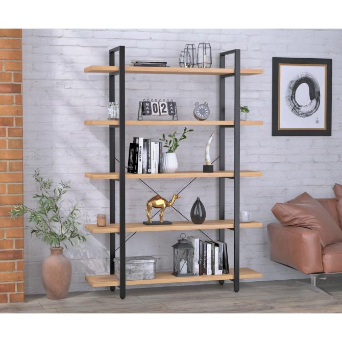 Стелаж Сінгл-5-135 виконаний у класичному скандинавському стилі: масивні полиці із текстурою під дерево поєднуються з металевими опорами чорного кольору. Це збільшена версія стелажу Сінгл-5-120.